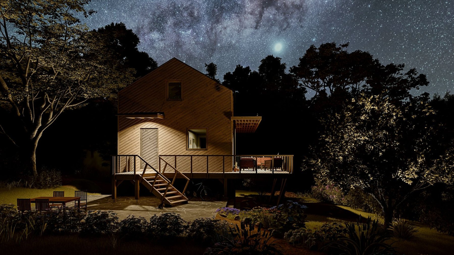 V polozapuštěném suterénu přístupném ze zadní části chaty se nalézá sklad, sklep, dřevník a prostor pro saunu s odpočívárnou. Ve zvýšeném přízemí pak nalezneme zádveří s koupelnou, ložnici a hlavní obytný prostor s kuchyňským koutem a výstupem na terasu. Ta slouží jako další venkovní pokoj. V podkroví je pak další obytný prostor se skoseným stropem.
