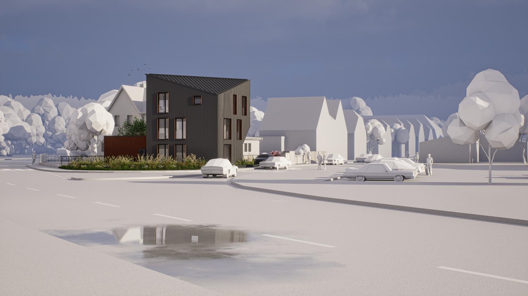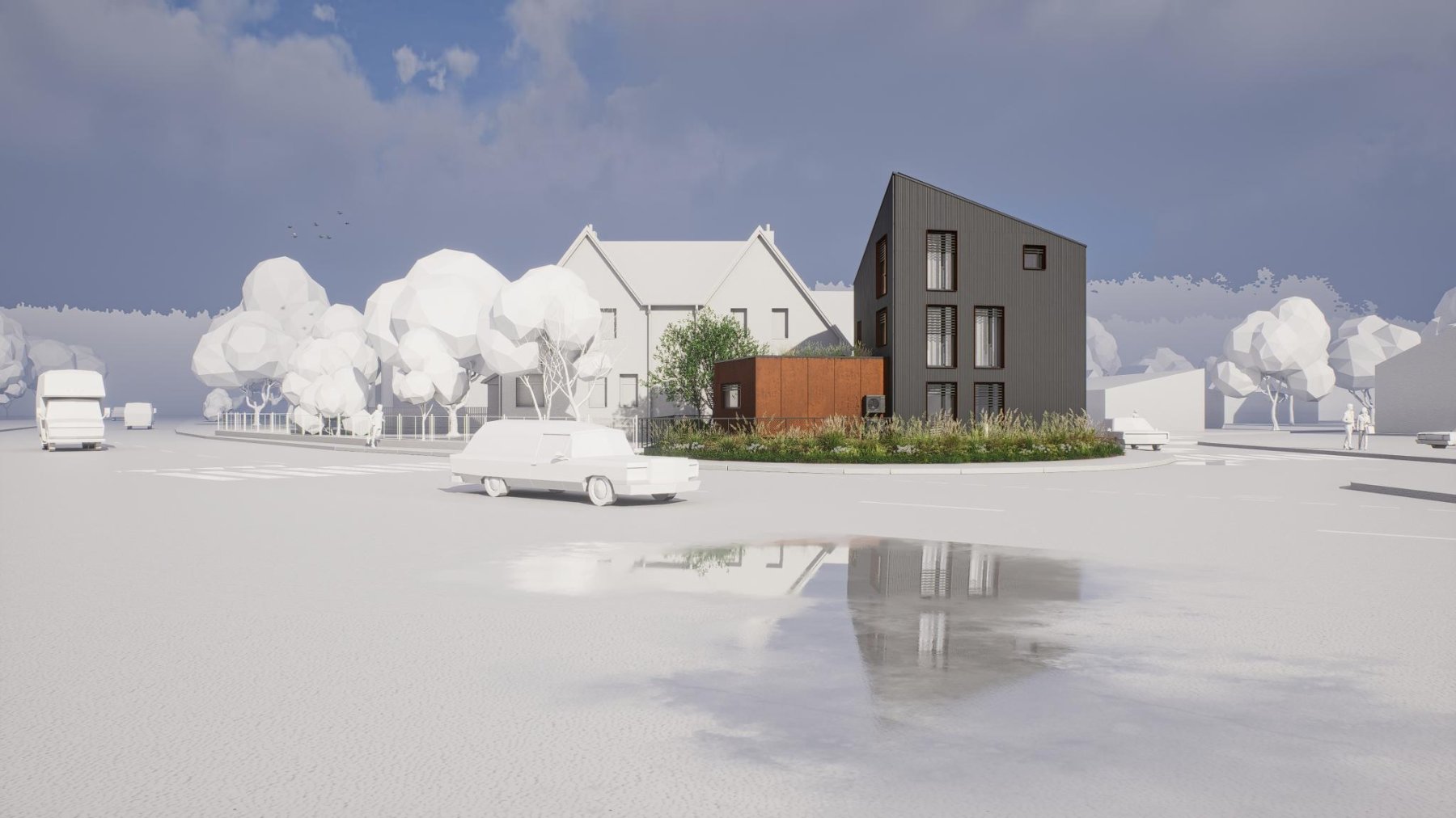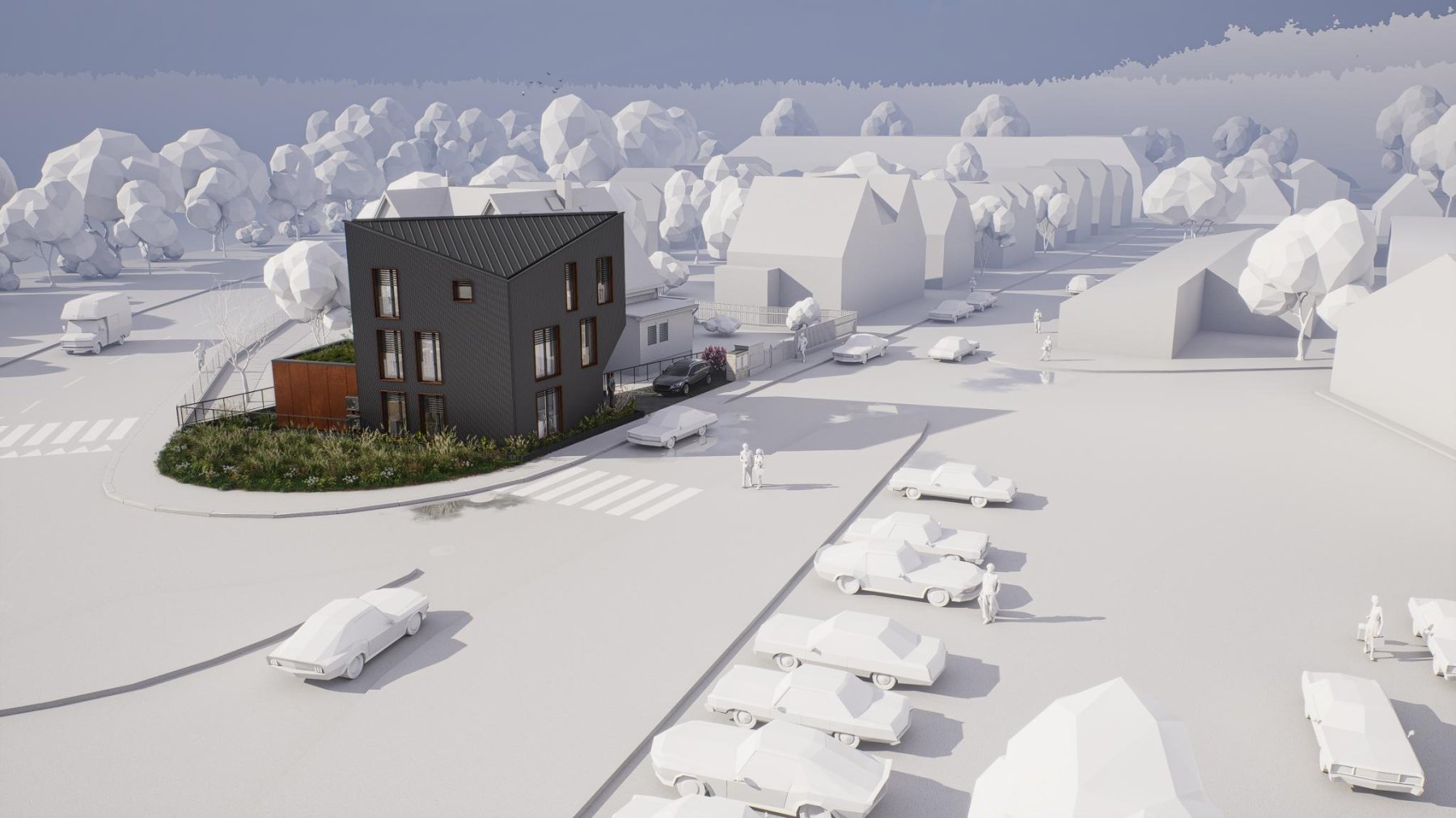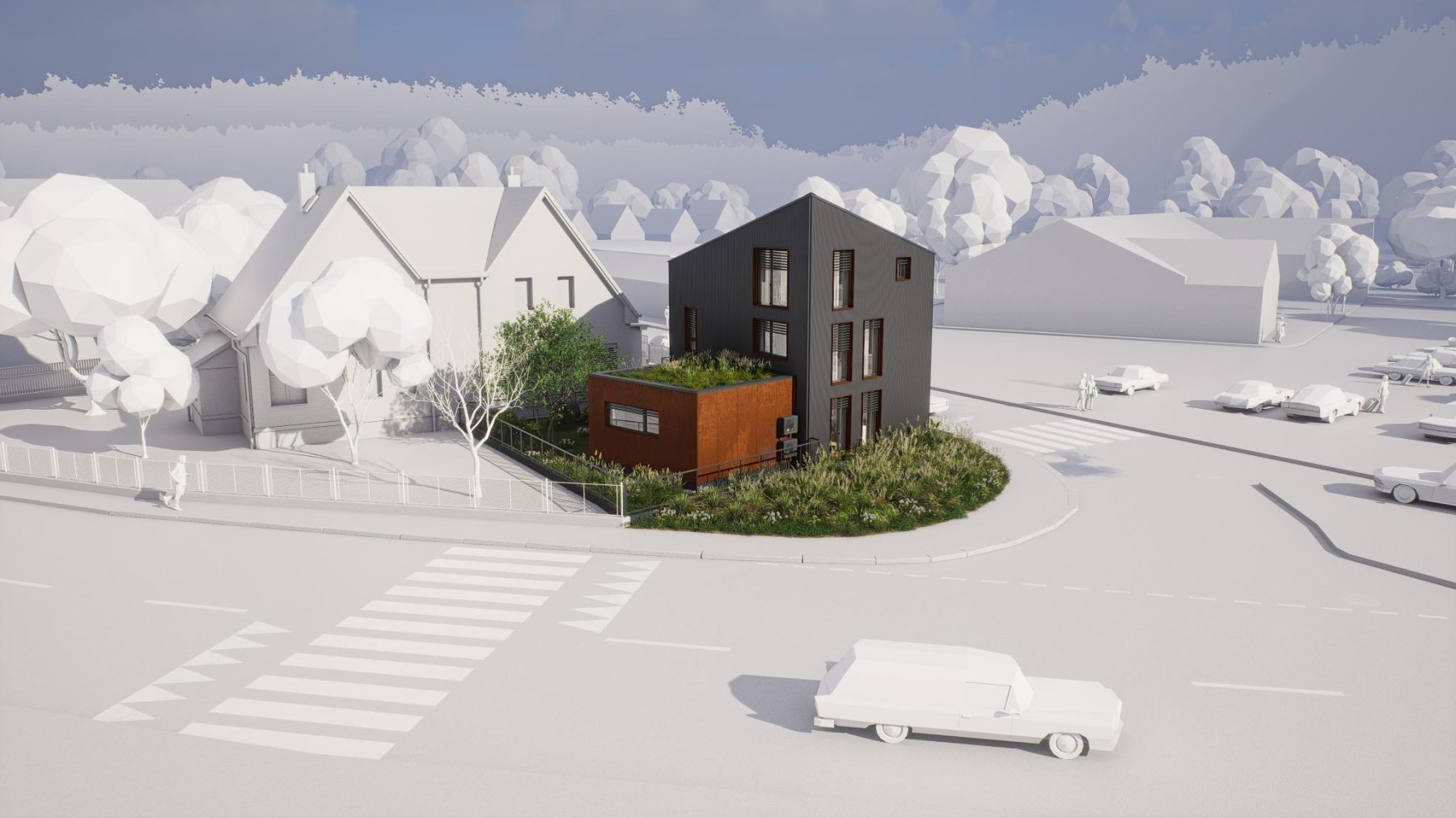 Hmota domu vychází ze specifické polohy a tvaru pozemku. Ten se nachází v zatáčce a má zakulacený tvar. Dům tak stojí na začátku dvou ulic a může sloužit i jako místní dominanta. Zároveň má uliční pohledovou část z více stran. Zvolili jsme proto netradičně pojatou vyšší hlavní hmotu, která je stejně výrazná po celém obvodu. Na ni pak směrem do zahrady navazuje přízemní část sloužící kancelářím, která opticky vyvažuje vertikalitu hlavní budovy.