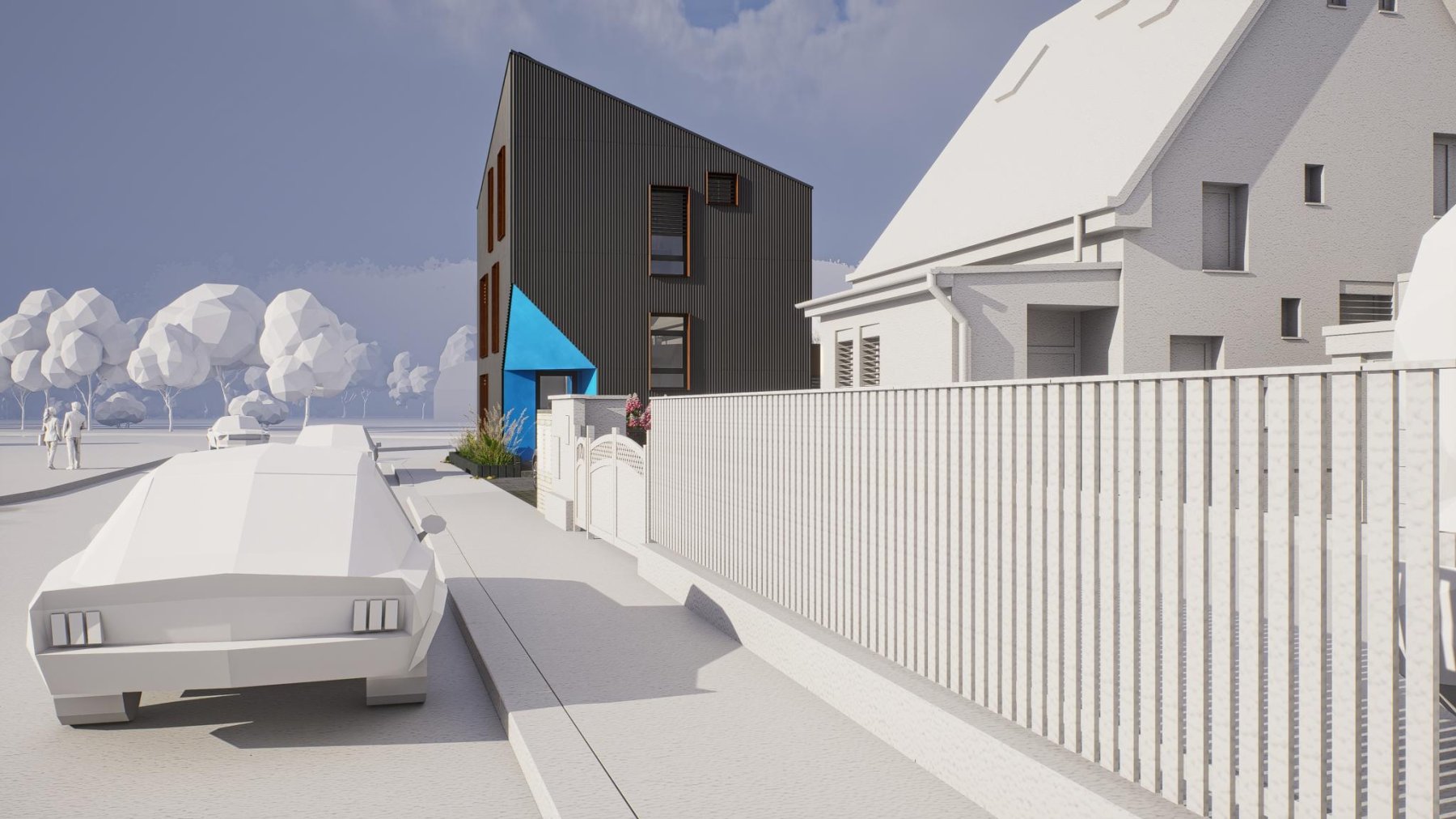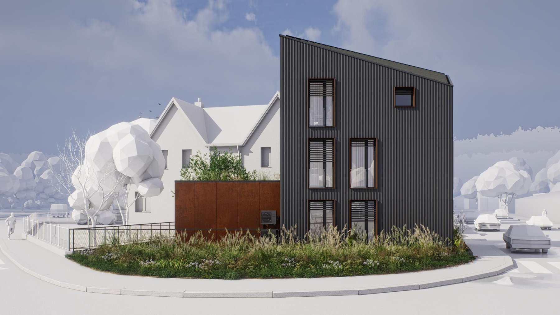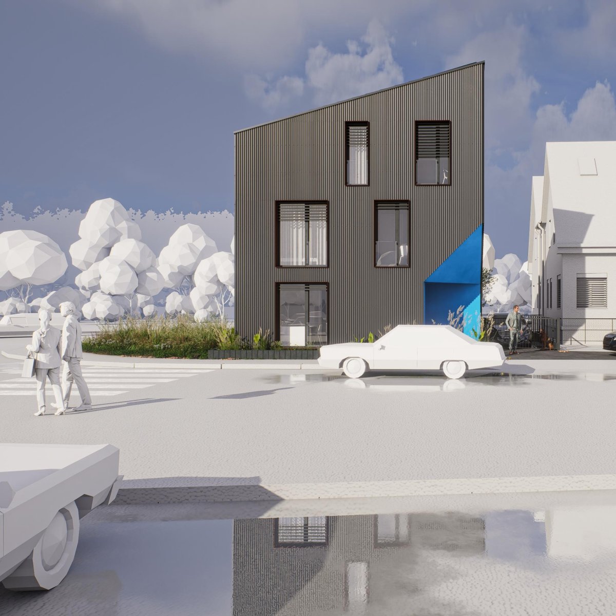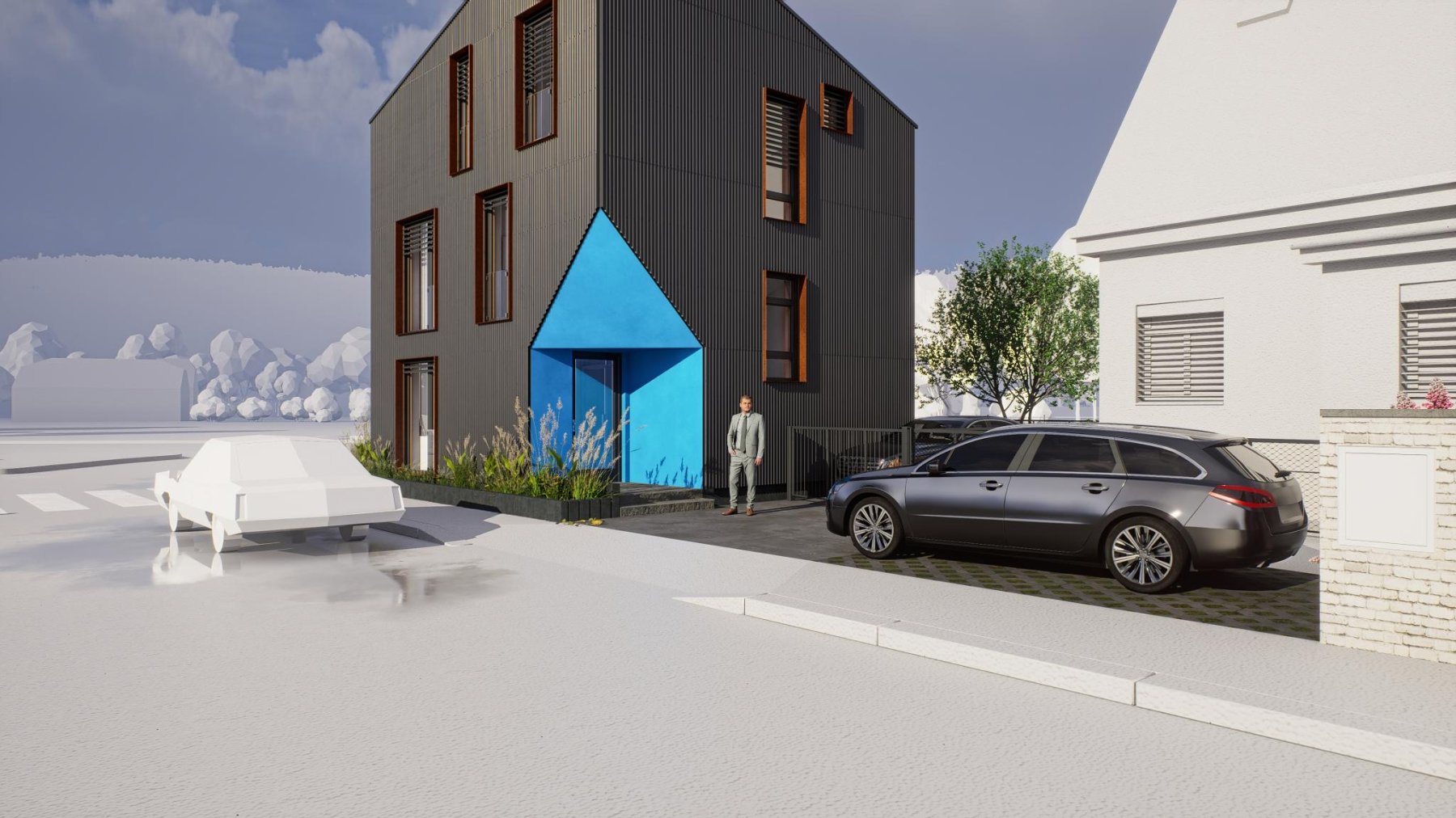 Tento dům měl poskytovat nejen bydlení pro dvě rodiny, ale i prostory určené pro projekční kancelář. Ve spolupráci s renterior.cz tak vznikl návrh obytného domu o třech podlažích. Horní dvě patra slouží jako obytná, v každém je jedna bytová jednotka, a přízemí je využito převážně pro účely kanceláře.