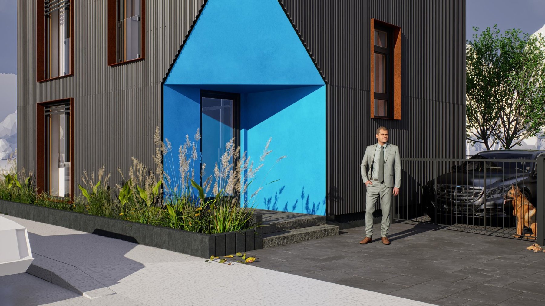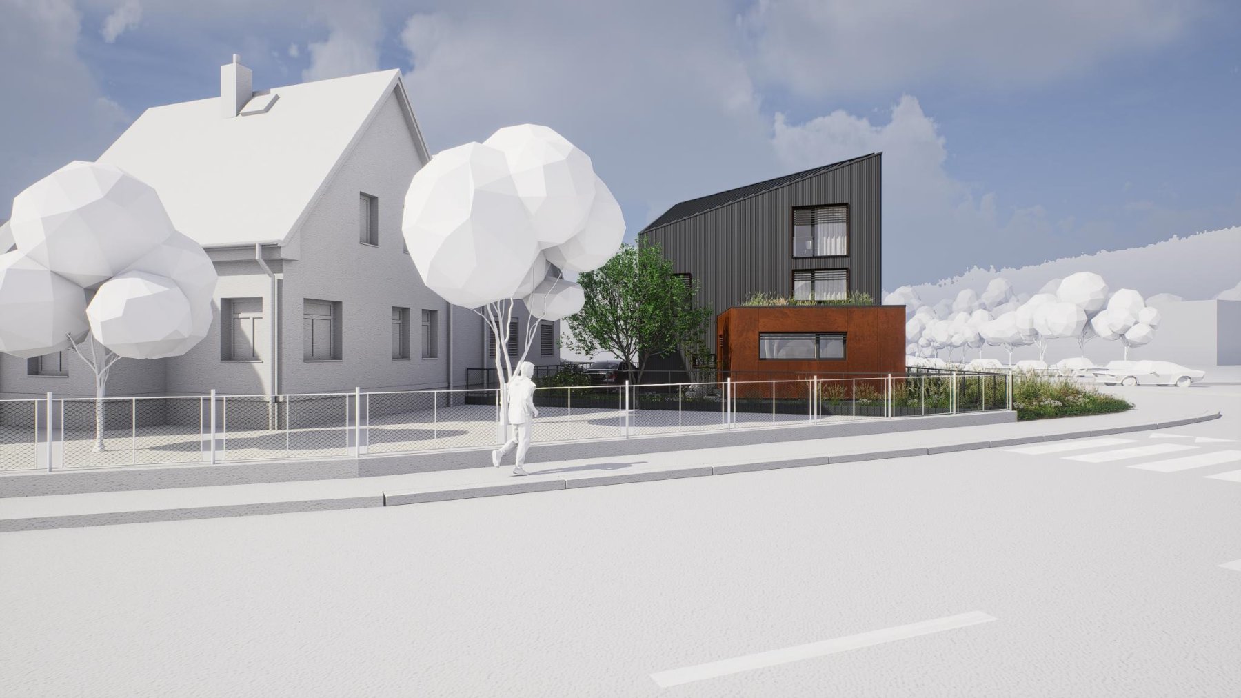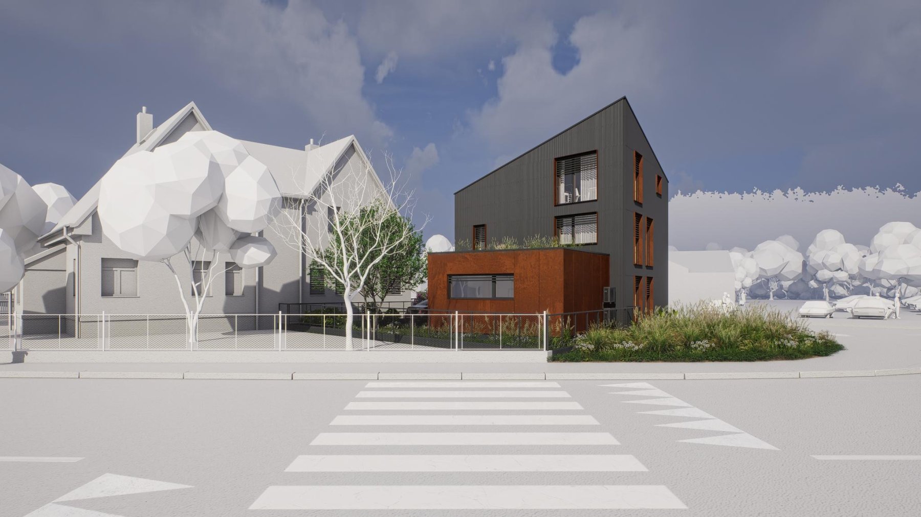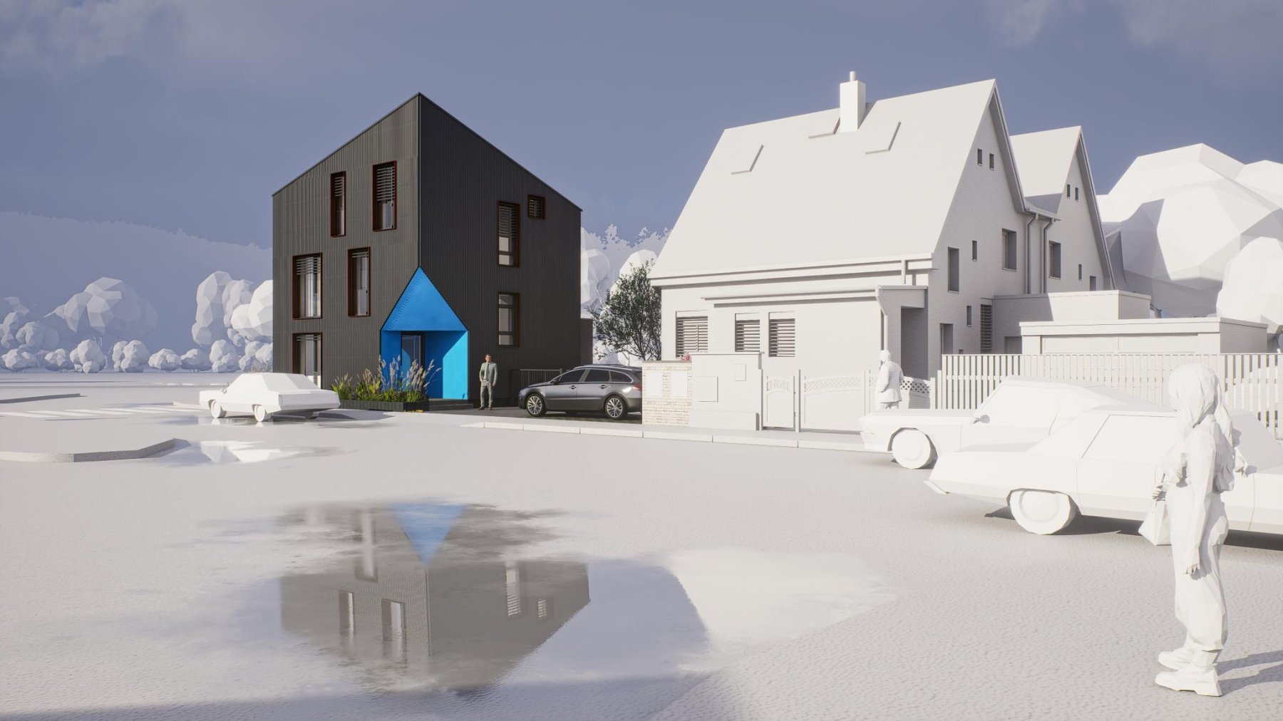 Tento dům měl poskytovat nejen bydlení pro dvě rodiny, ale i prostory určené pro projekční kancelář. Ve spolupráci s renterior.cz tak vznikl návrh obytného domu o třech podlažích. Horní dvě patra slouží jako obytná, v každém je jedna bytová jednotka, a přízemí je využito převážně pro účely kanceláře.