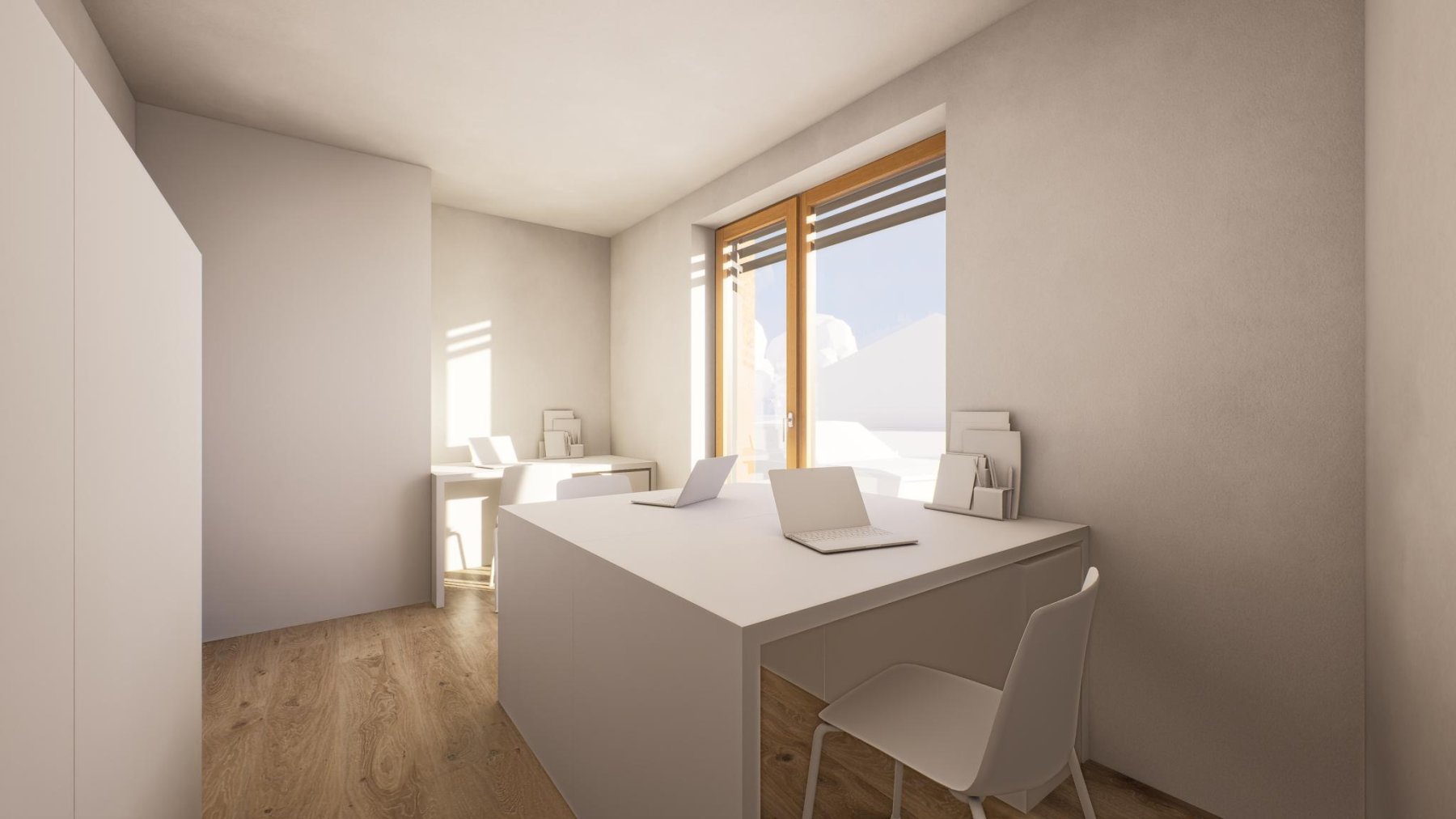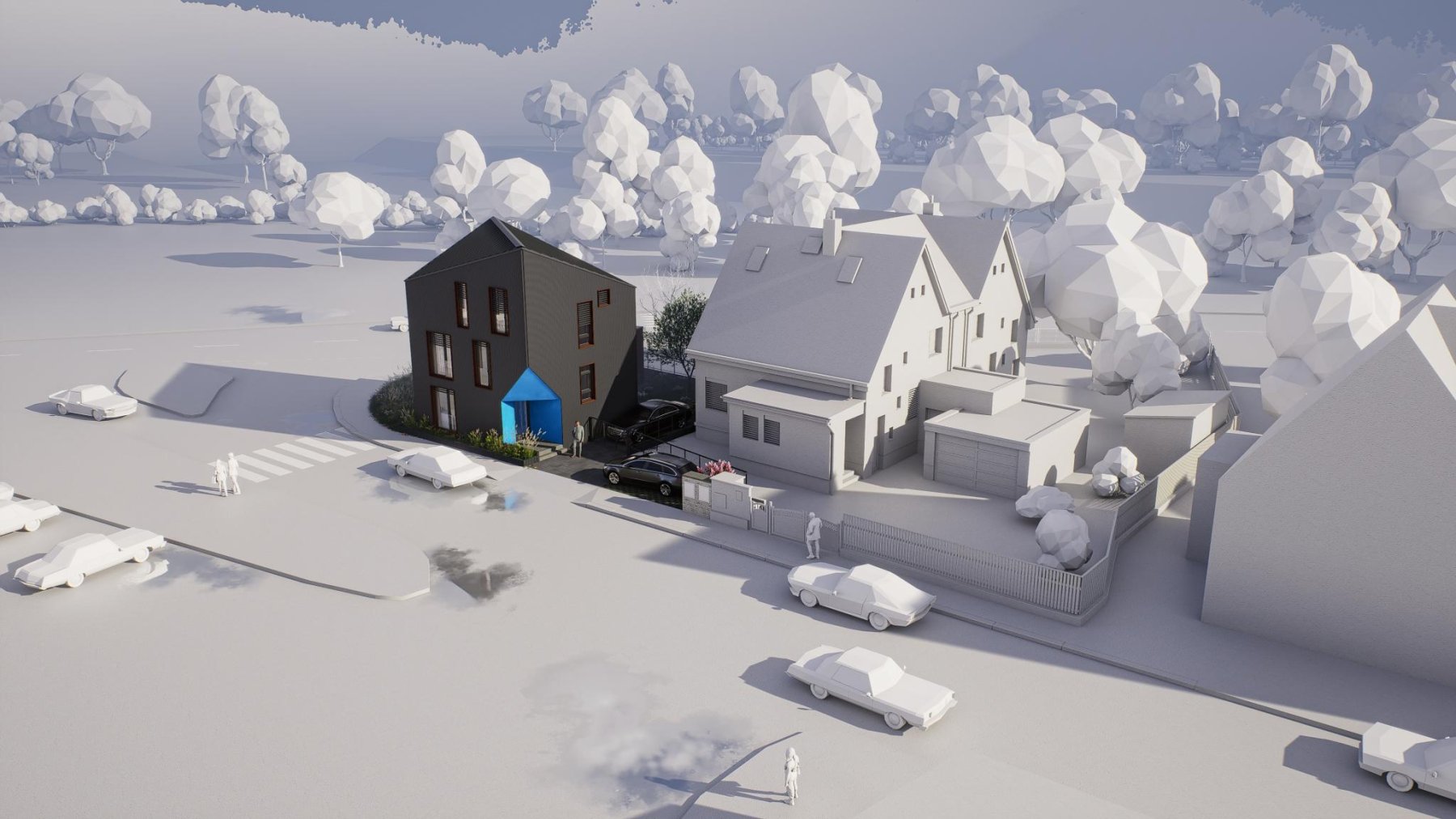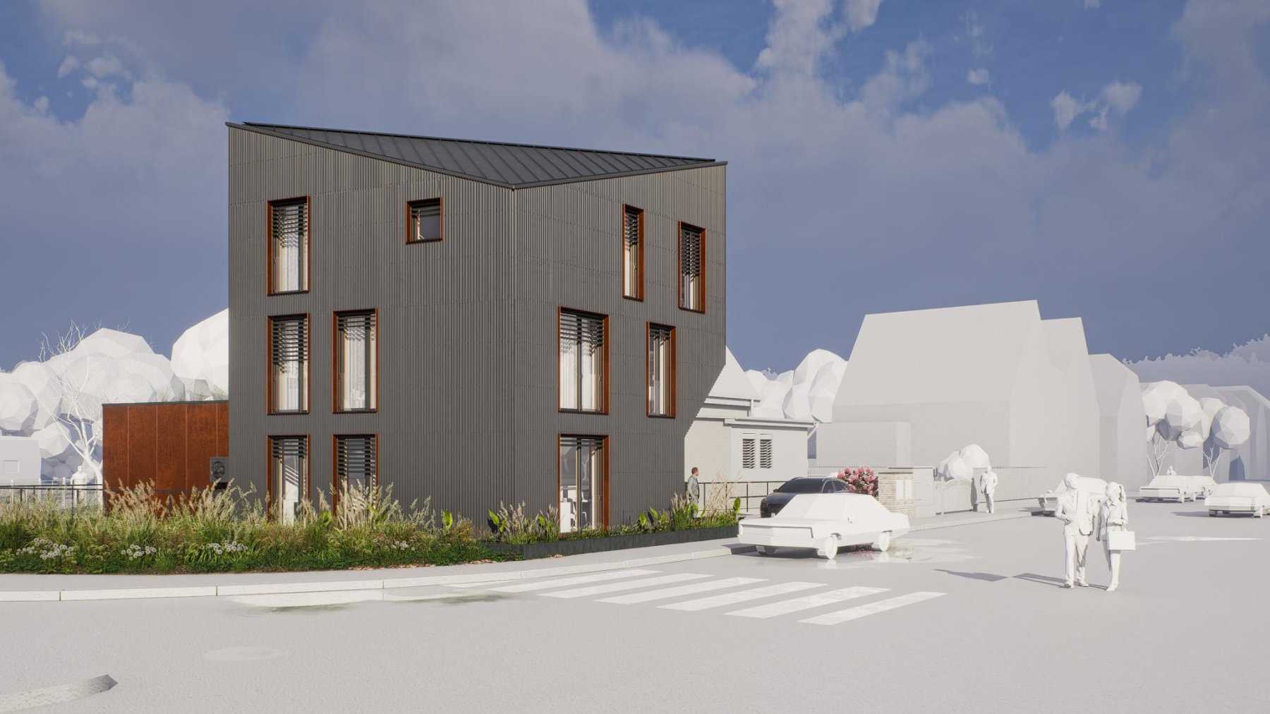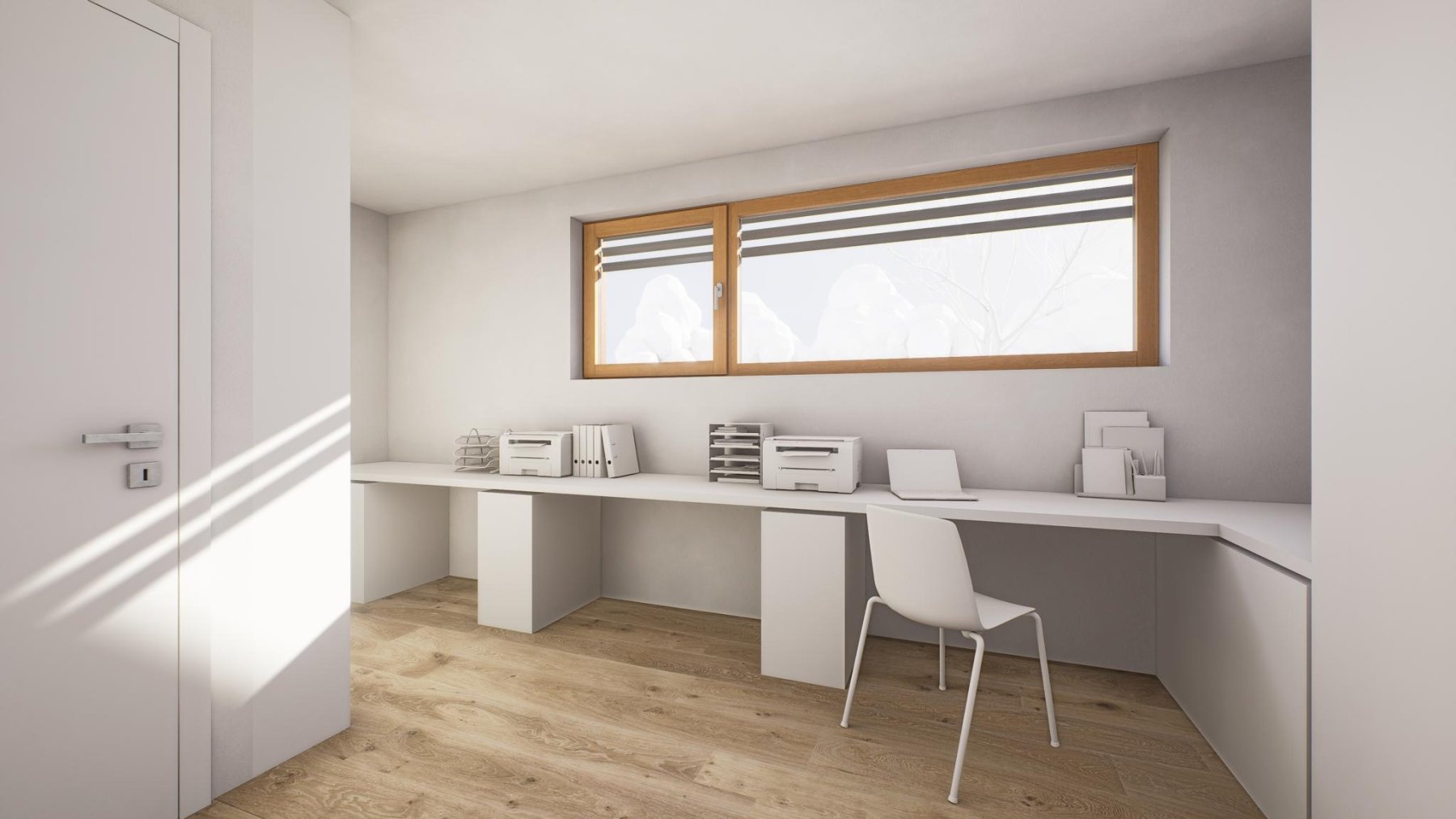 Tento dům měl poskytovat nejen bydlení pro dvě rodiny, ale i prostory určené pro projekční kancelář. Ve spolupráci s renterior.cz tak vznikl návrh obytného domu o třech podlažích. Horní dvě patra slouží jako obytná, v každém je jedna bytová jednotka, a přízemí je využito převážně pro účely kanceláře.