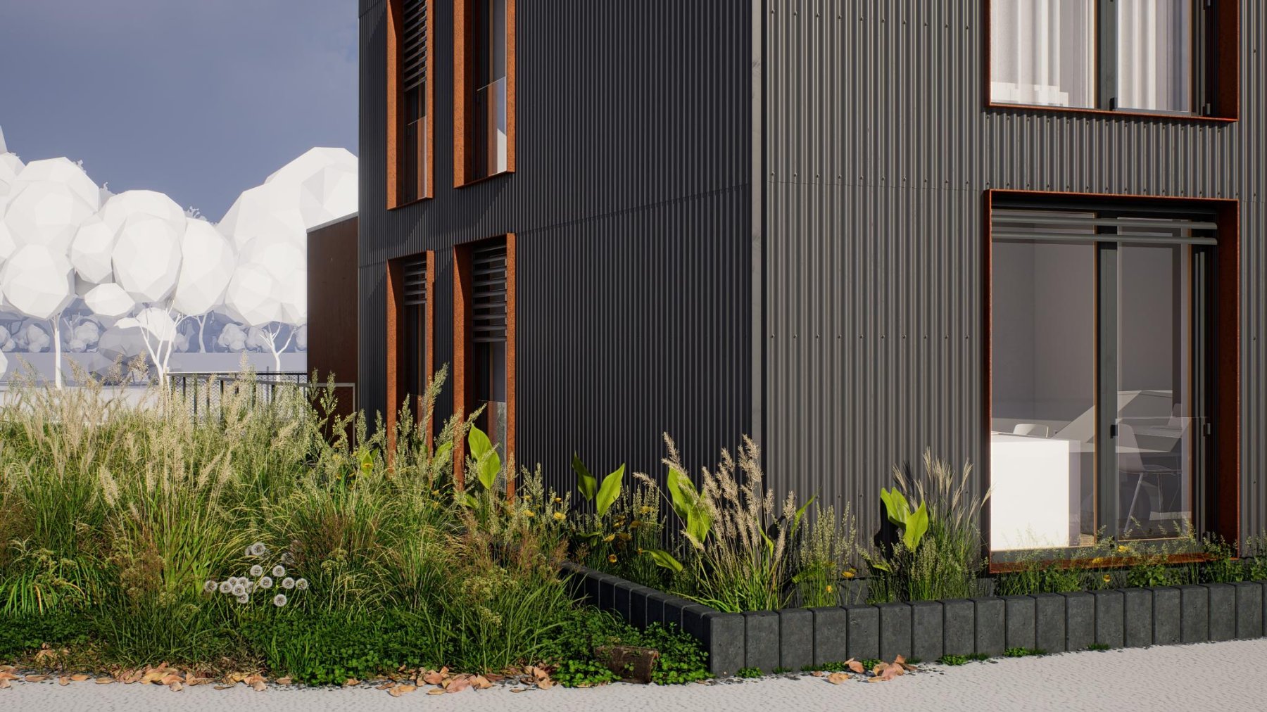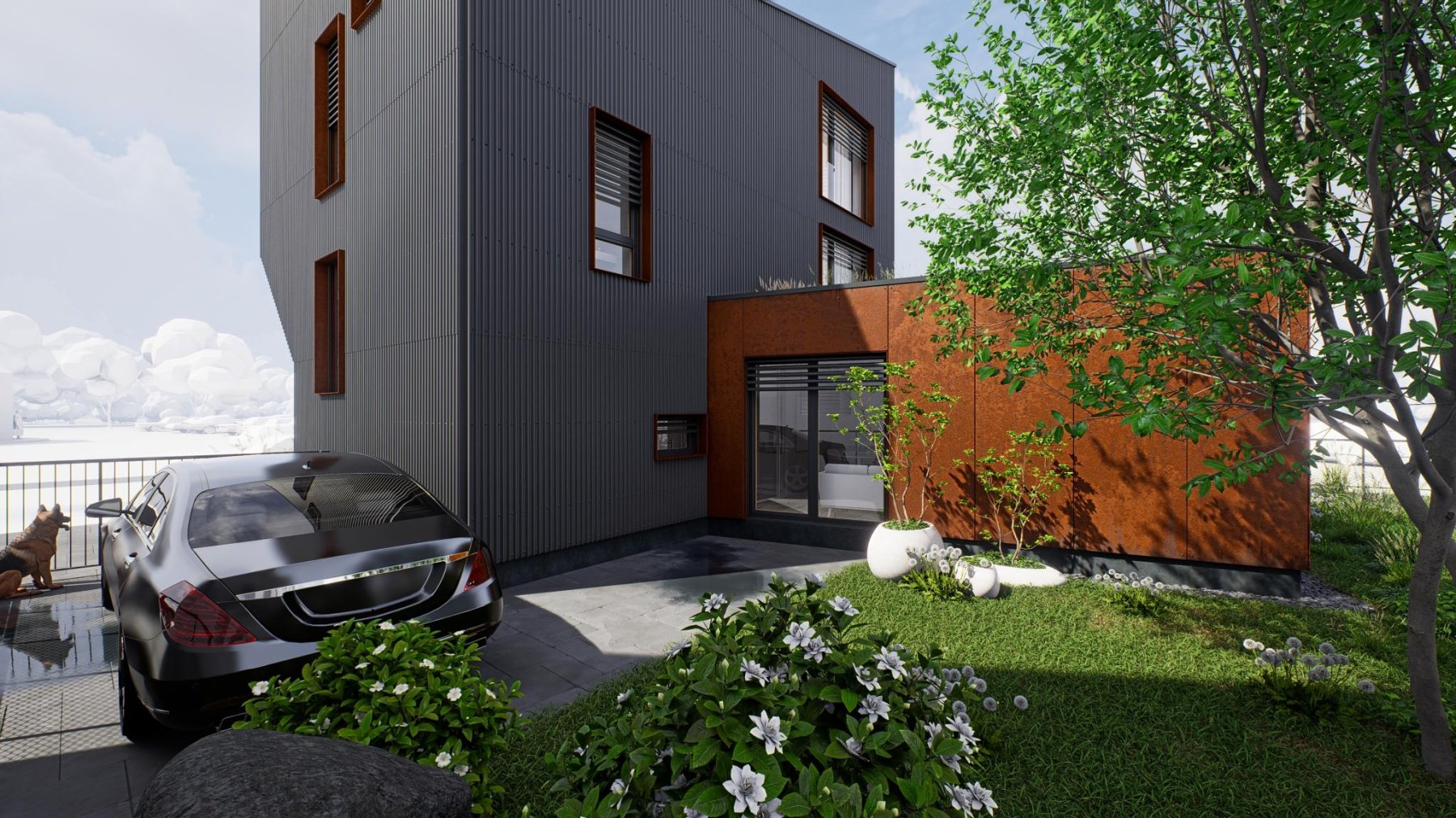 Pro vzhled domu jsme vsadili na neobvyklou kombinaci tmavého profilovaného plechu a kortenu. Velká hmota domu je tak zjemněna vlnitým povrchem fasády a doplněna teple působícími hnědooranžovými detaily reznoucího plechu (kolem oken a na fasádě nižší části, sloužící kanceláři). Celek působí kompaktním dojmem i díky tmavým rámům oken, okenním žaluzím a střeše. Vše je do konečné podoby doladěno zelení, jak na zahradě, tak na porostlé střeše kanceláře.
