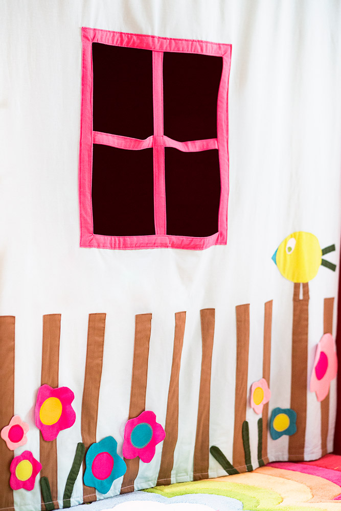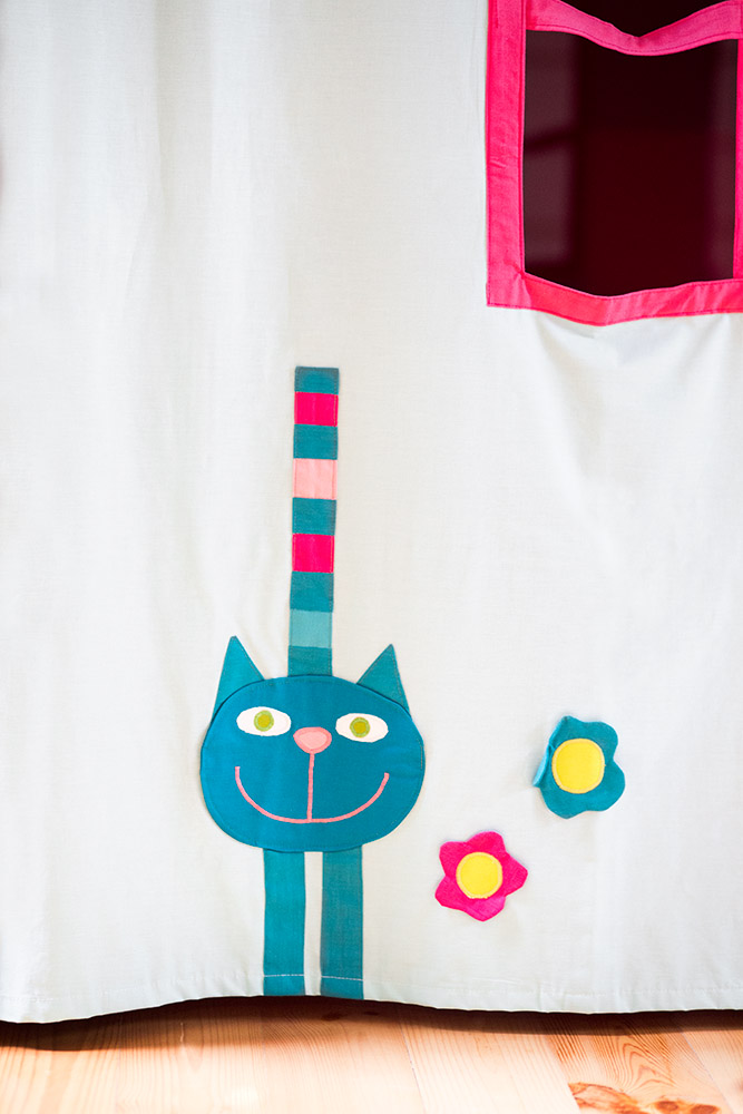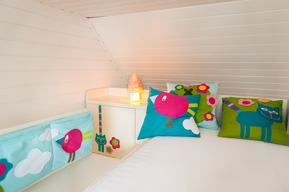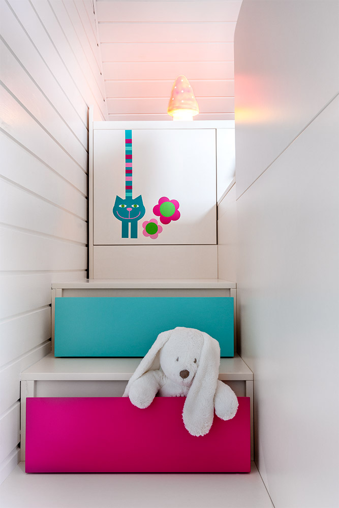 Realizace podkrovního pokoje pro dvě sestřičky. Původní dřevěné palubkové obložení jsme natřeli krémovým odstínem, který odpovídá i odstínu nábytku na míru. Vynikla tak přírodní dřevěná podlaha a pokoj působí prostorným dojmem. Hlavním prvkem jsou autorské textilní dekorace a samolepky v tématu koček a ptáčků v zářivých barvách, které celý pokoj zútulnily a rozveselily. Nábytek na míru je nadčasový a po výměně dekorací bude sloužit sestřičkám až do dospělosti. Stůl i židle jsou samozřejmě rostoucí. Náš tip Skrýše a bunkry, to děti milují! Pro holčičky jsme v pokoji vybudovali domeček s okénky, ve kterém bude umístěno také rozkládací lůžko pro příležitostné přespání návštěv.