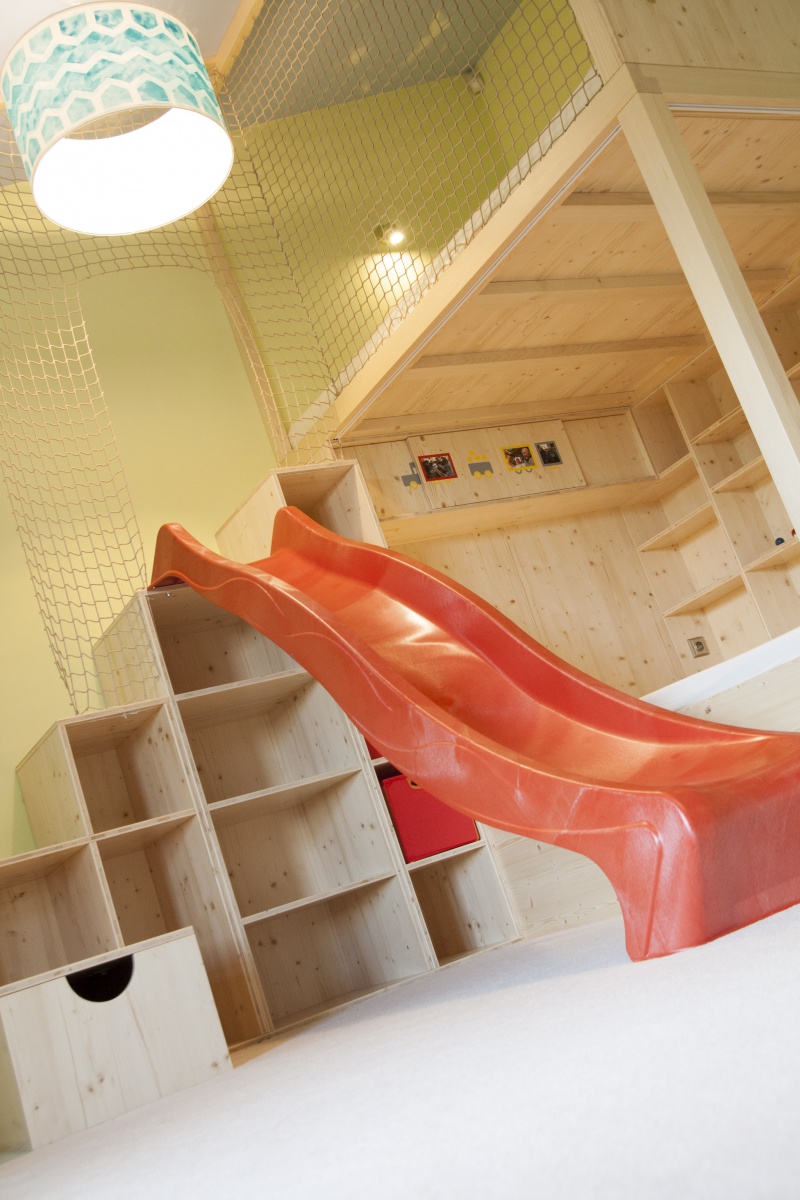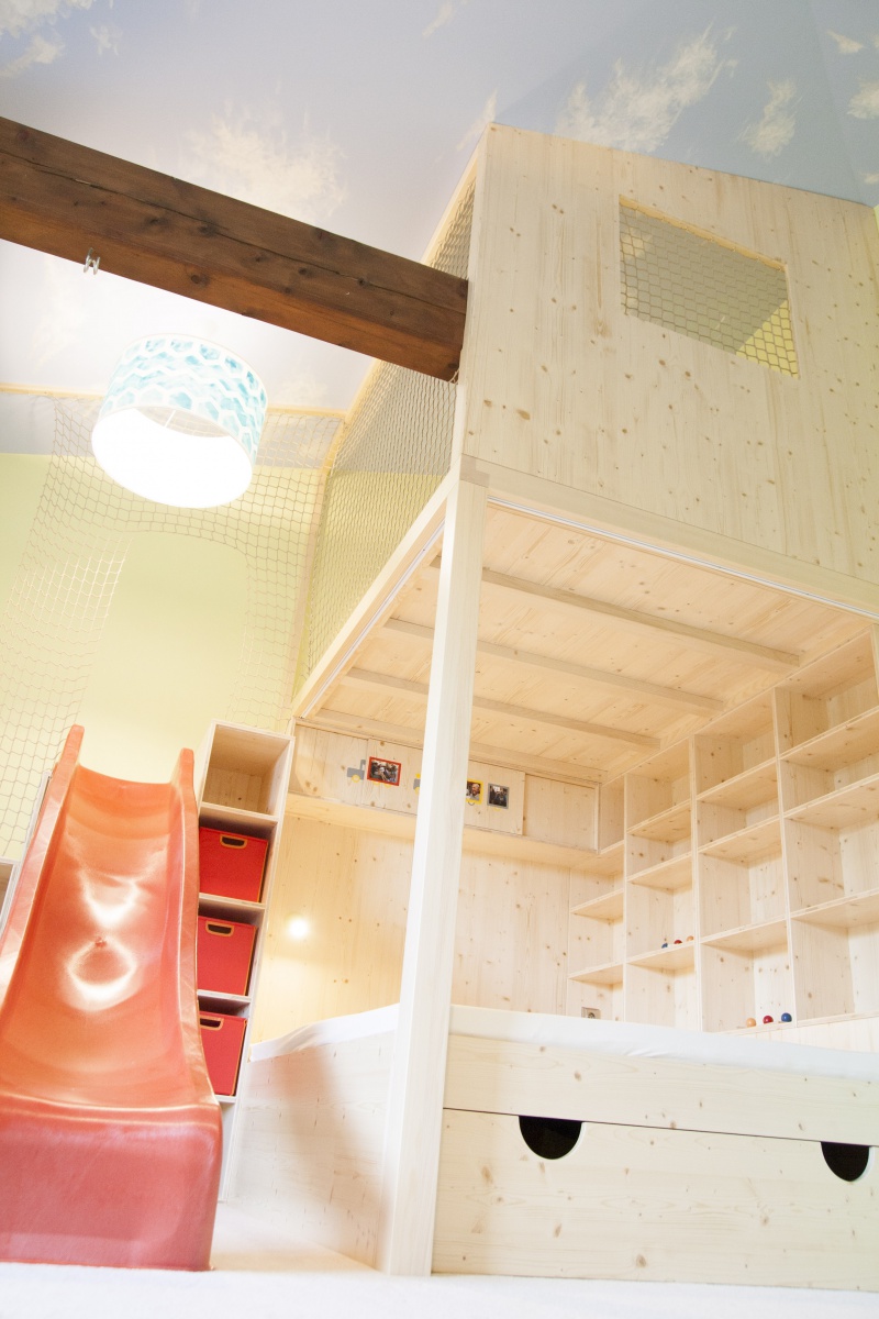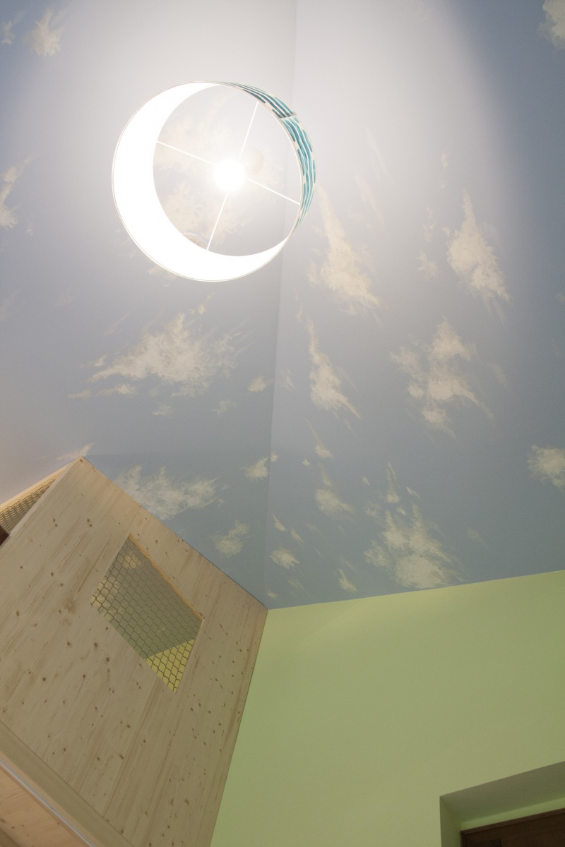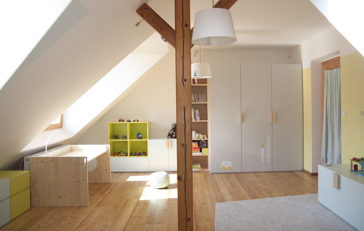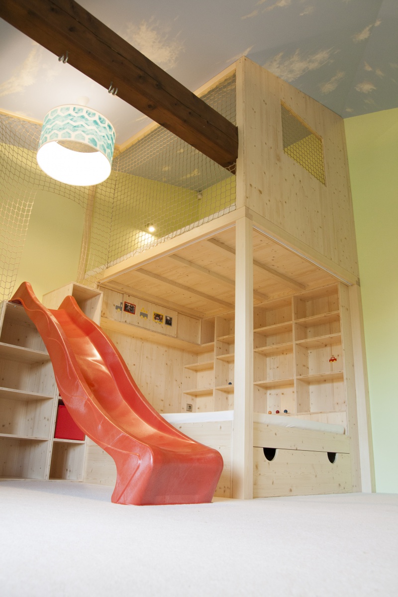 Zrealizovali jsme pokojík pro jednoho akčního chlapečka. Pokoj je zároveň hernou se spoustou aktivit - skluzavka, lezecká stěna, houpačka, jako by byl na dětském hřišti pod širým nebem. A když se zhasne, na nebi mu svítí hvězdy..