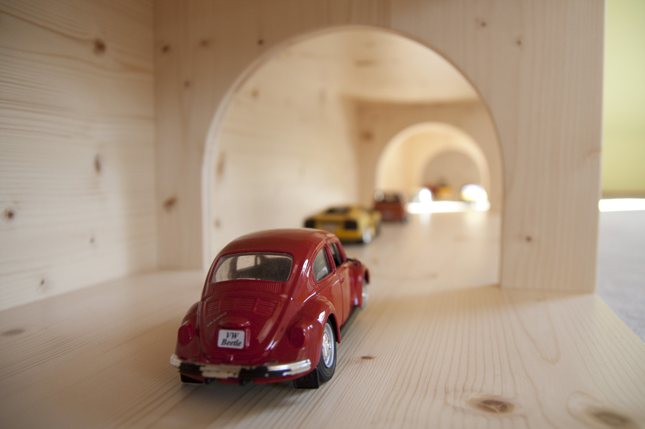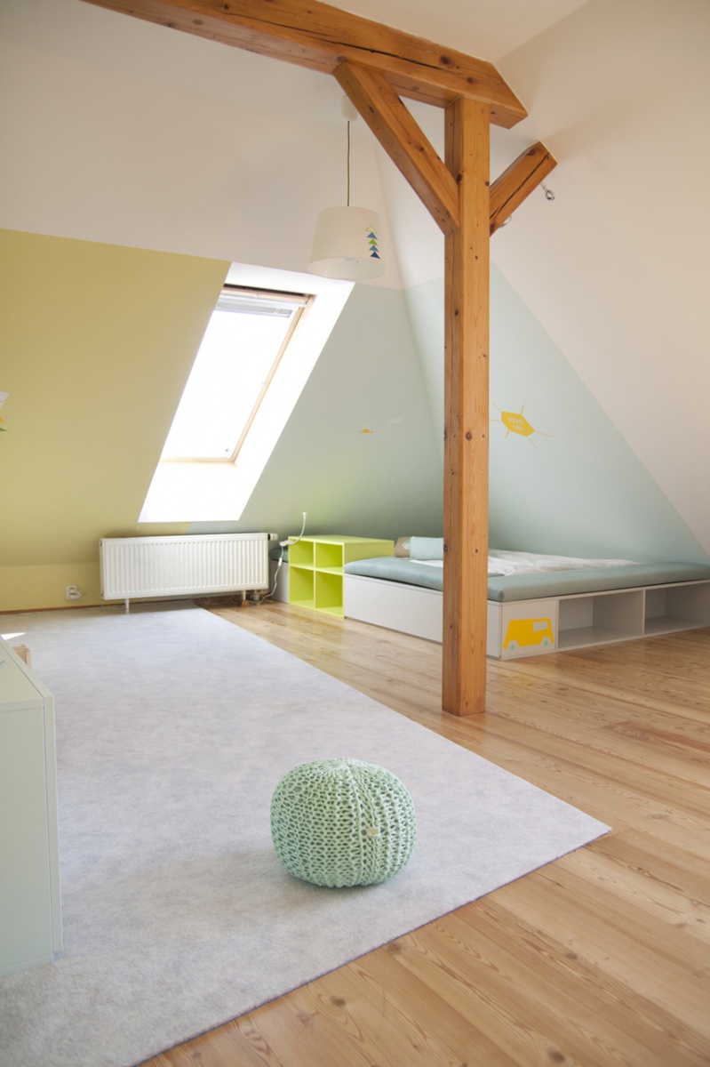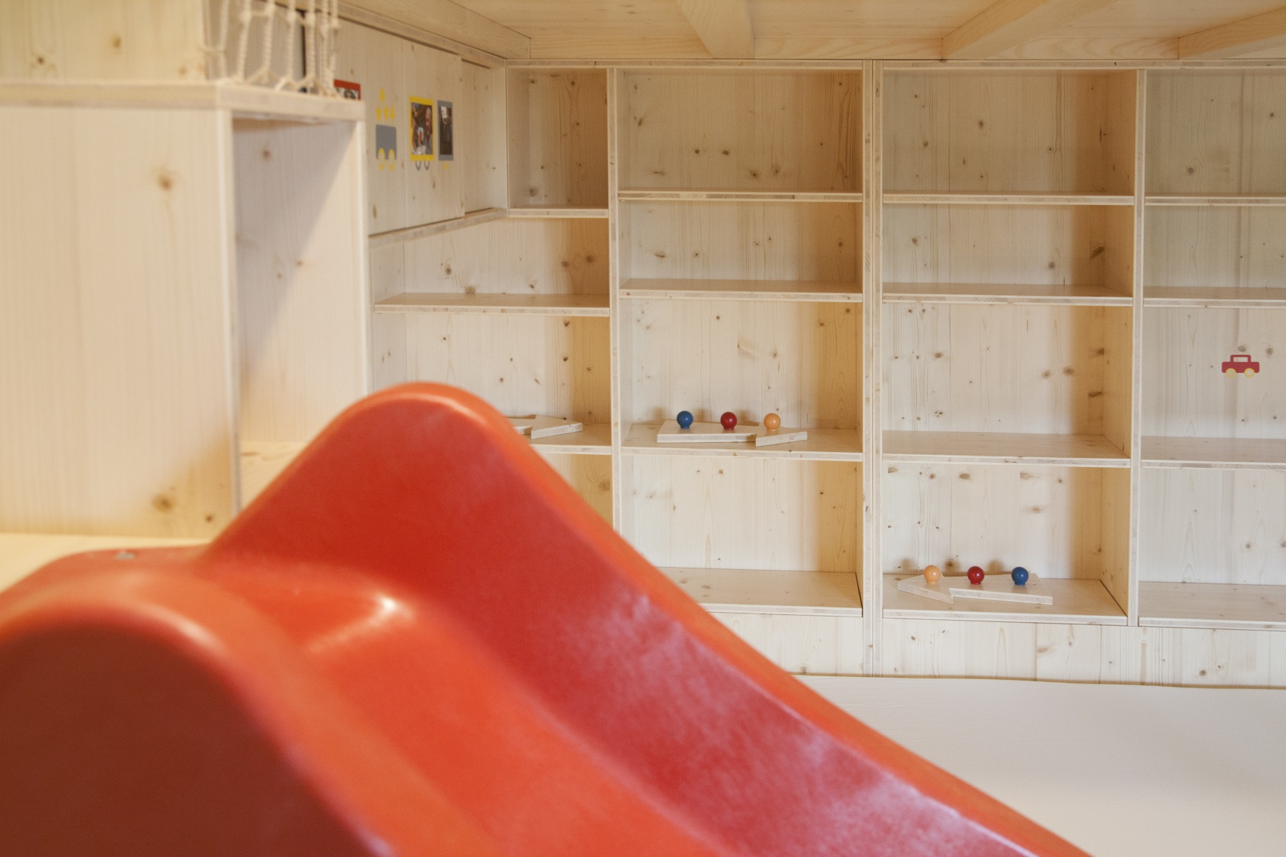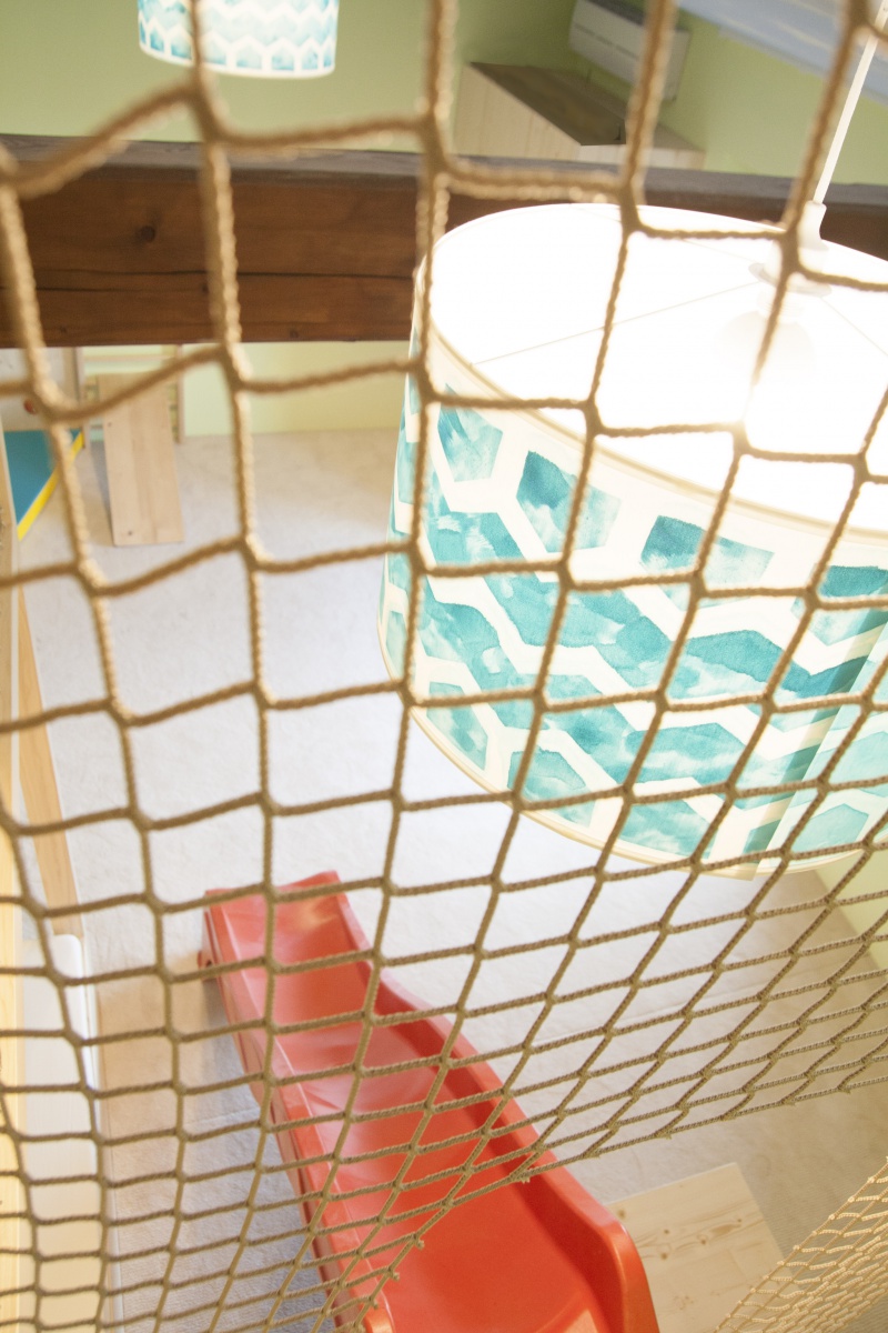 Zrealizovali jsme pokojík pro jednoho akčního chlapečka. Pokoj je zároveň hernou se spoustou aktivit - skluzavka, lezecká stěna, houpačka, jako by byl na dětském hřišti pod širým nebem. A když se zhasne, na nebi mu svítí hvězdy..