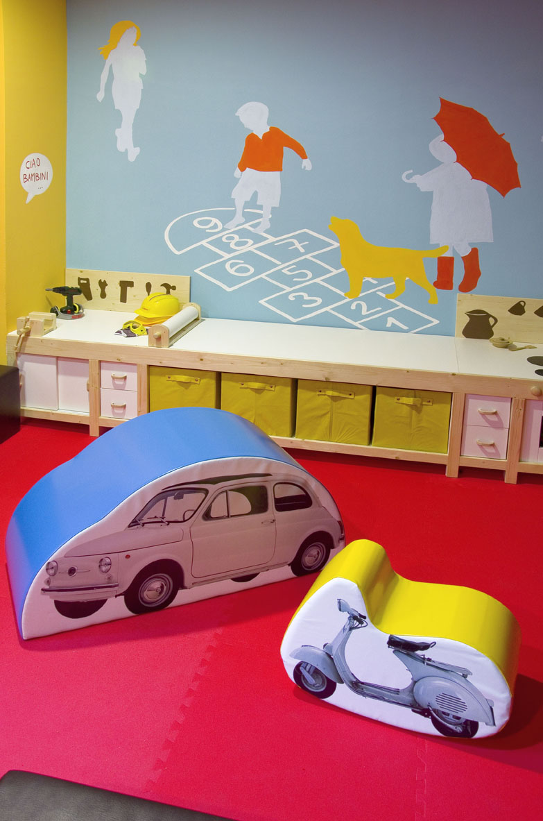 Itálie, léto, sluníčko jako hlavní téma dětského koutku v pizzerii. V koutku je kvalitní odolná a teplá podlaha, originální výmalba a nábytek na míru. Děti si mohou hrát na obchod, kde se prodává ručně šitá zelenina, kluci pracují v dílně a holky mohou vařit v kuchyňce. Zbytek plochy může sloužit ke kreslení. Největší zábavou pro děti jsou molitanové prvky, kostky, záchranný kruh a především mini Vespa a Fiat, který zároveň slouží jako skluzavka. Náš tip Molitanové hračky jsou bezpečné i pro nejmenší děti. Stačí jim dát retro potisk a zaujmou i jejich starší sourozence.