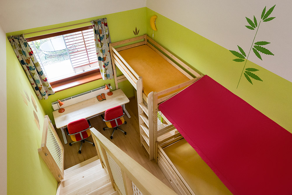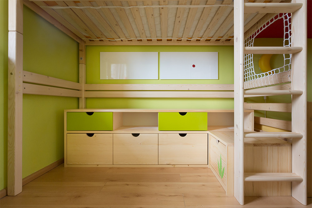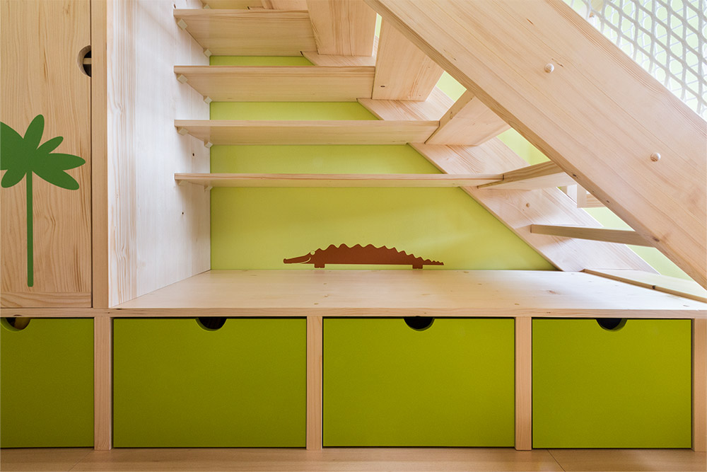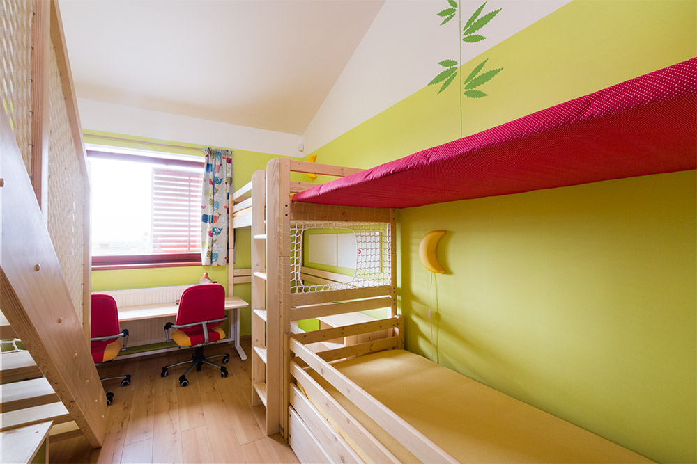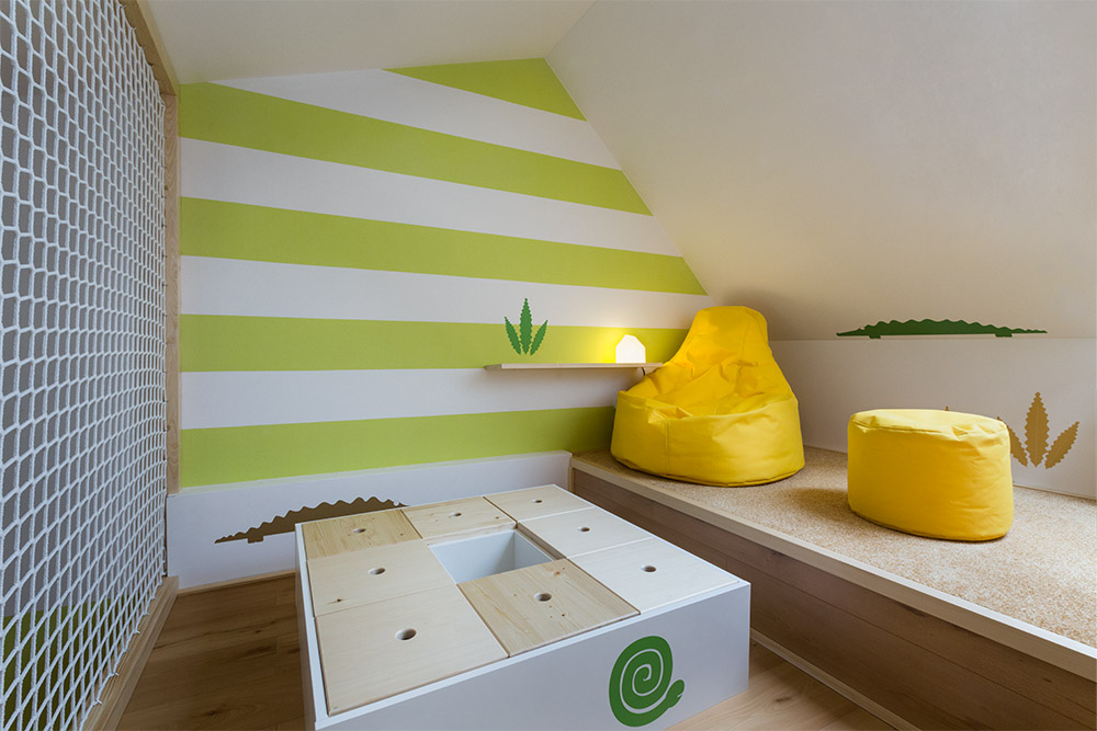 Realizace pokojíku pro dva brášky s tématem Krokodýli. Pokoj je výškově členěný na dva prostory, dole je vzhledem k věku umístěno spaní na dohled rodičů, vestavná skříň u vstupních dveří je určena na uložení oblečení, prostor pod oknem s rostoucím stolem a židlemi slouží prvňáčkovi jako pracovní místo, v budoucnu bude mít mladší bráška vlastní pokoj. Zatím ale chce být svému "velkému" bráškovi na blízku a dělat všechno stejně jako on.. Vrchní patro s měkkým kobercem a úložnými prostory na auta a stavebnice je ideální klučičí "zašívárnou". Vše je bezpečně zajištěno sítěmi. Náš tip Skříň "naležato" je prostorným úložištěm stavebnic, lega a spousty autíček. Vše je prakticky odděleno. I samotný přístup k hračkám je vlastně hra - jak postupně posunout víka tak, aby se odkryl box s legem?