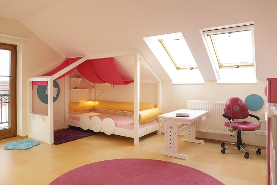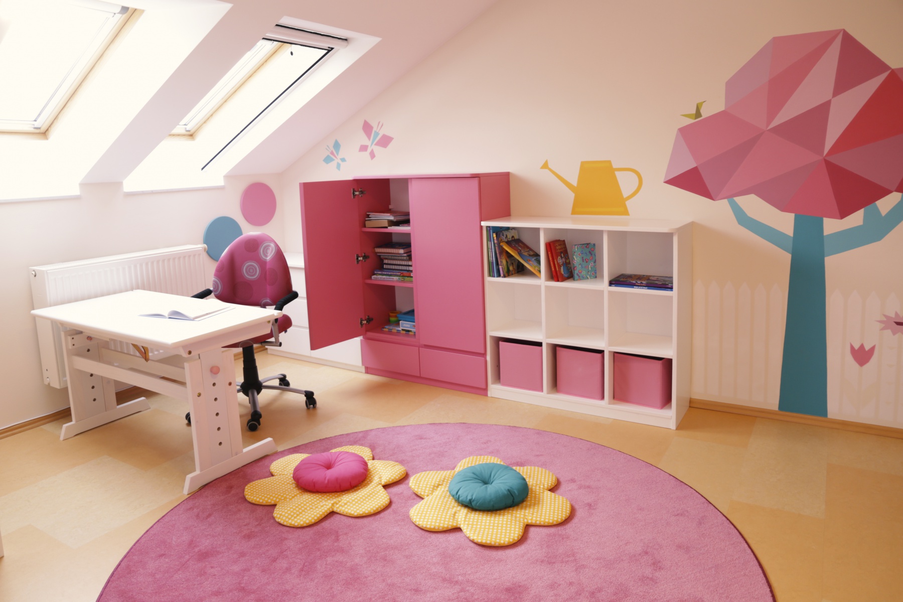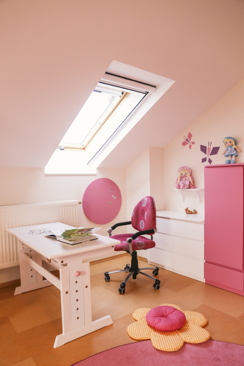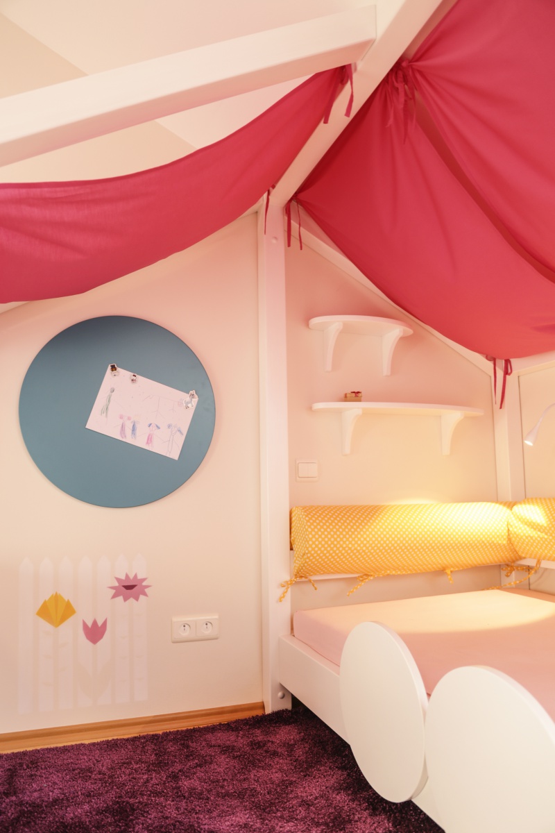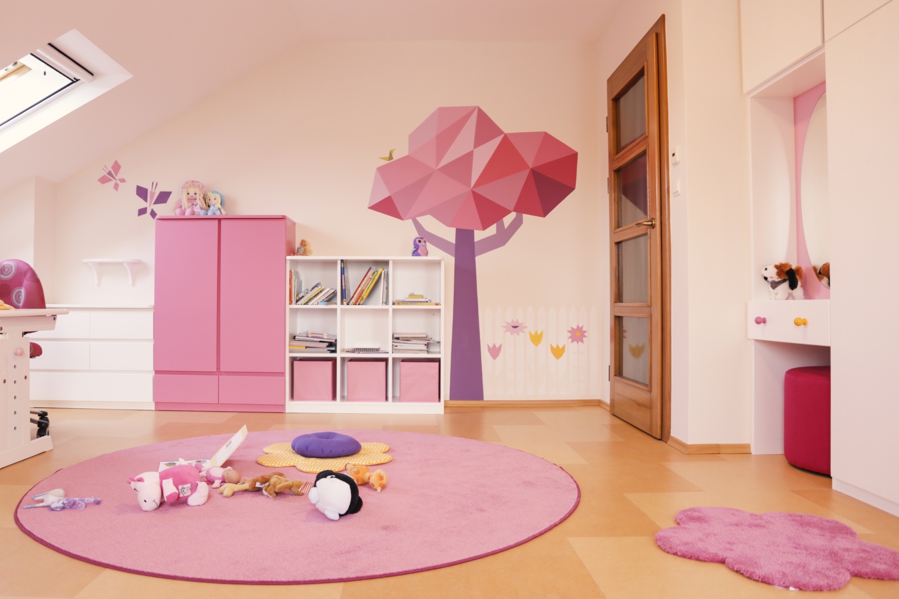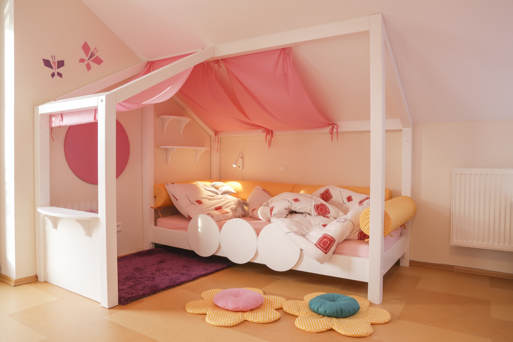 Dva zrcadlové pokojíky pro dvě sestřičky. Nábytek z masivu a ruční malba jsou doplněné o drobné dekorace na přání holčiček i rodičů. Domečky na spaní jsou opatřeny lehkými baldachýny, aby při spánku nerušilo světlo lamp a zároveň zútulňuje prostor na hraní. Rostoucí stoly jsou samozřejmostí stejně jako hojnost úložného prostoru.
