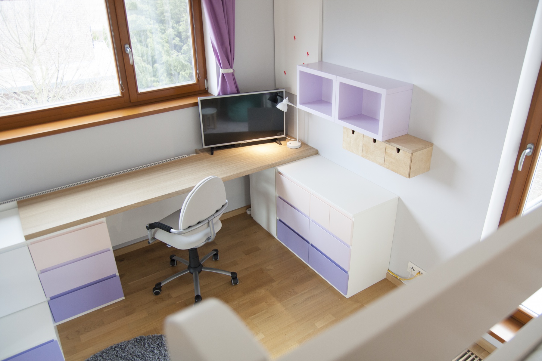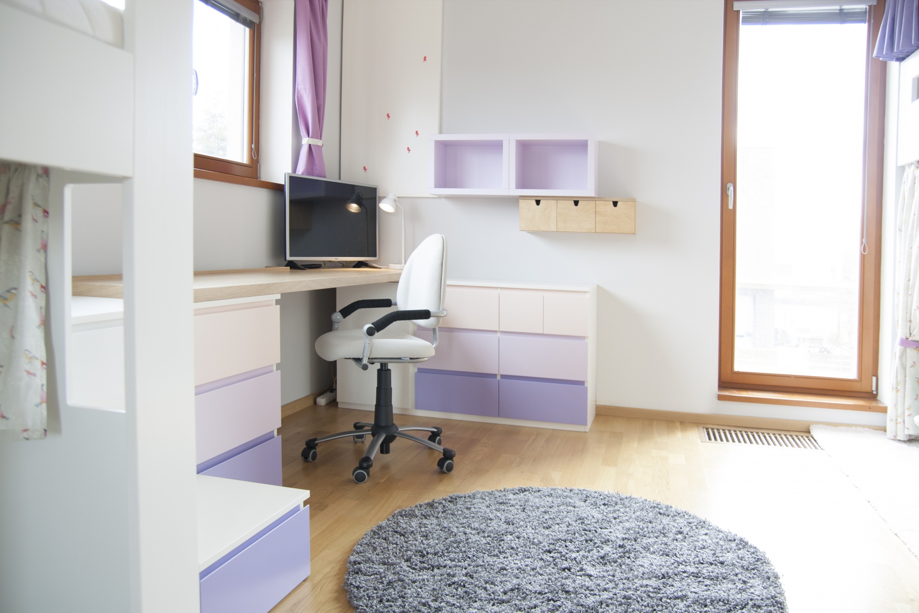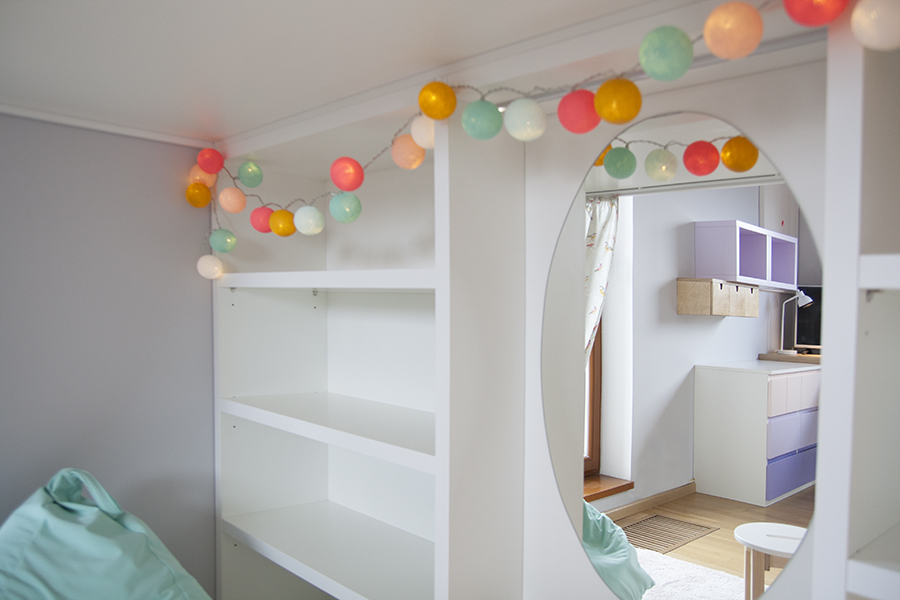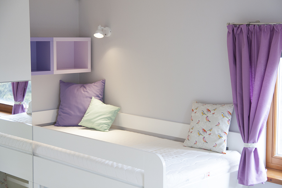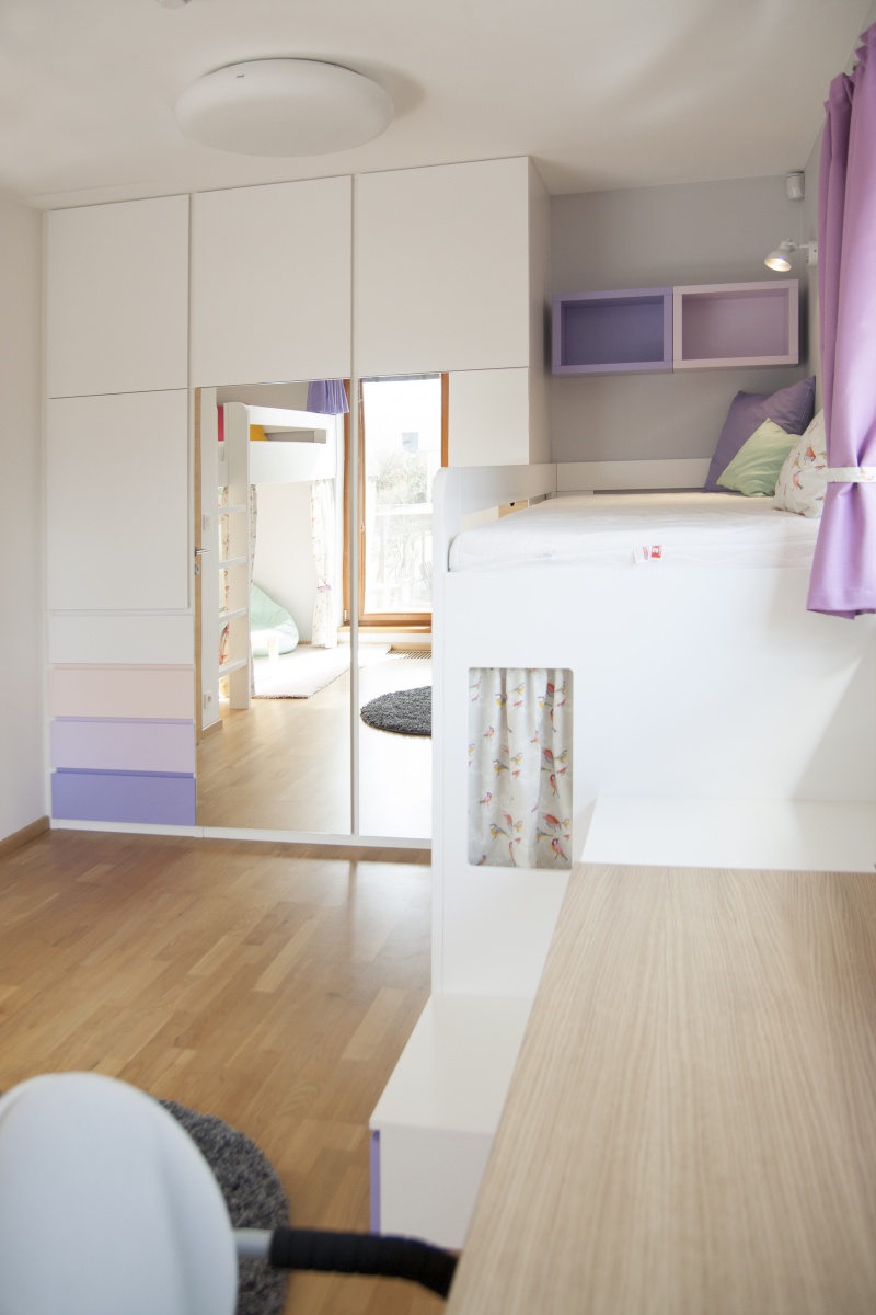 Pokojík pro dvě sestřičky v podobném věku. Zvýšené postýlky, které tak vytváří spodní herní plochu, byly jasnou volbou. Bunkr vzniklý pod nimi má každá vlastní a mohou si tak každá zajistit vlastní soukromí nebo společnou schovku. Kvalitní nábytek z masivu doplňují jarní dekorace a tím pokojíček odlehčují a vítají slunce otevřenými okny.