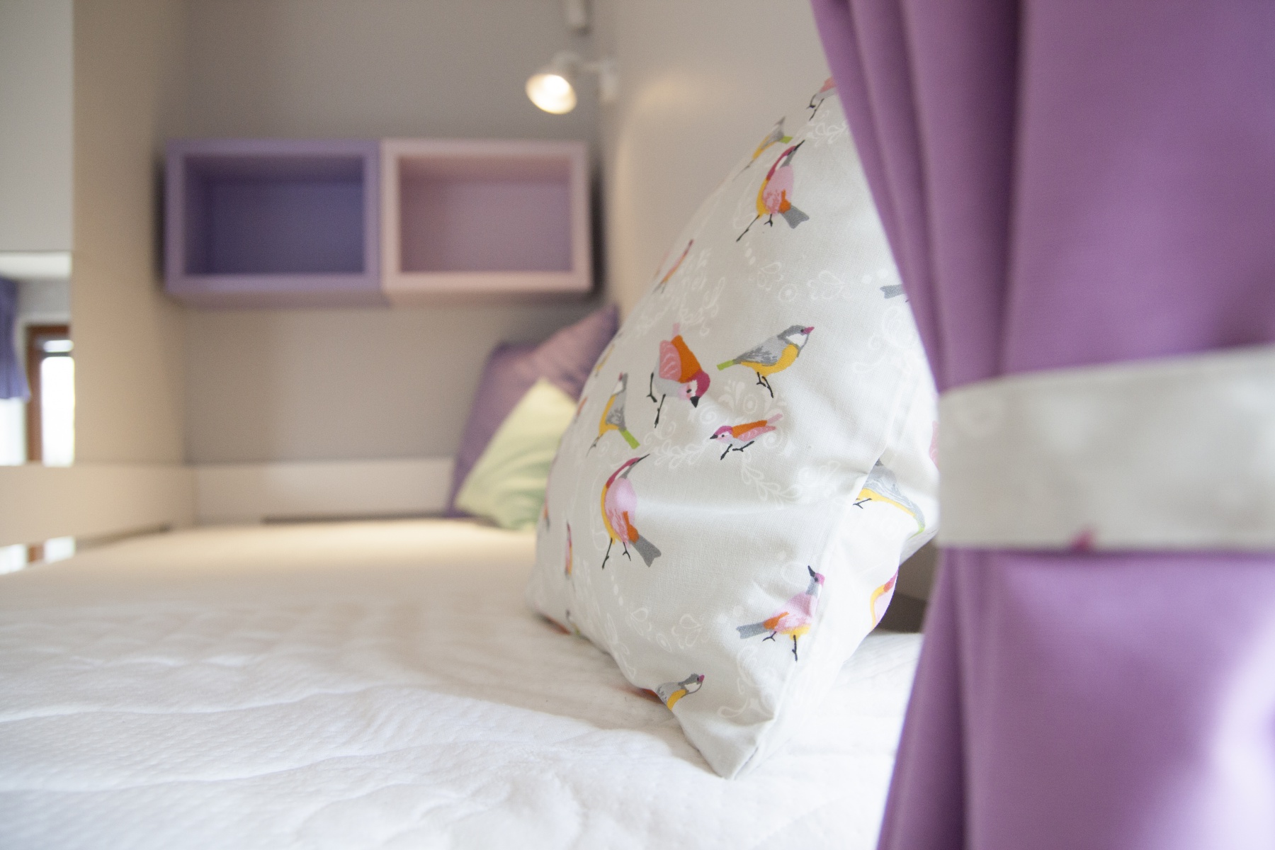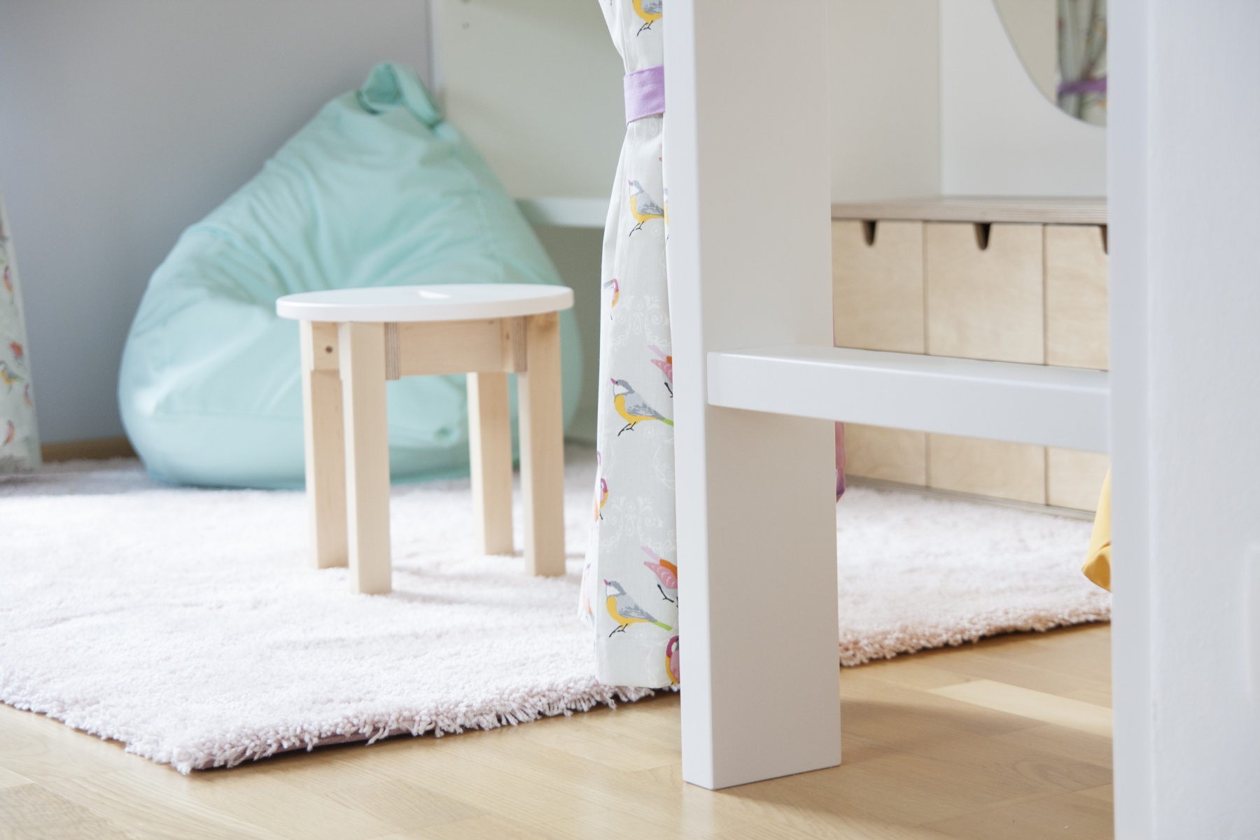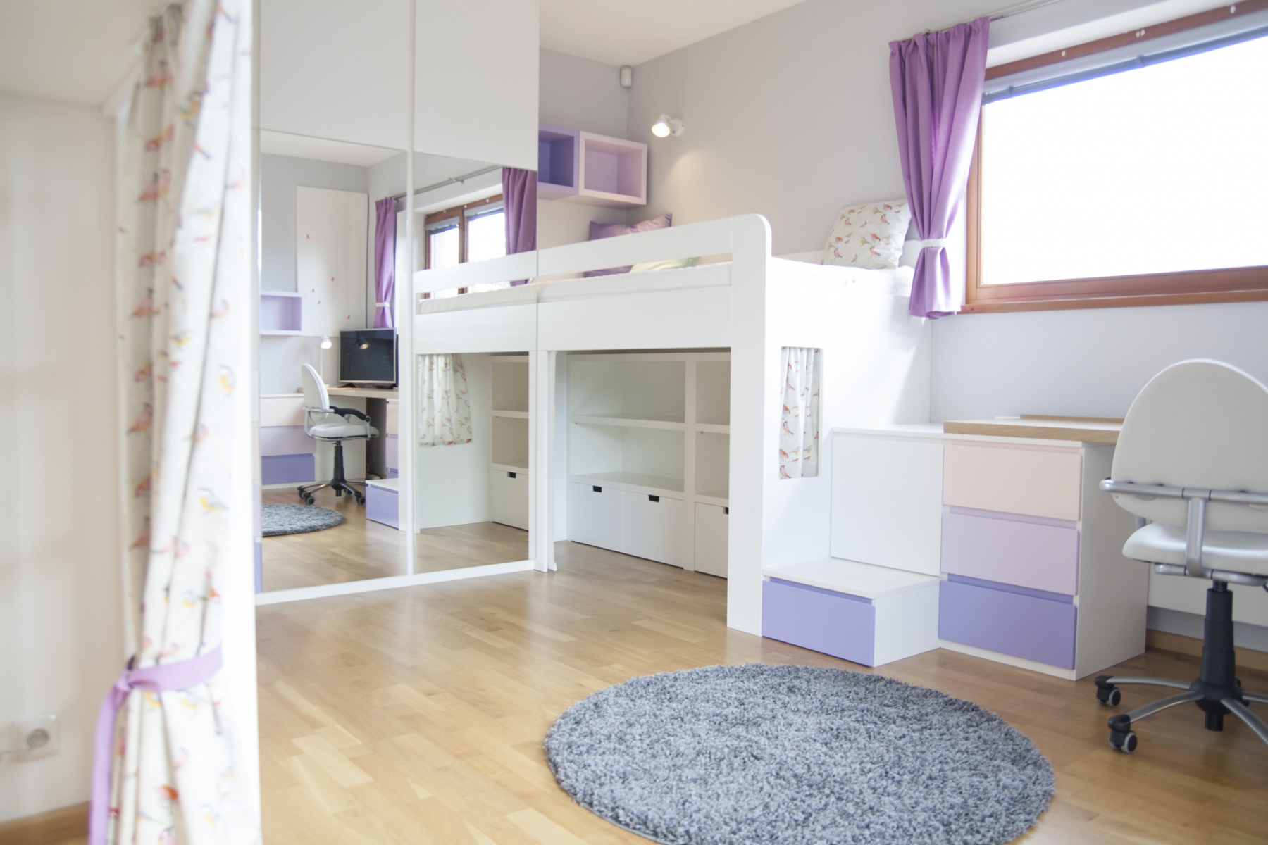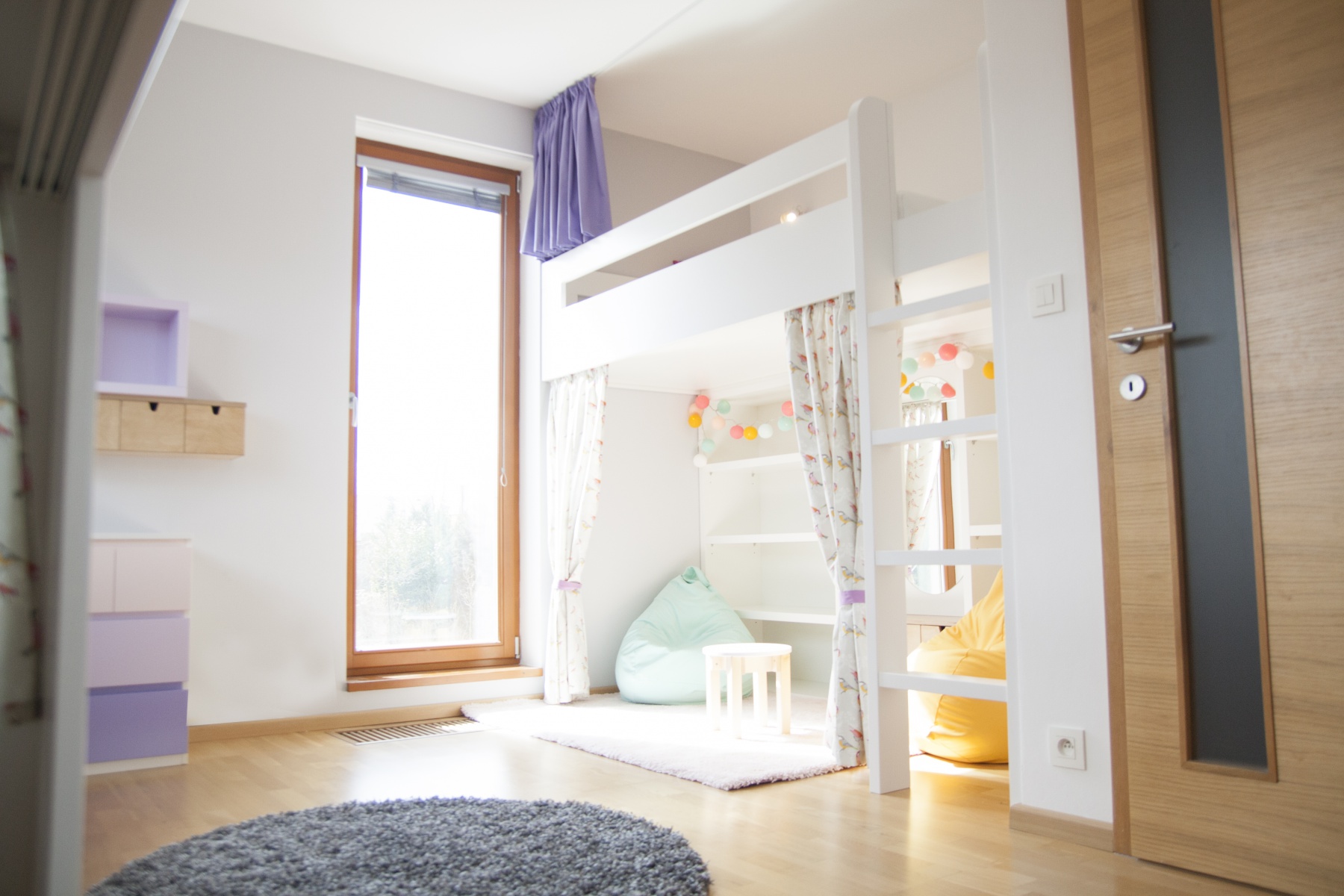 Pokojík pro dvě sestřičky v podobném věku. Zvýšené postýlky, které tak vytváří spodní herní plochu, byly jasnou volbou. Bunkr vzniklý pod nimi má každá vlastní a mohou si tak každá zajistit vlastní soukromí nebo společnou schovku. Kvalitní nábytek z masivu doplňují jarní dekorace a tím pokojíček odlehčují a vítají slunce otevřenými okny.
