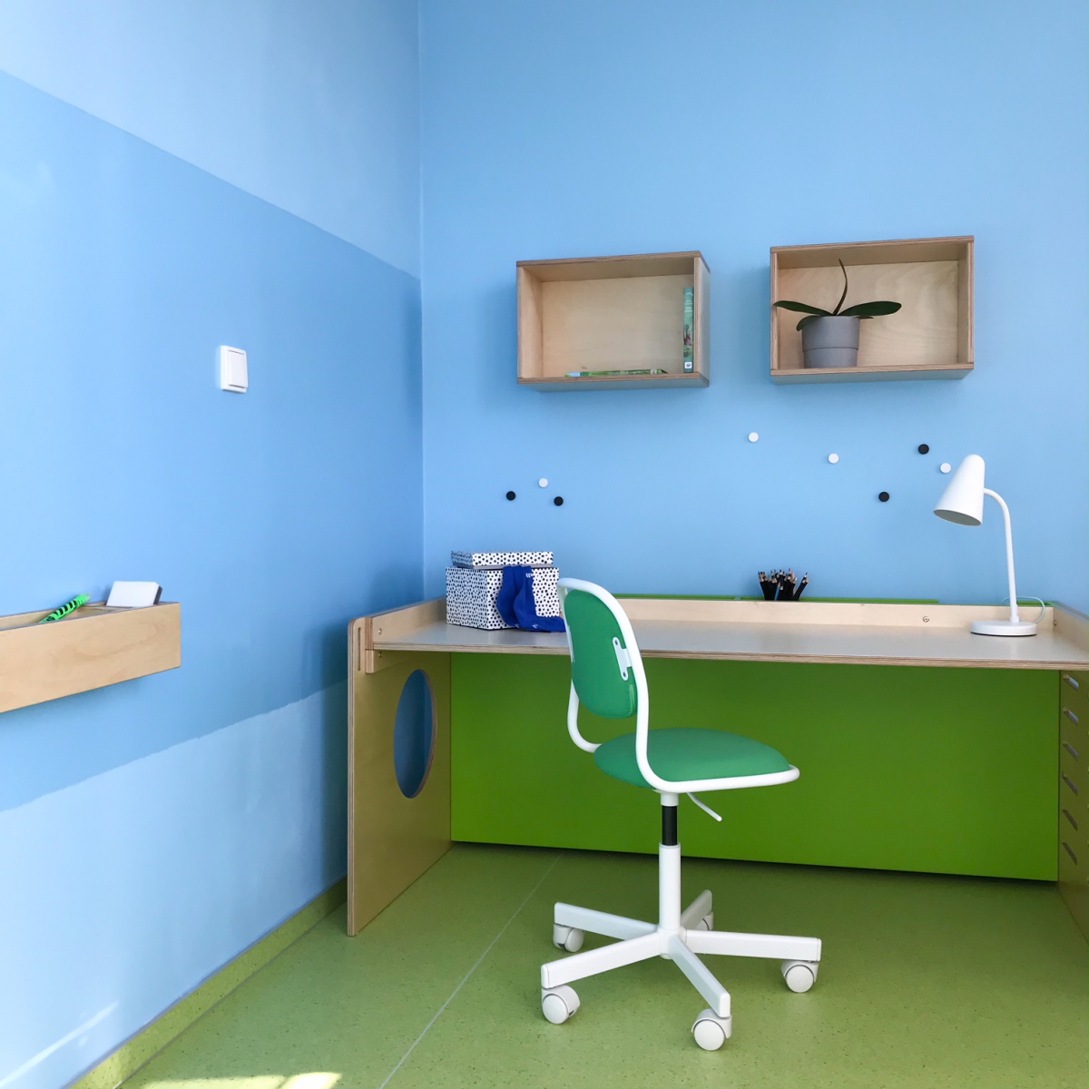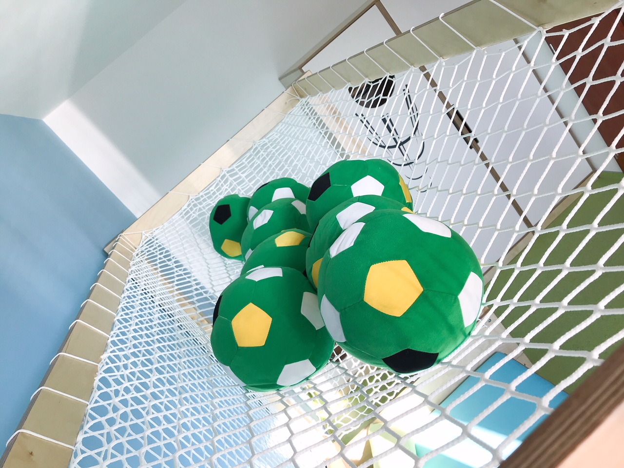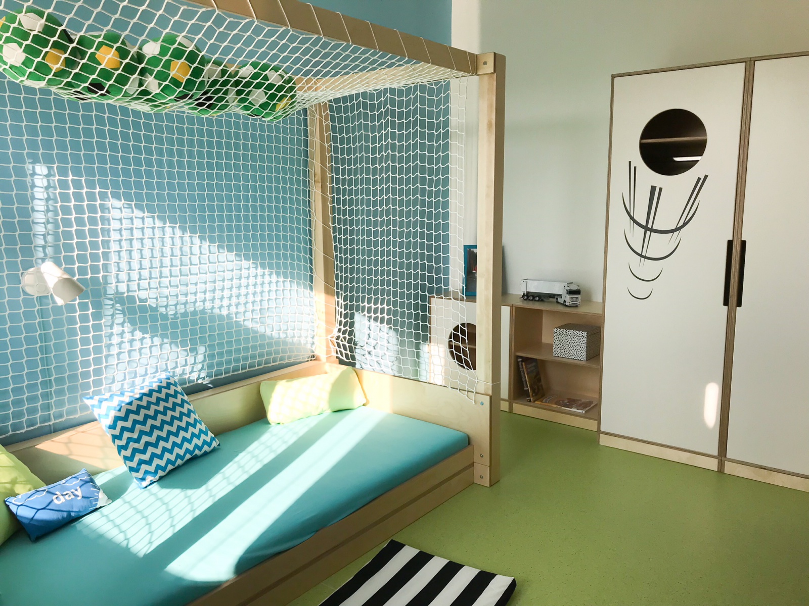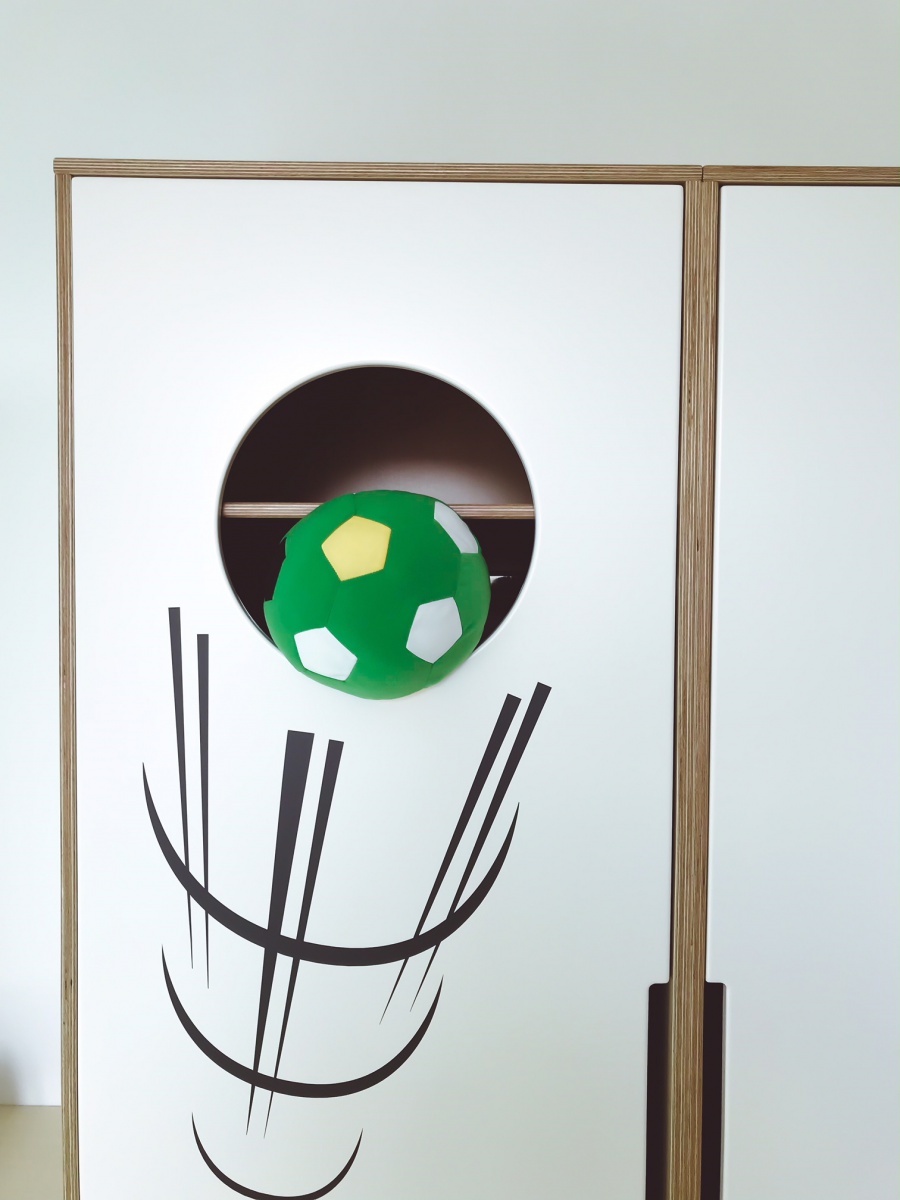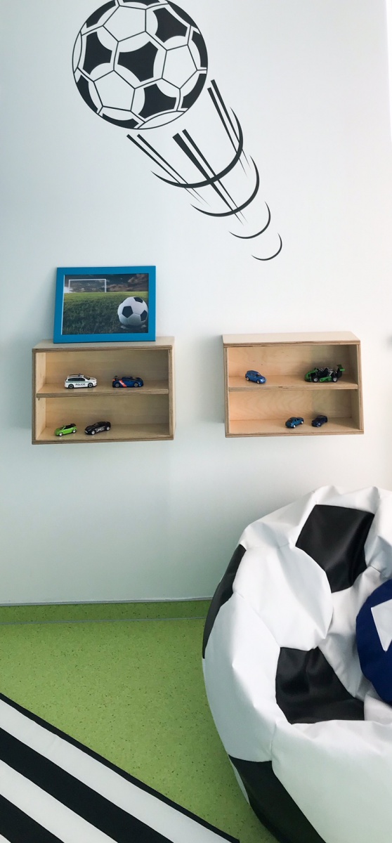 Dětský pokoj lze přizpůsobit každému koníčku našich dětí. Například ve spolupráci se společností KINDER jsme proměnili dětský pokoj ve fotbalové hřiště. Rostoucí kvalitní nábytek, který zůstane klučinovi až do studijních let, jsme doplnili výmalbou, samolepkami a dekoracemi jeho největšího koníčku a tím je fotbal! Pokoj se tak proměnil z pouhého místa na spaní v místo pro hru a kreativitu. Popisovatelný nátěr na stěně umožňuje chlapci vyjádřit své nápady a myšlenky i kolem sebe.