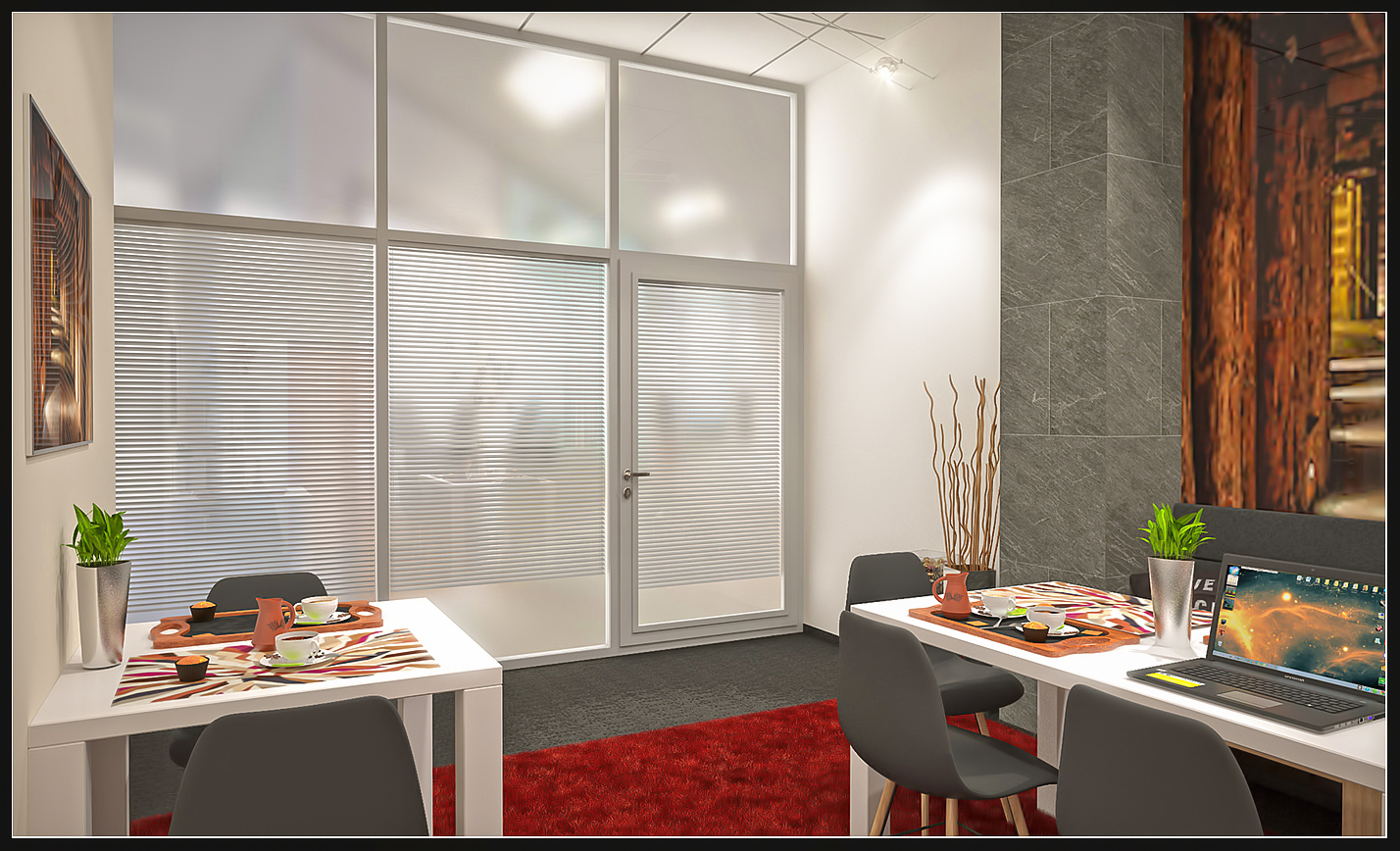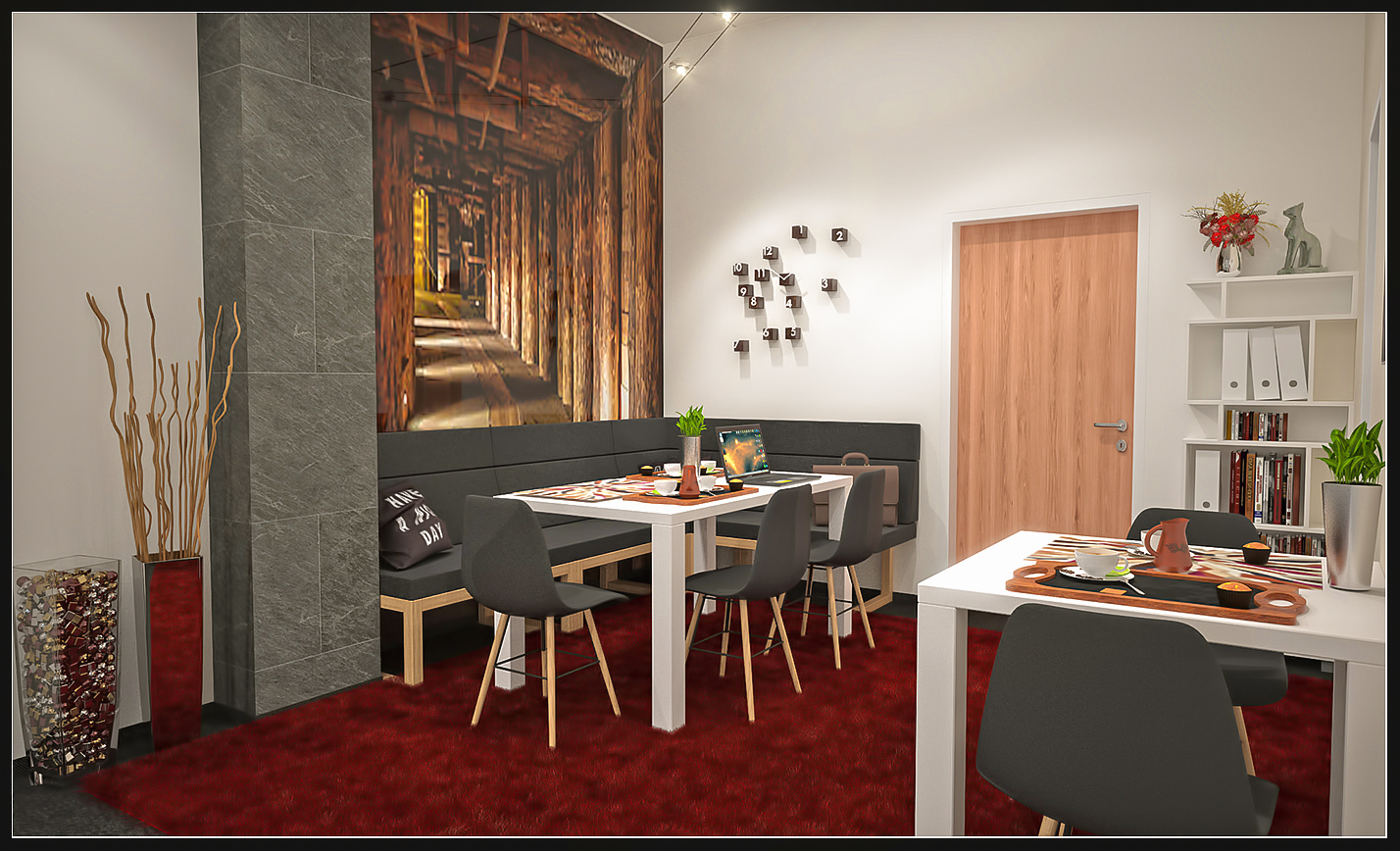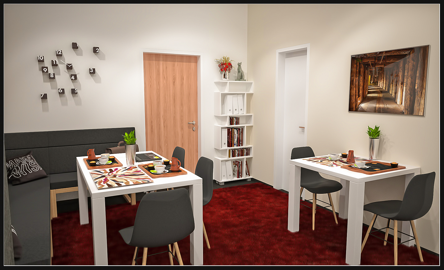 I v komerčních prostorách můžeme vytvořit odpočinkovou místnost jež bude splňovat potřebu jídelny i místa kde si jen dát kávu nebo vést poradu.