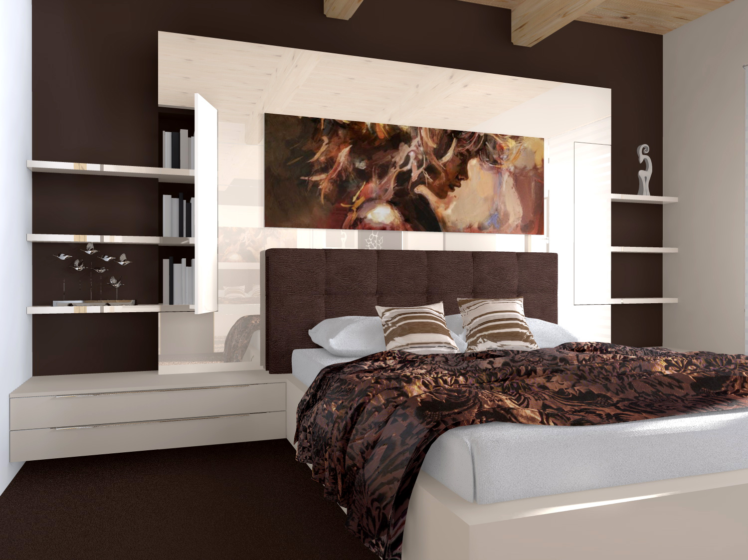 Pánská ložnice s chytře řešeným zádovým panelem, umístěným do středové niky ve stěně, díky kterému tak vznikl úložný prostor. Dvířka v panelu se skrytým kováním nijak nenarušují celkový dojem. Úložný prostor vznikl i za obrazem. Ložnice se tak nestává jen plochou ke spánku, ale chytrým pomocníkem v případě, že jsme nuceni na lůžku setrvat např. z důvodu nemoci. Také to je důvod, proč jsem volila celoplošné narážecí úchyty v celé délce šuplíků. Pohodlně tak můžete tahem otevřít šuple z postele, aniž by jste hledali středovou úchytku. Ložnice skýtá samozřejmě další komfort v podobě nepřímého osvětlení LED pásky.