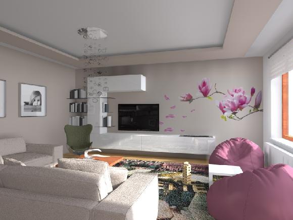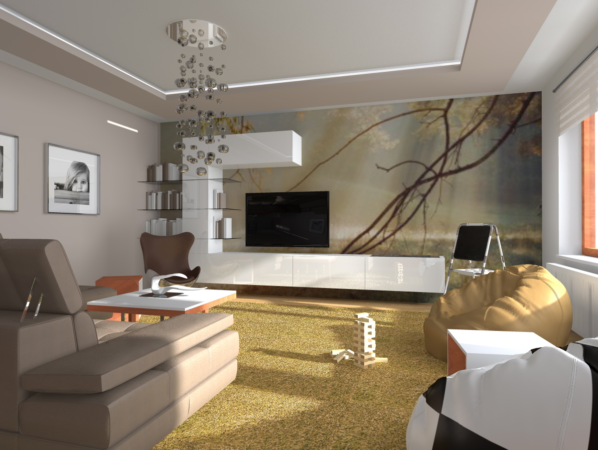 Bouráme hranice díky prostorovému efektu fototapety. Vzdušná a velmi praktická TV stěna skýtá dostatek úložného prostoru, stejně jako plochy pro další využití, jako je Biokrb, či odkládací plocha pro děti v místě herního koutku.