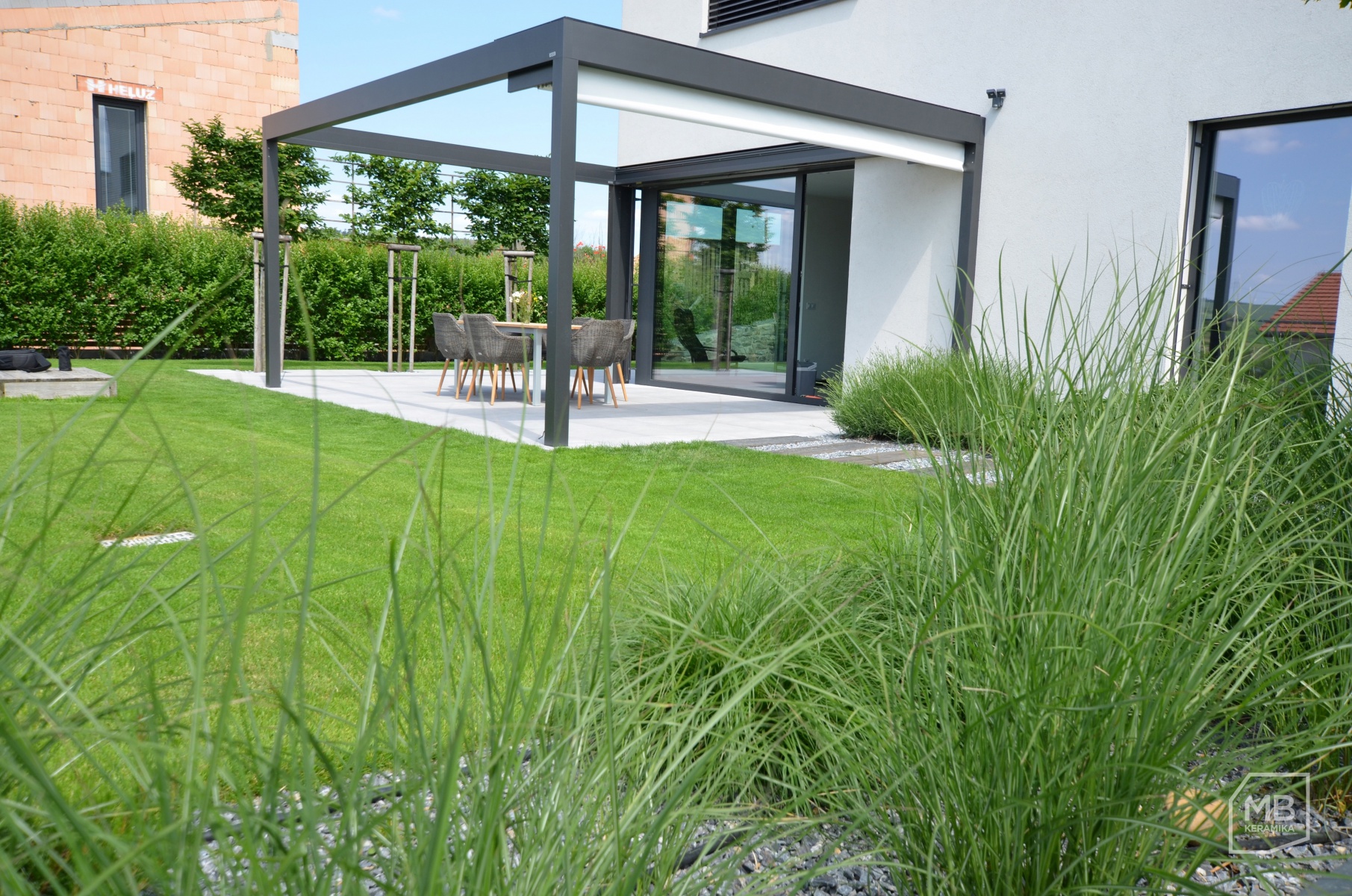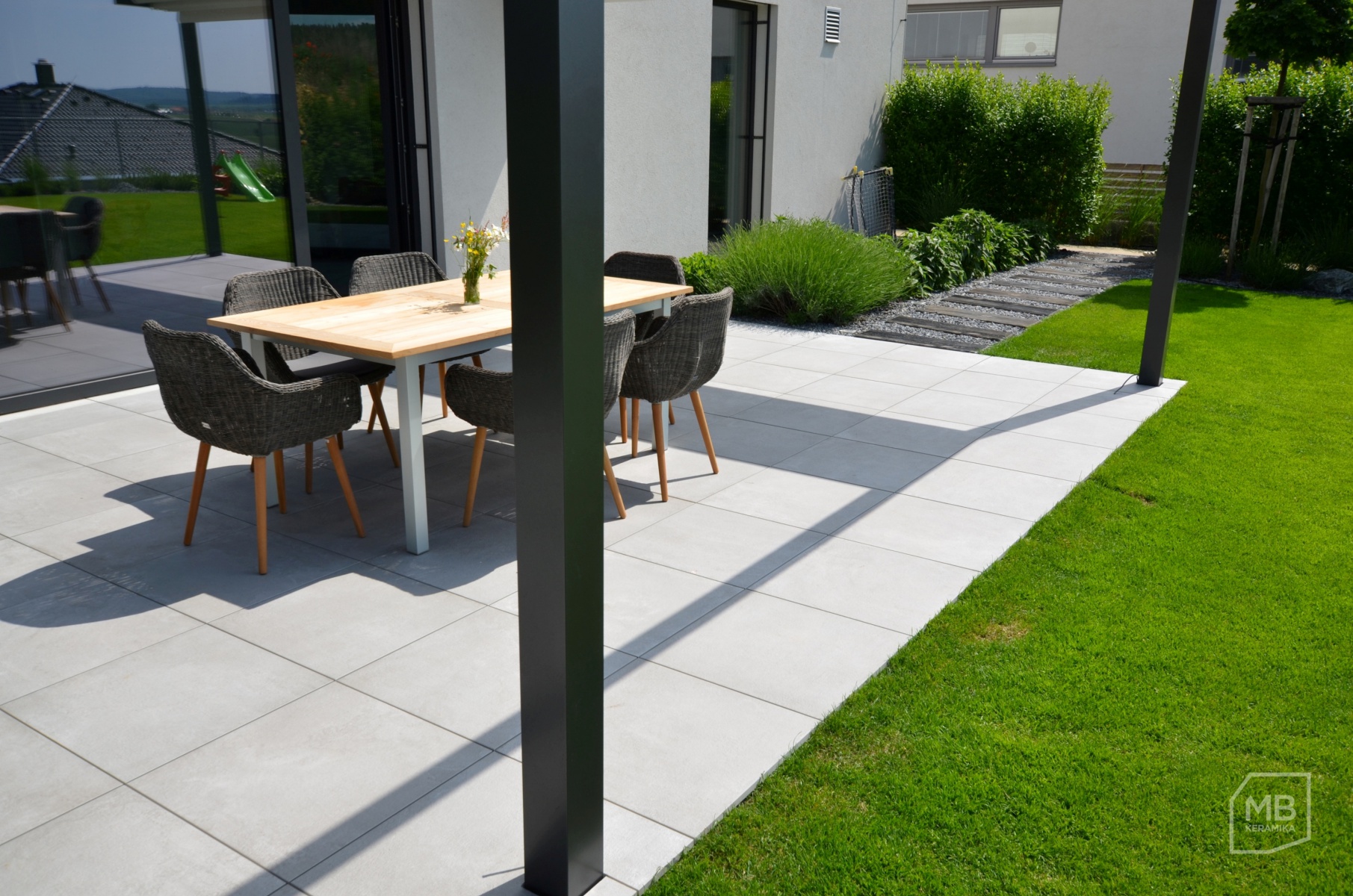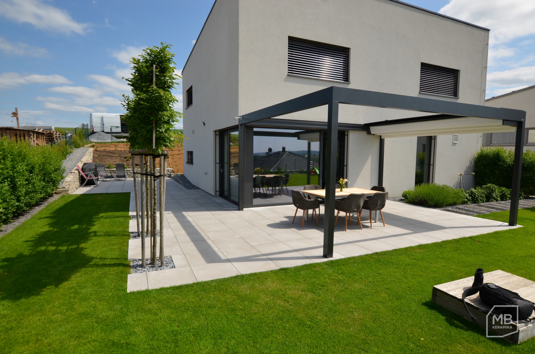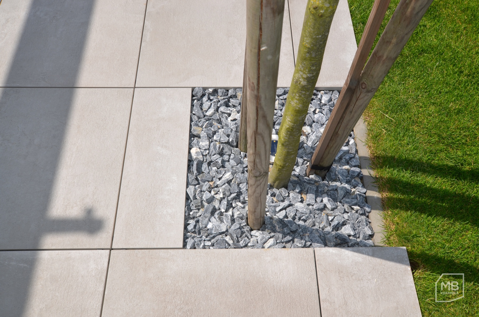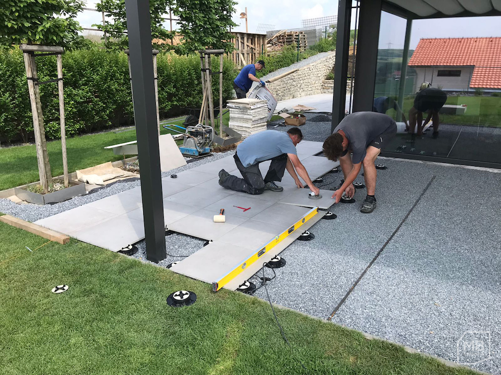 Volba dlažby na terasu 2cm dlažba betonova stěrka 2cm dlažba na stěrku a tercich detail u stromku foto prodejna Krásná terasa z keramické dlažby u rodinného domku Pergola u rodinného domu dlažba na terčích průběh realizace pokládky dlažby na terče Autor: M.B.Keramika spol. s r. o. Datum realizace: 2018-08-30 00:00:00.000000 0