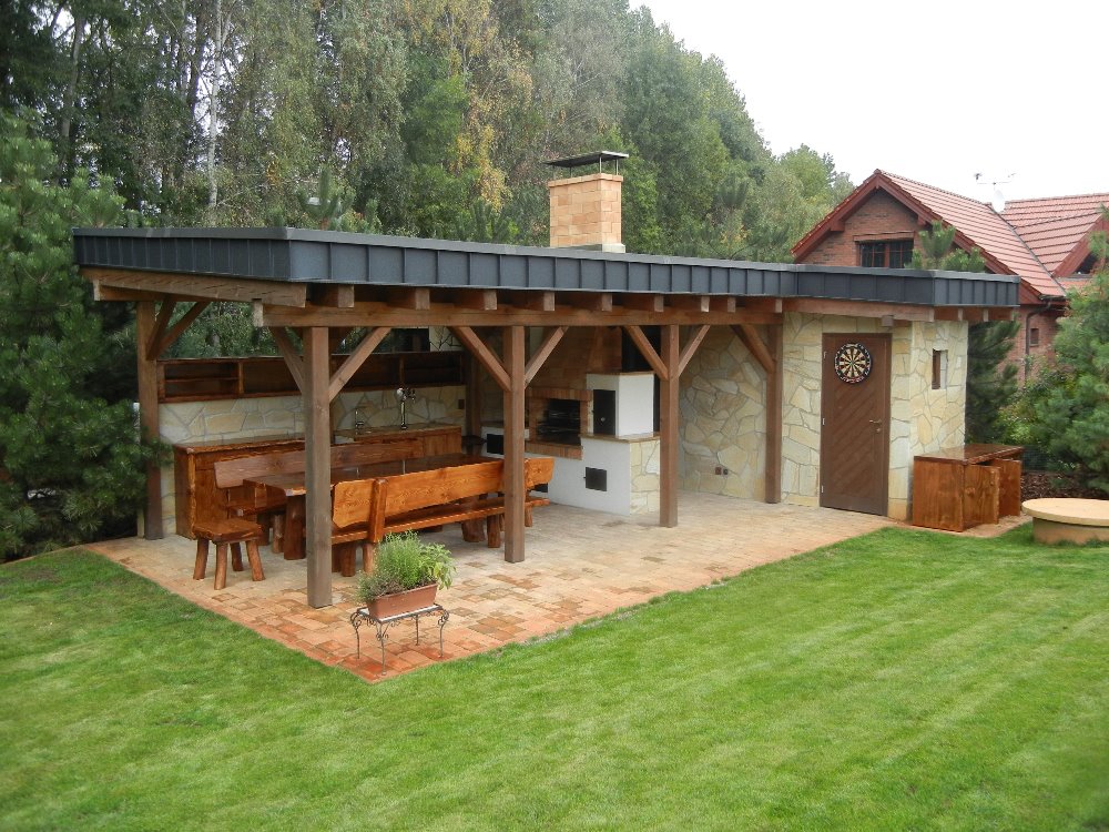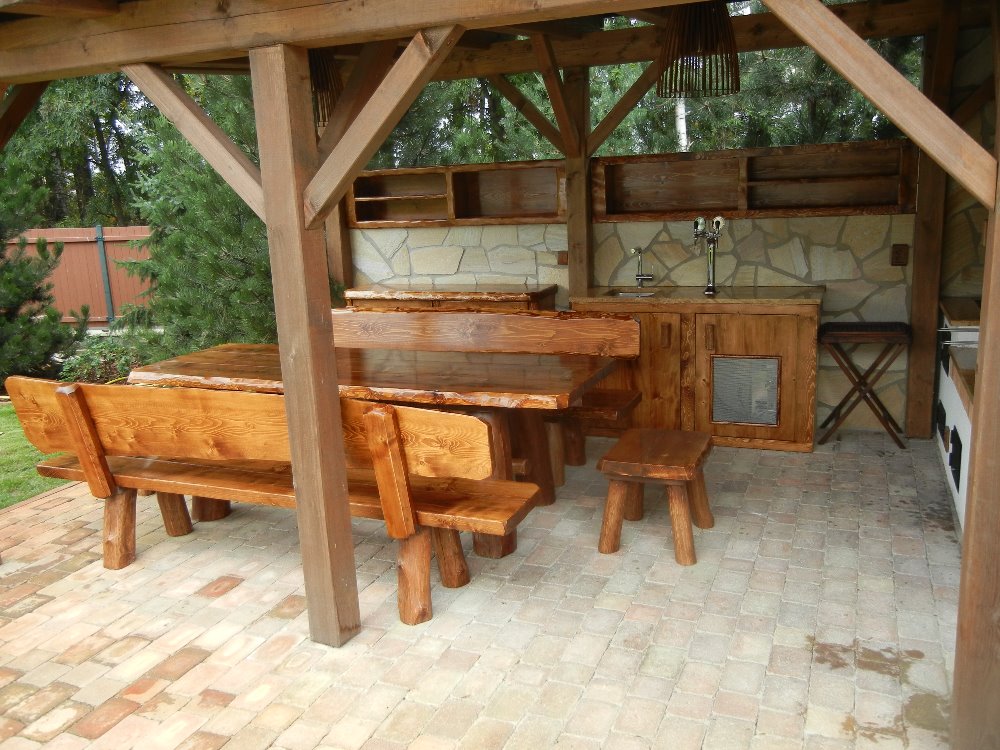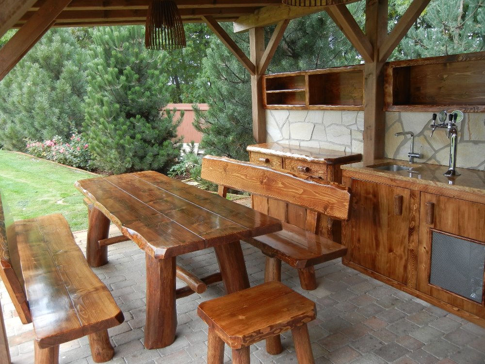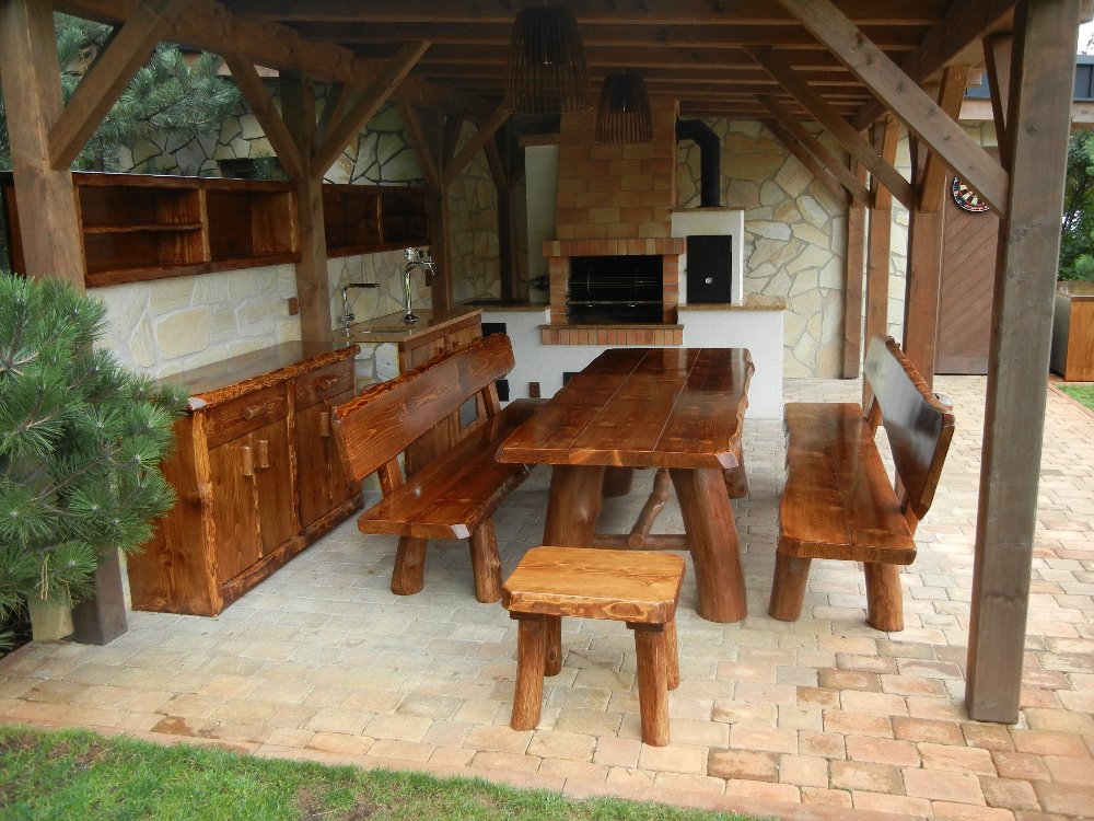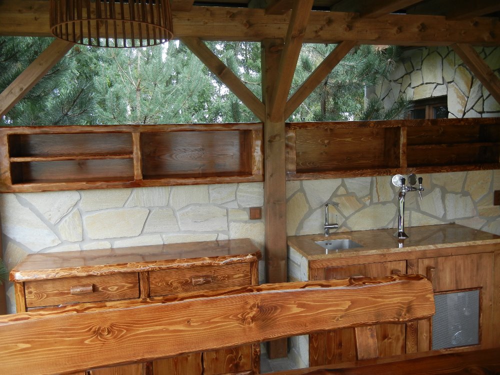 Vybavení pergoly rovnodenní domu, provedení smrk masív. Realizace pozůstává z masivního stolu rozměr 250 x 90cm, dvě lavice 250cm, dvě židle 40 x 60cm, masivní komoda 180x50/90cm, dvě kryté police 200cm, dvířka pod dřez, kryt filtru tepelného čerpadla v stylu komody.