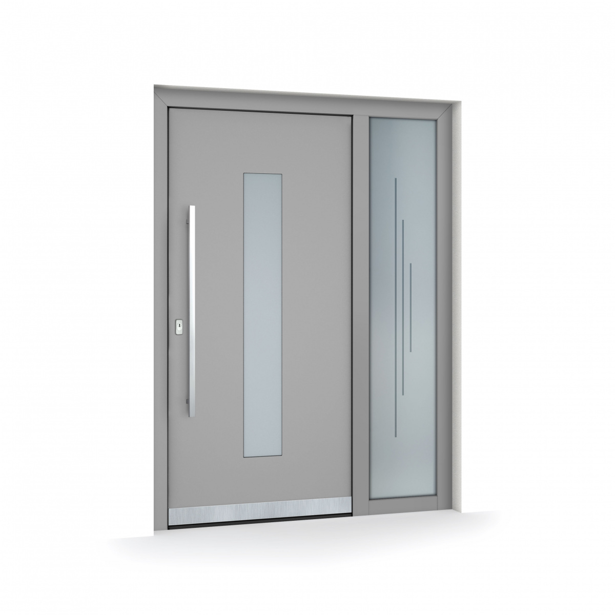 Vchodové dveře Aneta v trendy šedých odstínech. Konstrukční provedení s fixním bočním prosklením a pískovaným sklem. Moderní kolmé madlo. Pro více informací kontaktujte partnery PERITO (prodejci oken a dveří) https://www.perito.cz/prodejni-mista/