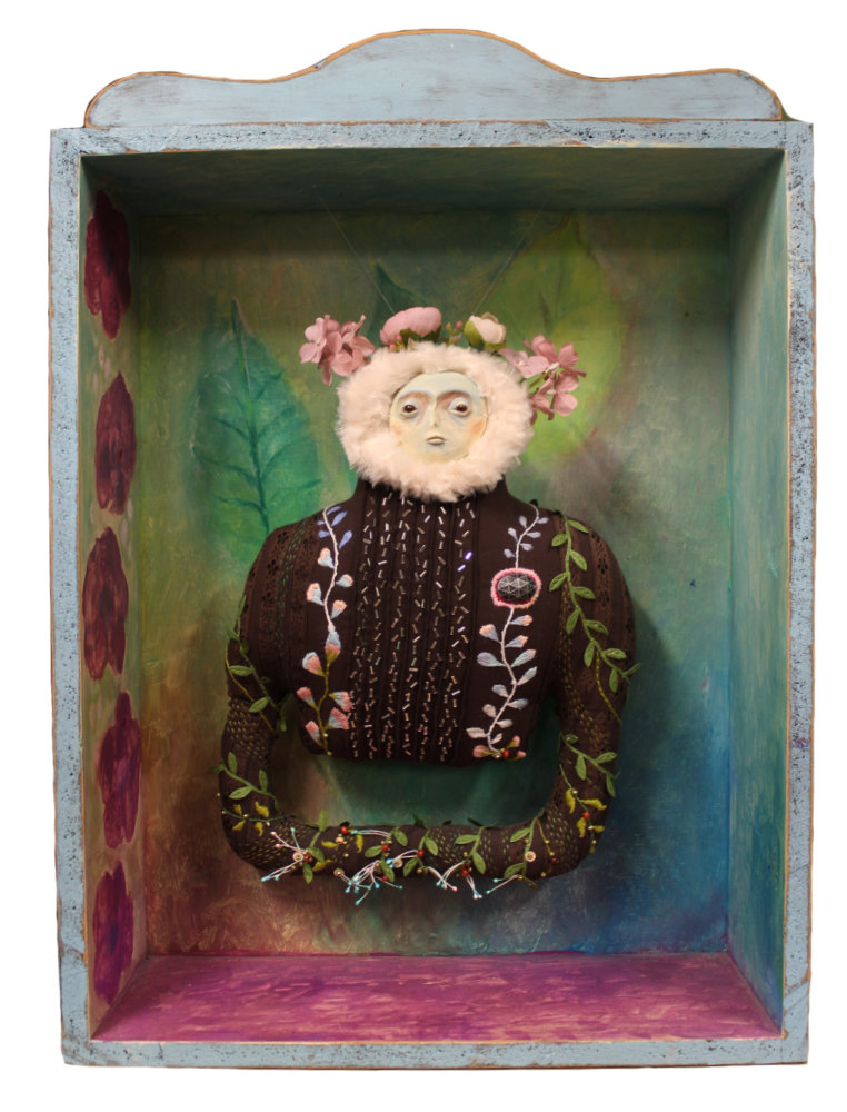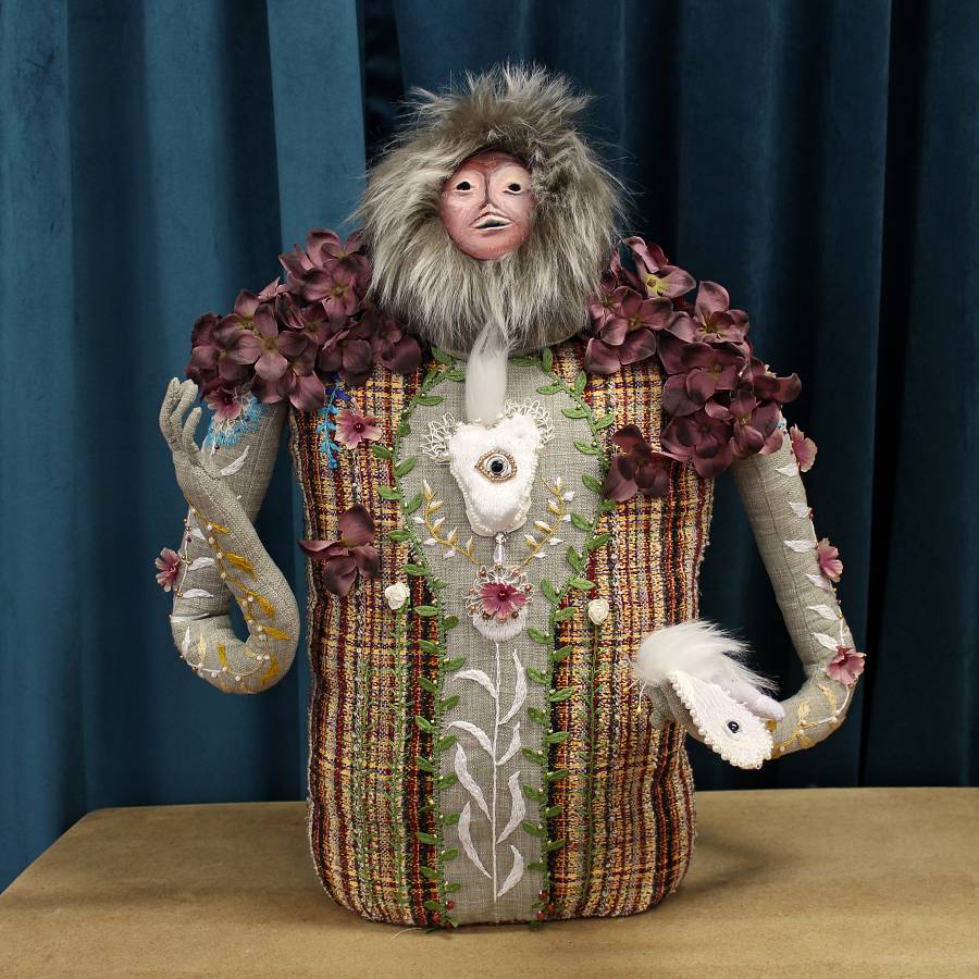 Mohutný genius loci, duch s můrkou. Textilní soška je vysoká 55 cm.
