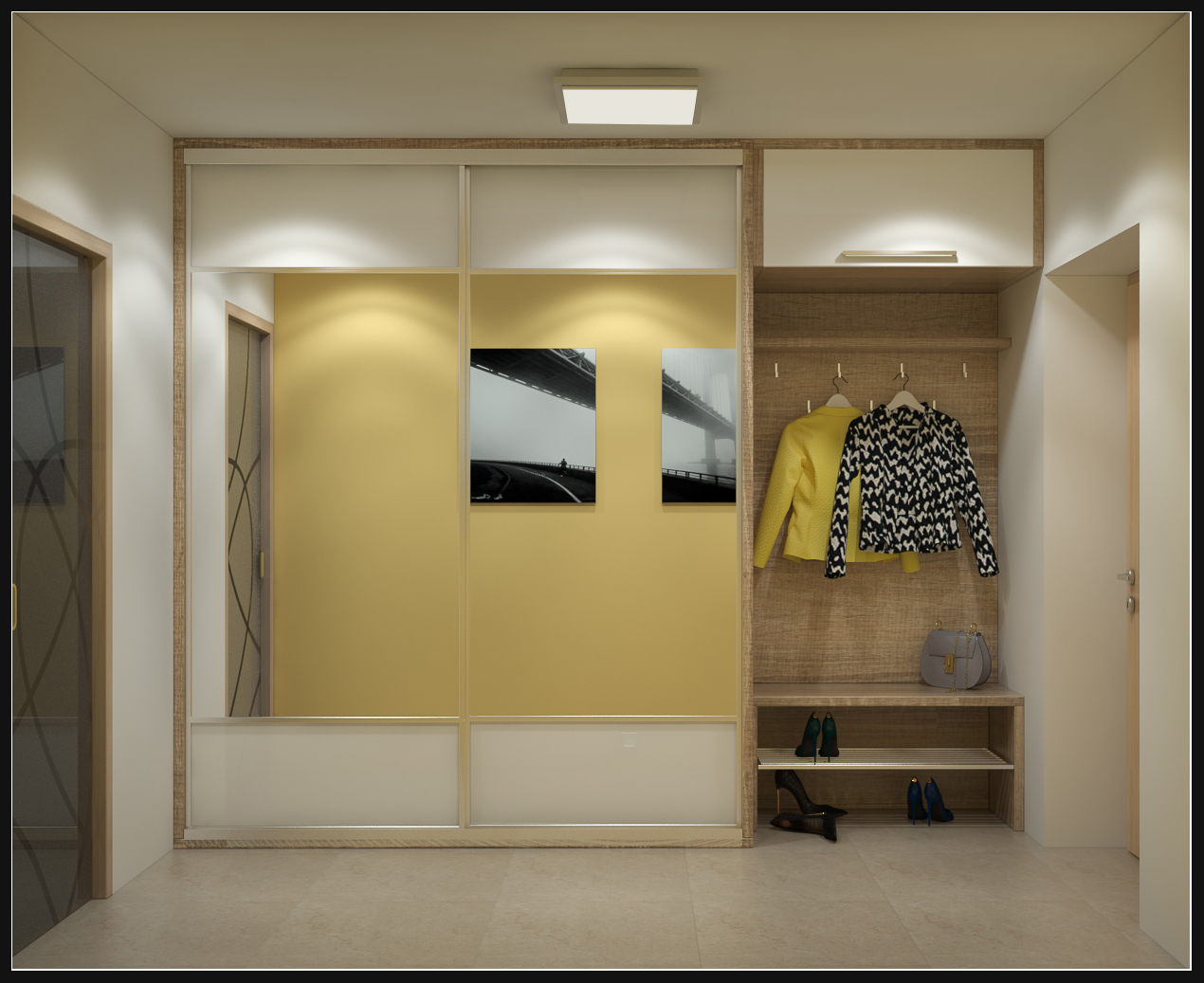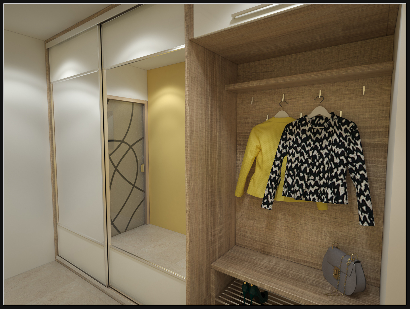 Vstupní předsíň s velkou vestavěnou skříní, věšákovou stěnou v pastelových barvách.