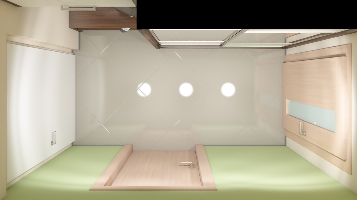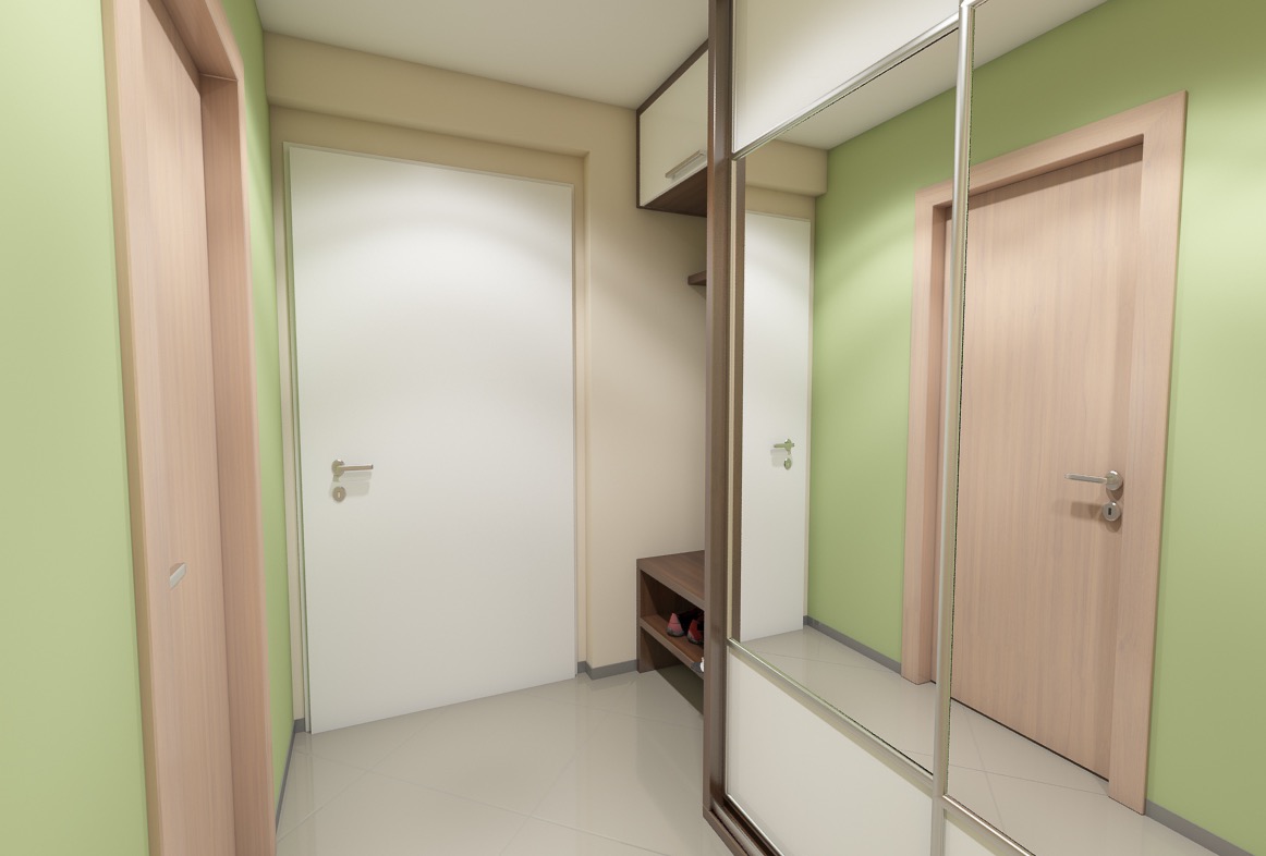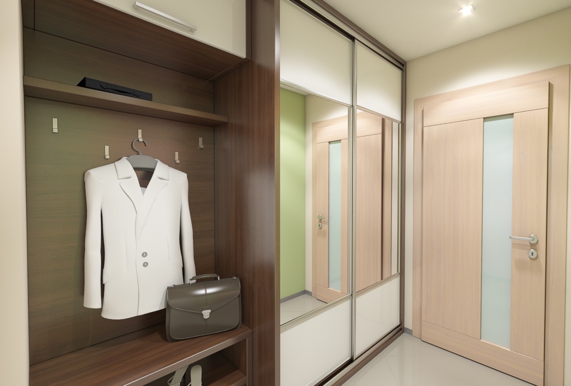 Vstupní předsíň s otevřeným botníkem, věšákovou stěnou a většinou skříni v tmavém laminu a zelenou malbou.
