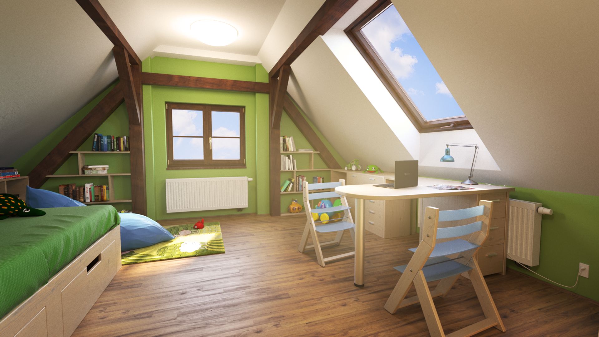 Dětský pokoj v podkroví s úložným prostorem a stolem do prostoru.