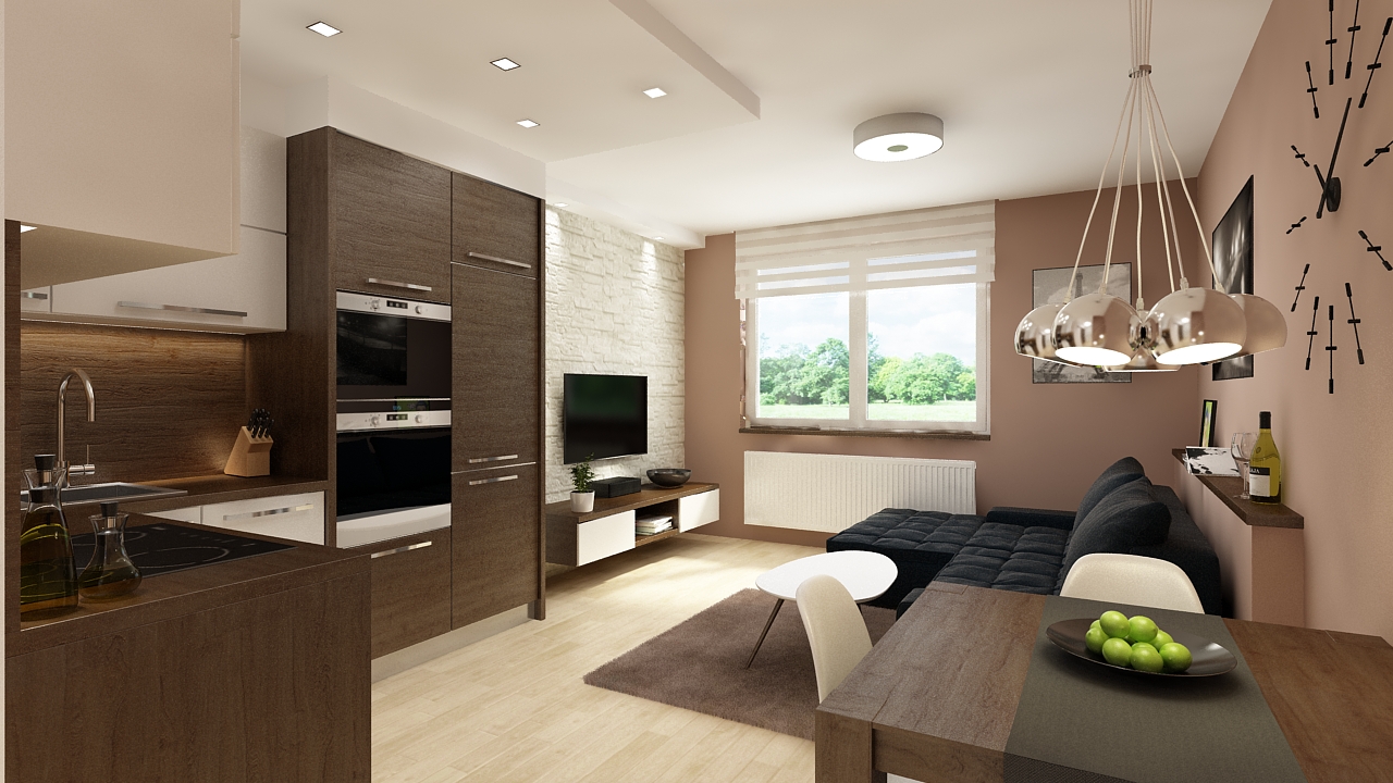 Byt se skládá z ložnice a obývacího prostoru. V hlavním obývacím prostoru na sebe navazují tři funkční zóny - kuchyňský kout, jídelní prostor a obývací část. Tyto praktické zóny jsou velkou výhodou, protože ztvárňují dokonale sladěný celek. Kompaktní kuchyně v sobě spojuje praktické využití s komfortem a elegancí, je vyrobena z materiálu lamino (LTD) v dekoru dřeva tmavý dub a bílý lesk. Kuchyně disponuje různými otvíracími systémy, vestavěnými spotřebiči a je uspořádaná do "L". Na malém prostoru a ve stylovém designu budete mít vše na dosah ruky. Jídelní prostor je místo, kde si můžete s přáteli vychutnat své pokrmy u společného stolu, který je vyroben z materiálu lamino (LTD) v dekoru dřeva tmavý dub. Obývací část se sedací soupravou s čalouněním v černé barvě je ideálním místem pro odpočinek. V centru místnosti je umístěný otočný panel s TV a pod ní umístěný moderní stolek. Ložnice je vybavena 2-dvéřovou skříní, kde najdete poličky a šatní tyč pro perfektní organizaci Vašich oděvů. Dále zde najdeme úložný prostor s vyklápěcími dvířky, dva noční stolky a dvoulůžkovou postel se zvýšenou ložní plochou pro usnadněné vstávání, která navíc obsahuje praktické zásuvky. Vše je vyrobeno z materiálu lamino (LTD) v dekoru dřeva tmavý dub a bílá matná. Celý byt je nejen chytře vyřešený, ale především perfektně sladěný, útulný a díky rovným liniím působí čistě a přehledně.