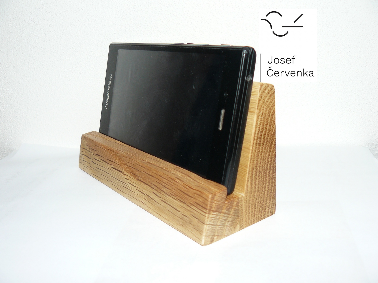 Stojánek na telefon je vyrobený z masivního dřeva.