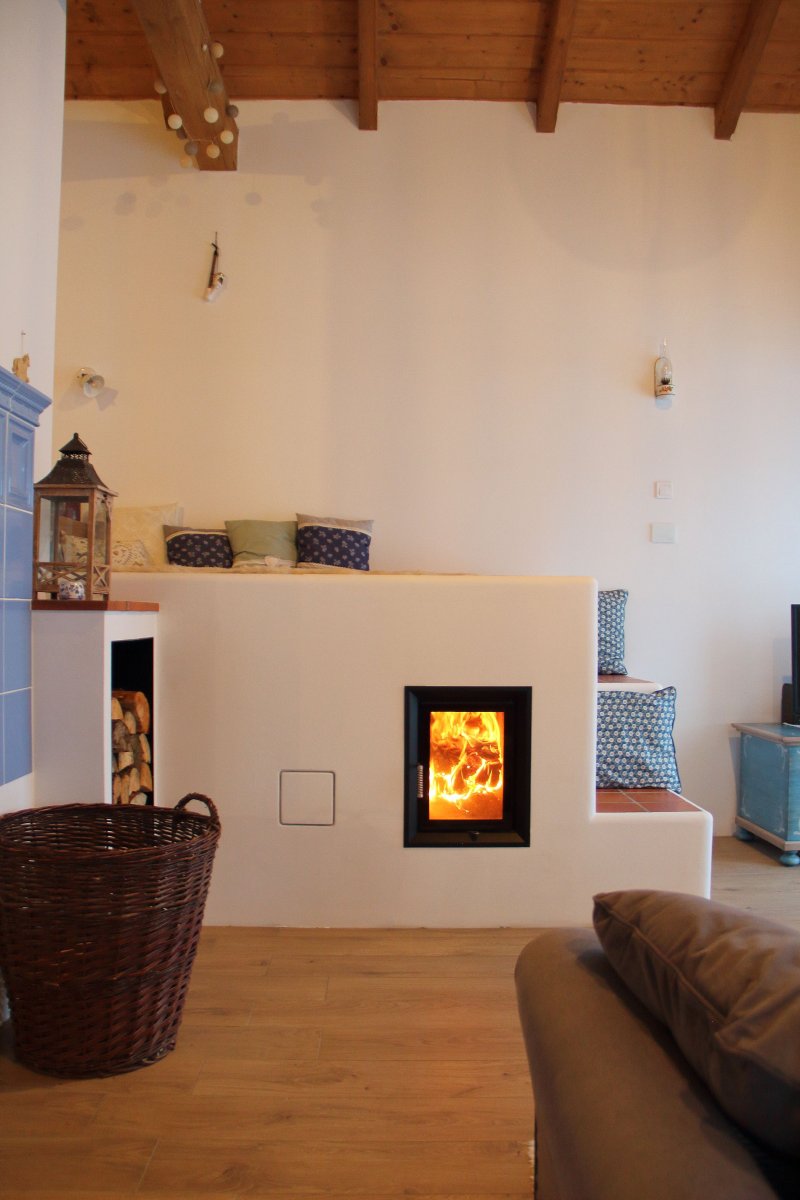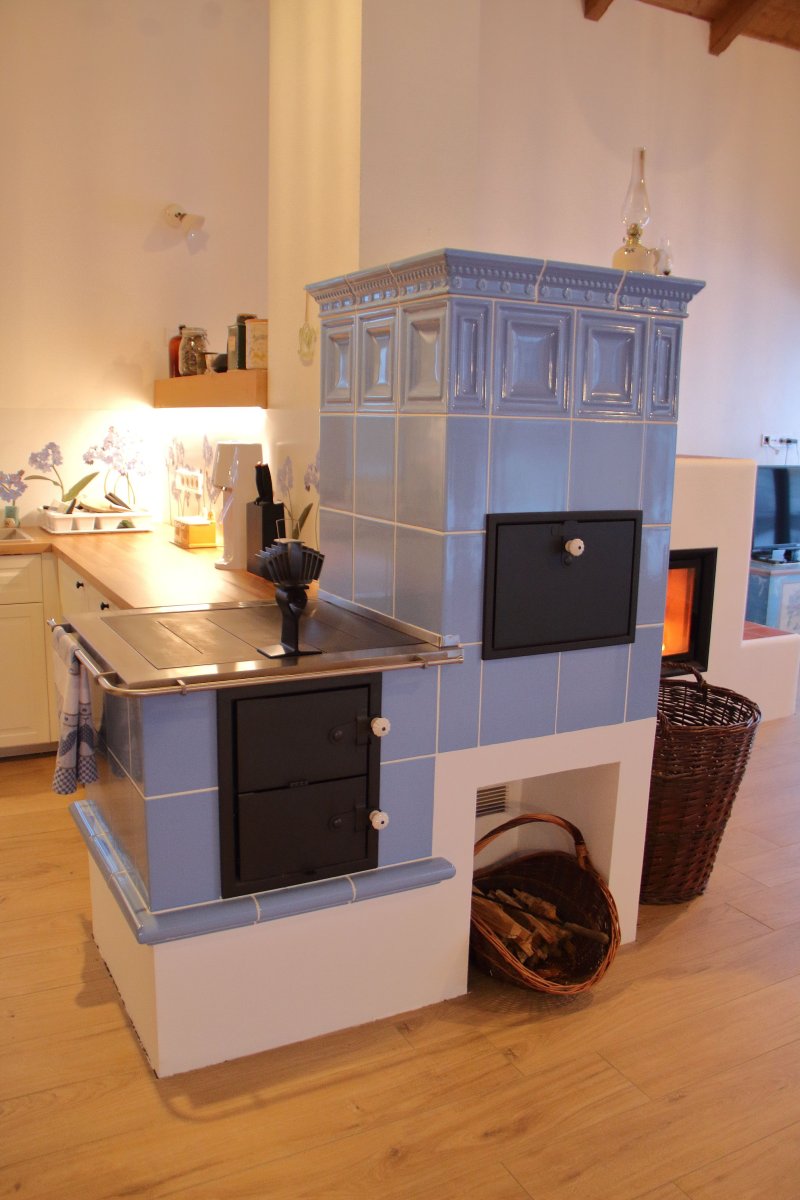 Kachlový sporák ideální na vaření, pečení a přitopení mimo hlavní topnou sezónu. Ocelová plotna s provětraným rámem navazuje na kuchyňskou linku. V kobce na nachází trouba na pečení.