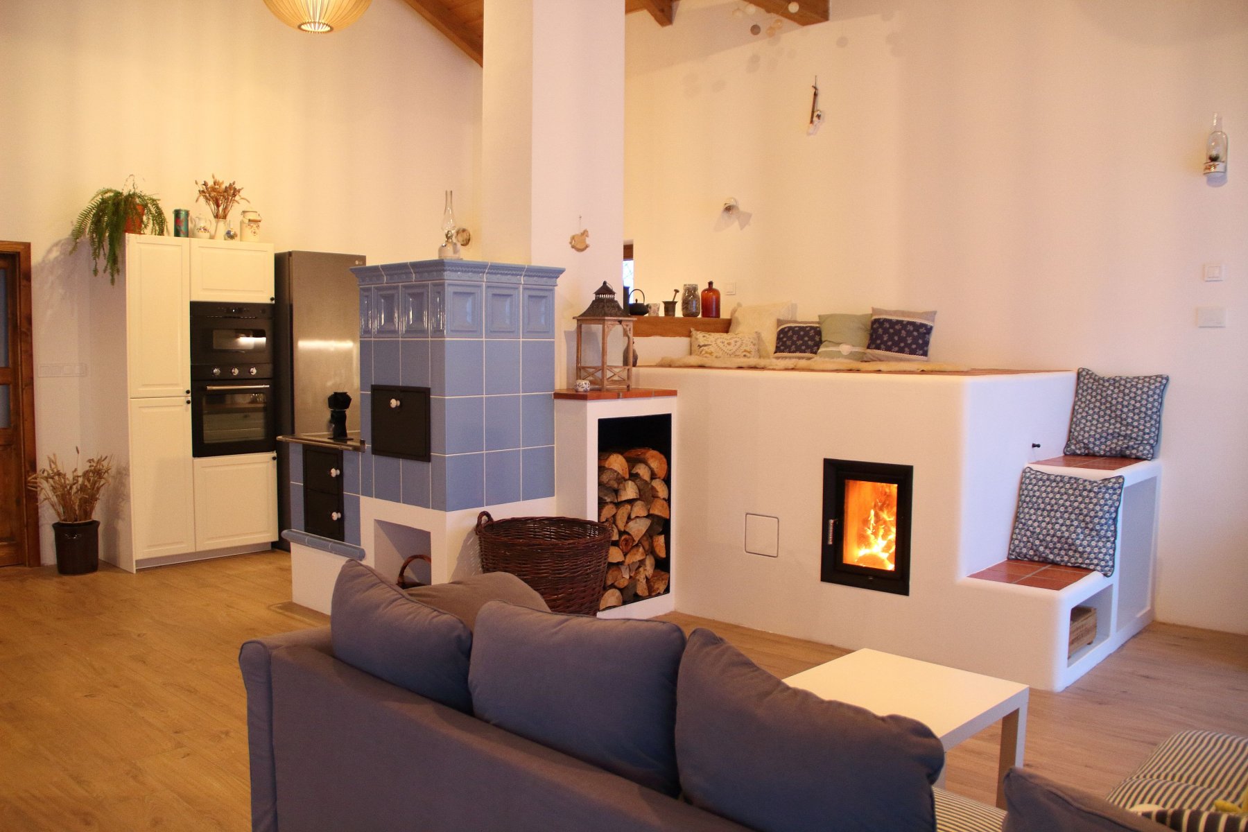 Dvě topidla - kachlový sporák určený primárně na vaření a akumulační kamna s tahovým systémem, který vyhřívá ležení, za účelem vytápění.