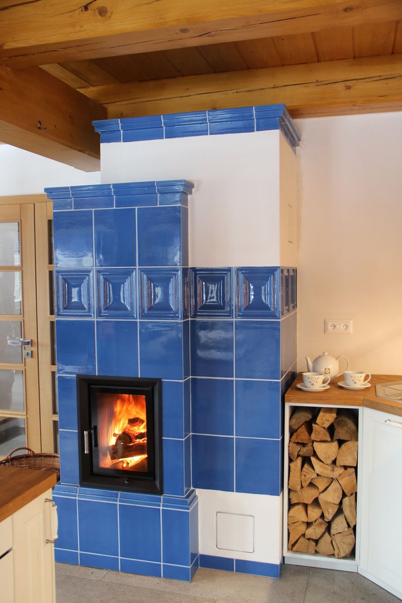 Vzhled kamen určují keramické kachle. V tomto konkrétním případě jsou použity hladké kachle ve formátu 28x22 cm a na jednu řadu kachle se vzorem Kazeta. Glazura je v sytě modré barvě a z našeho pohledu skvěle podtrhuje charakter venkovského stavení. Římsa kamen se nazývá Fenestra. Je dobré si říct, že kachle neslouží k obkladu, ale jedná se přímo o stavební prvek. Historicky kachle vyráběli hrnčíři z hlíny a před dokončením je vypalovali ve svých pecích. V dnešní době se kachle vyrábí už modernějším postupem než dřív, a to litím do sádrových forem.