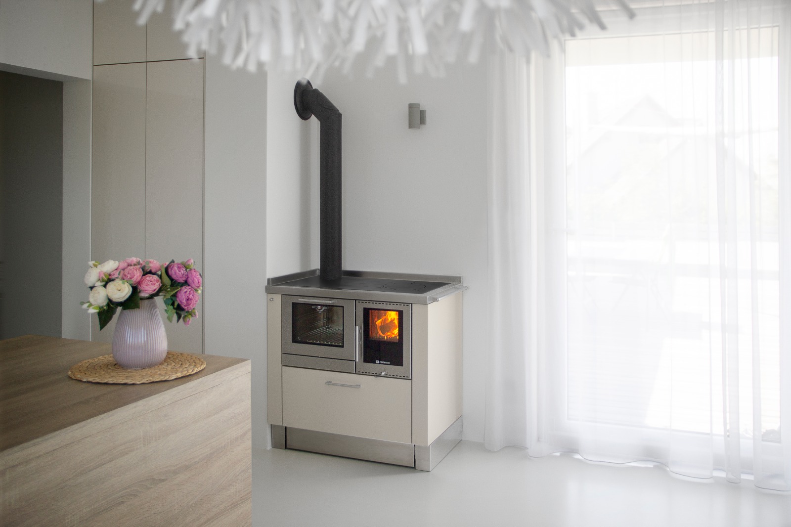 Jelikož je kuchyně laděná do světlých barev, jsou kamna na přání zákazníka ve stejném odstínu jako kuchyňská linka – boční strany a zásuvka jsou ve slonovinovém odstínu a dvířka s rámem plotny v nerezu. Abychom měli jistotu, že kamna budou ve stejném odstínu jako kuchyňský nábytek, bylo potřeba barvu přesně definovat pomocí mezinárodního označení barev – RAL.