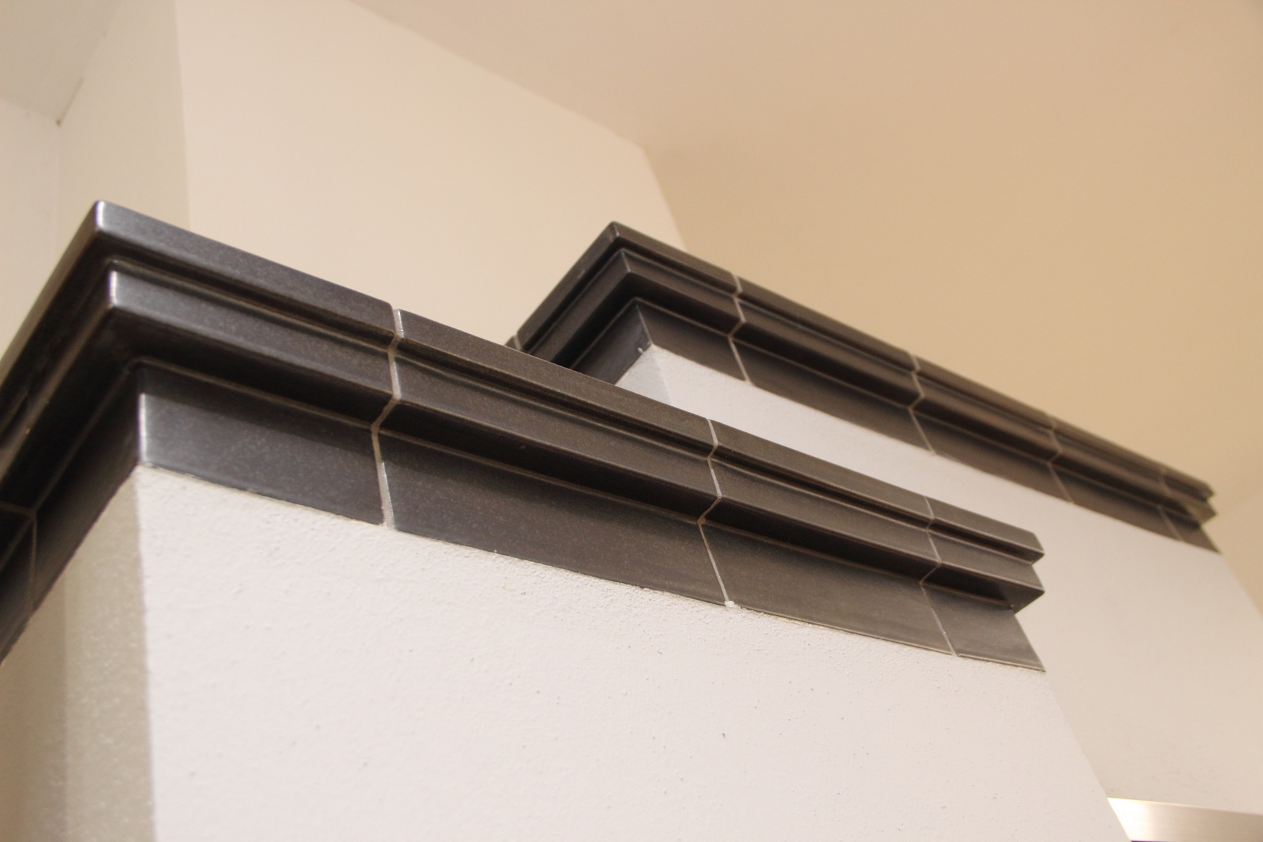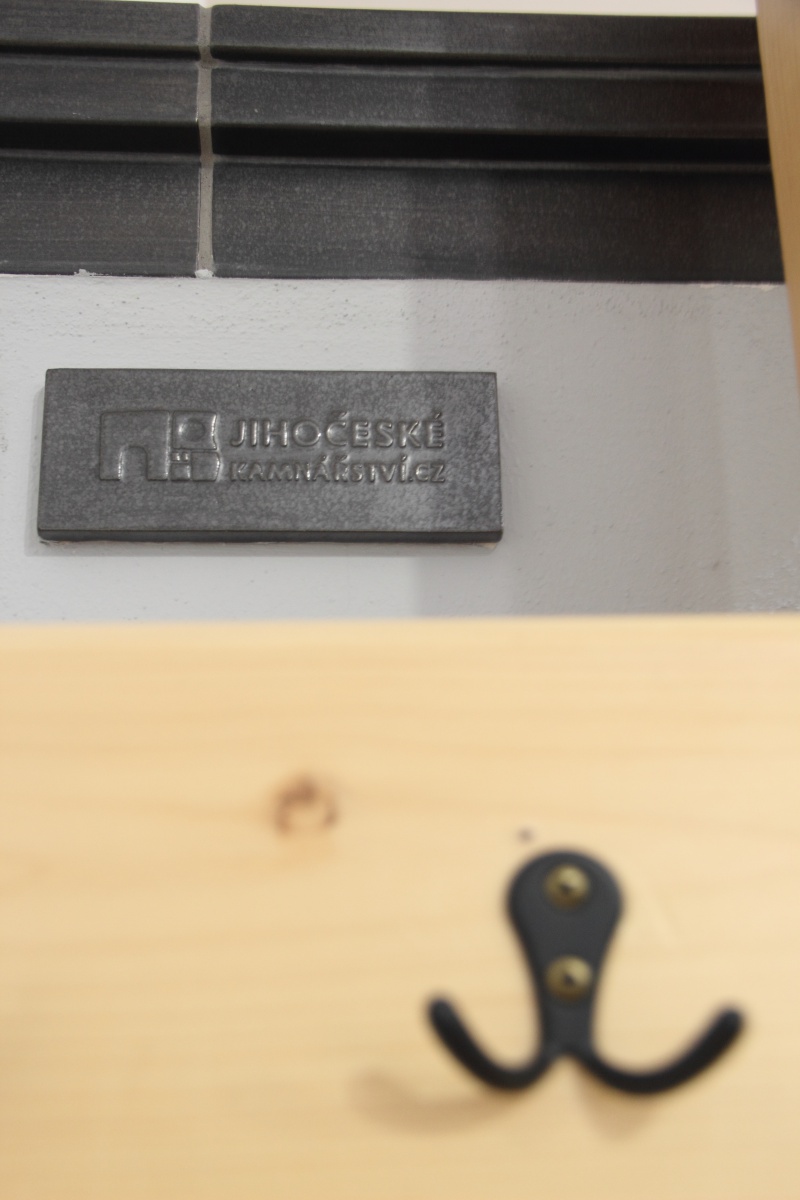 Zákazník si vybral vložku značky Hoxter s nerezovým rámečkem. Kachle na záklopu pochází z dílny bechyňské firmy K&K Poker, jedná se o kovově šedou glazuru a zvolená římsa nese název Fenestra. Štukové plochy jsou namalovány světle šedým odstínem, který koresponduje se zvolenou glazurou.
