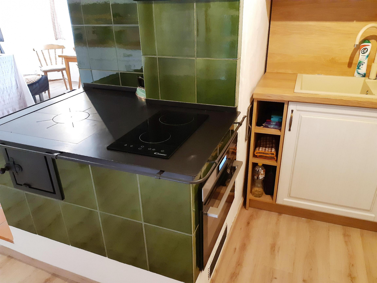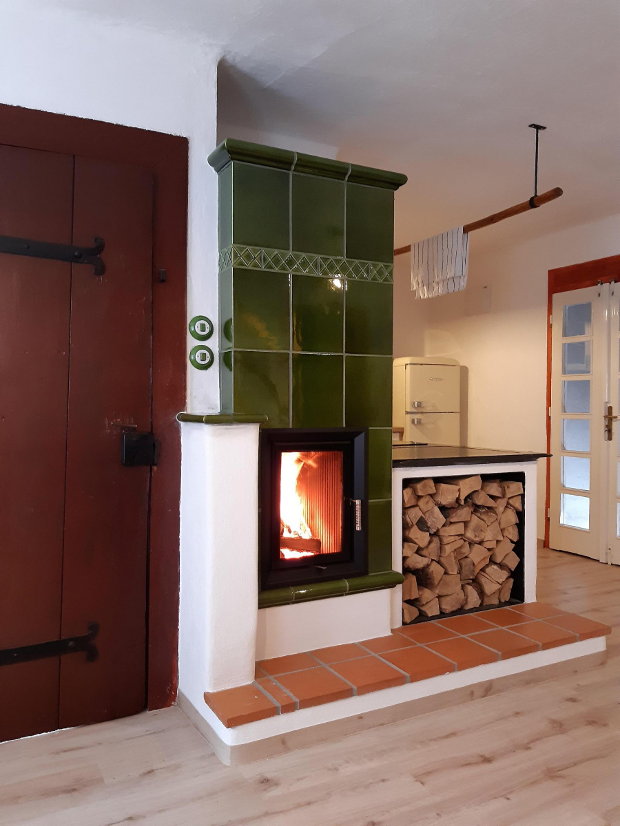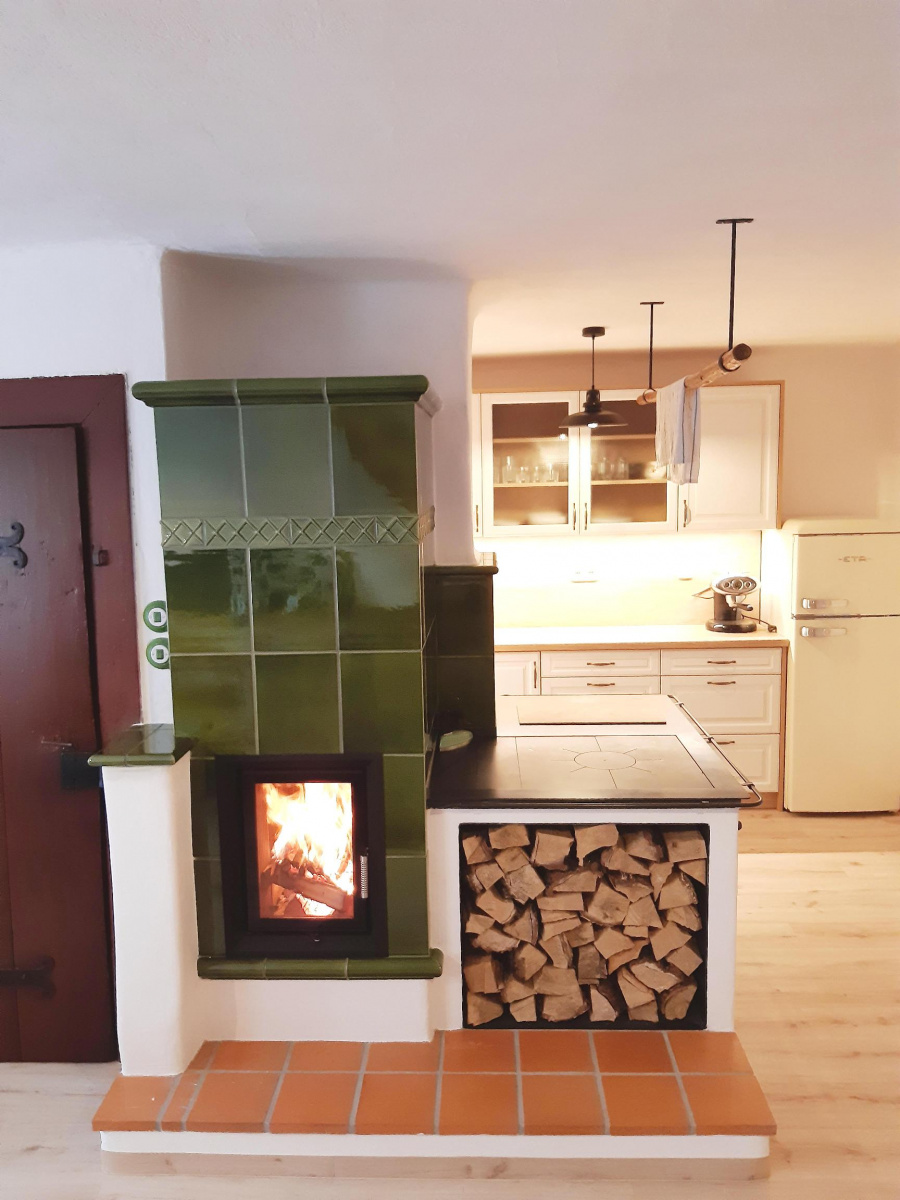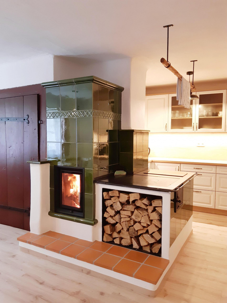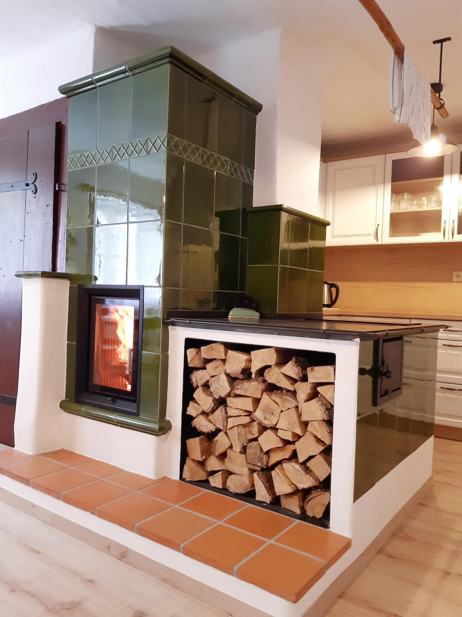 Možná si říkáte, jak je možné, že je dřevník umístěn přímo pod plotnou? Jak se plotna natopí? Nenatopí. Kachlový sporák je jen na oko.
