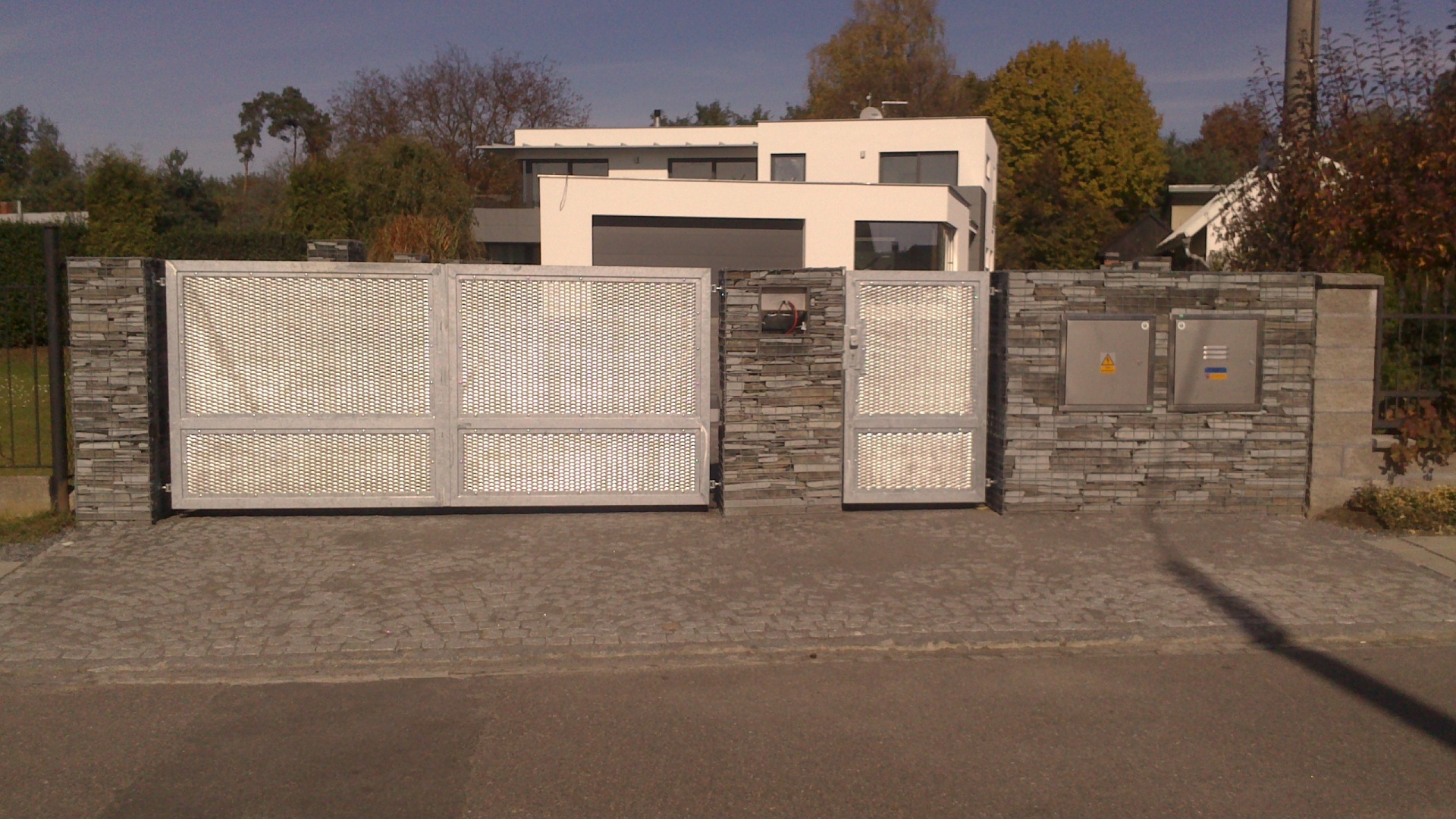 Gabiony vystavěné z gabionových sítí a vyplněné břidlicovým řezaným kamenem. Brána dvoukřídlá s elektro pohonem, povrchová úprava zinkováním, výplň brány a branky tahokov.