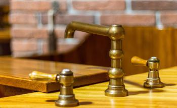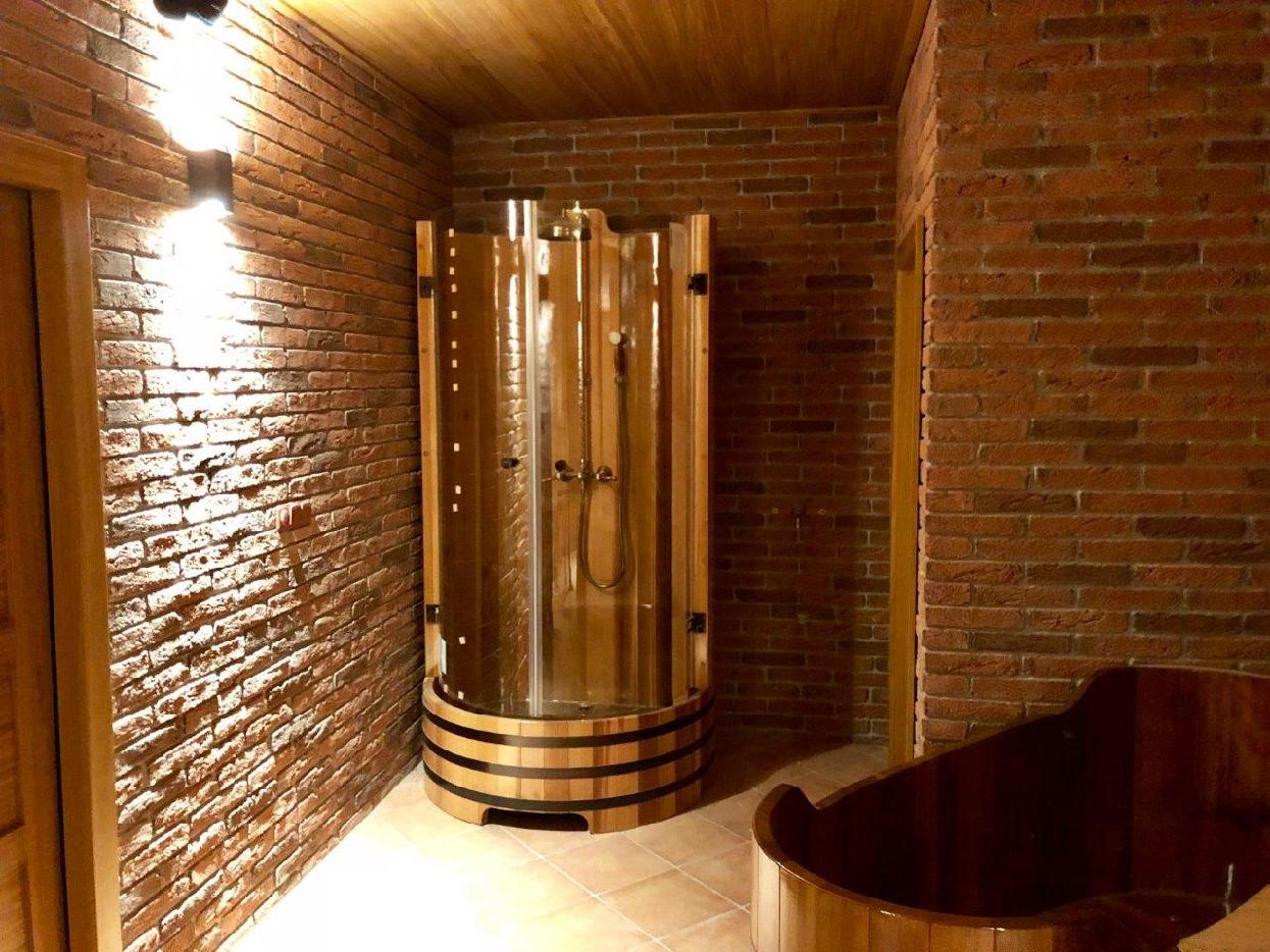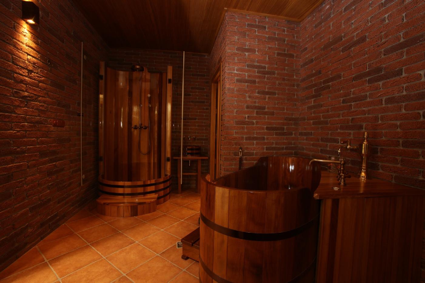 Sprchová kabina z masivního dřeva red west cedar, dno dřevo kambala, s bezrámovou sprchovou zástěnou, dřevěné umyvadlo 40 x 18 cm s deskou, dřevo kambala, vířivá vana z masivního dřeva kambala 180 x 79 x 70-80 cm s masážním air systémem, podhladinovým halogenovým osvětlením a podélným stěnovým opláštěním do prostoru. Vše doplněné vodovodními bateriemi RVB z kolekce 1935 Wood v povrchové úpravě bronze, dřevěné ovládací páčky teak.