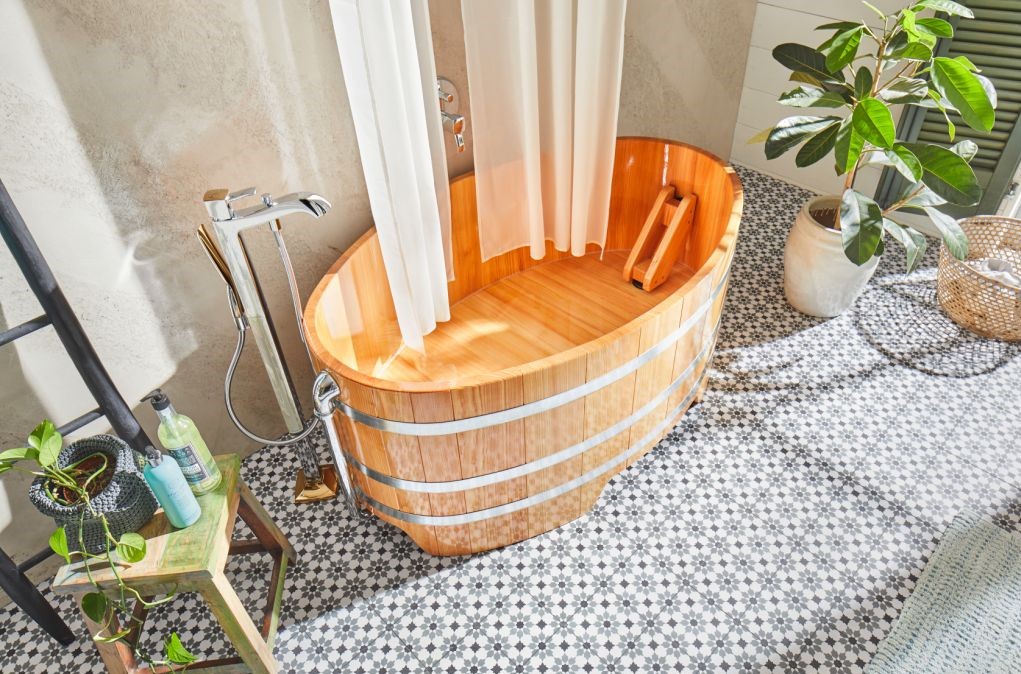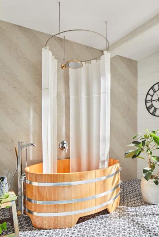Sapeka - koupací vana se sprchovým závěsem, z masivního dřeva výběrový modřín 149 x 90 x 70 cm, napínací obruče z ušlechtilé oceli, přepadový odtokový komplet v provedení chrom,