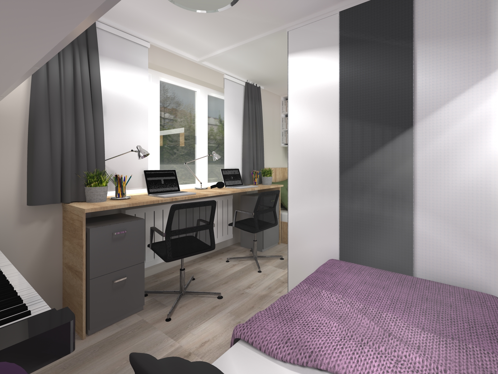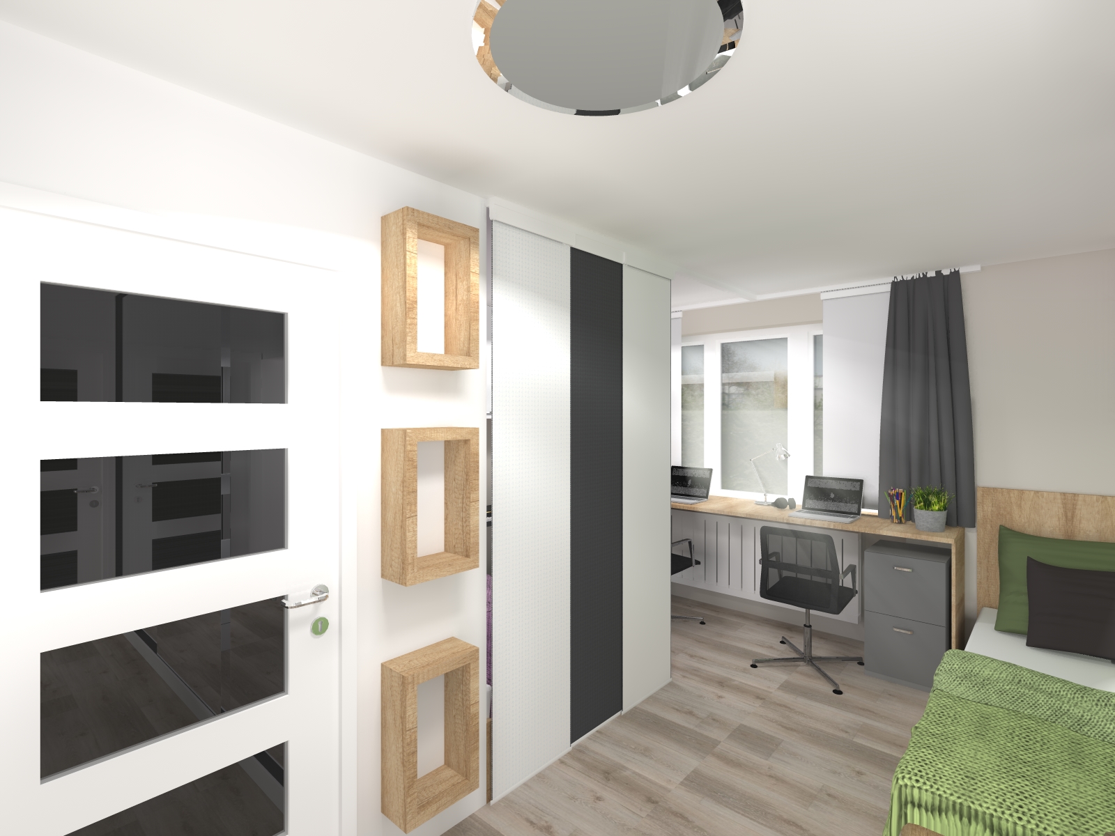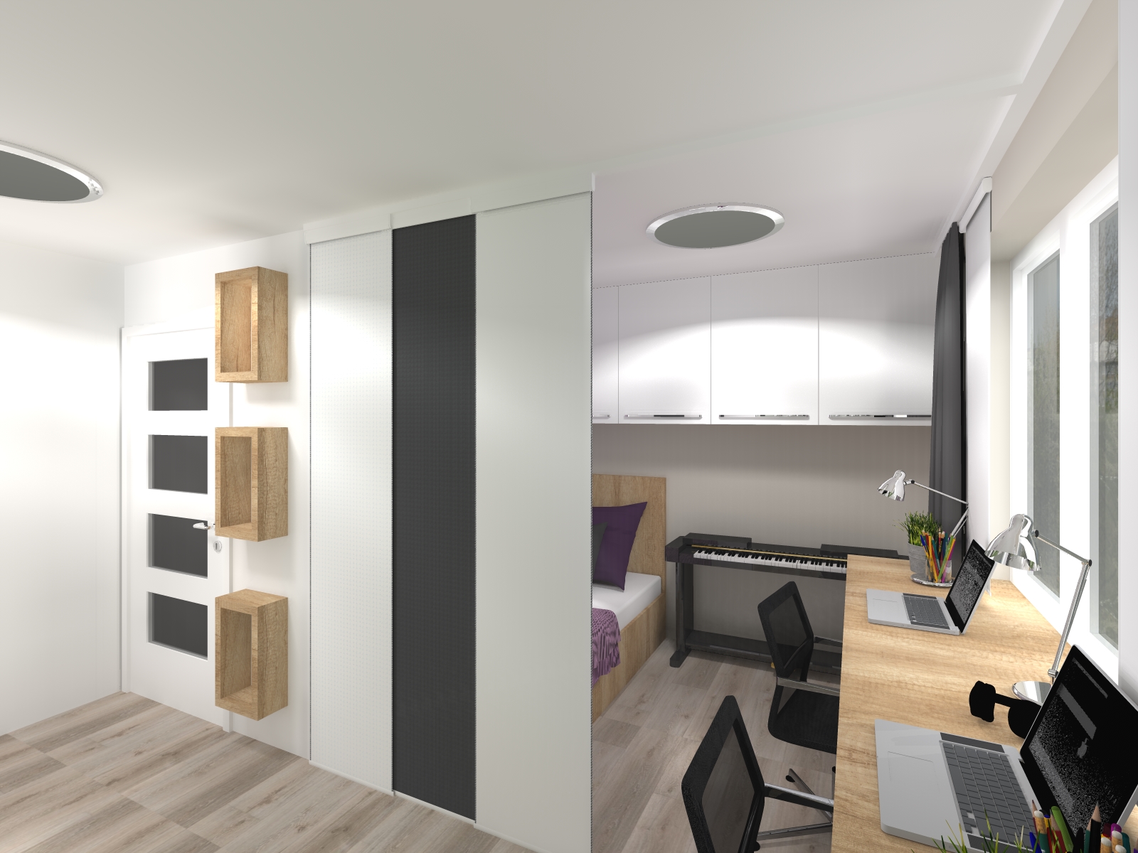 Jedním z hlavních cílů rekonstrukce interiéru tohoto bytu bylo poskytnout oddělené prostory dívce a chlapci, kteří toužili po alespoň částečném soukromí. Zároveň si oba chtěli svůj prostor přizpůsobit podle svých představ.