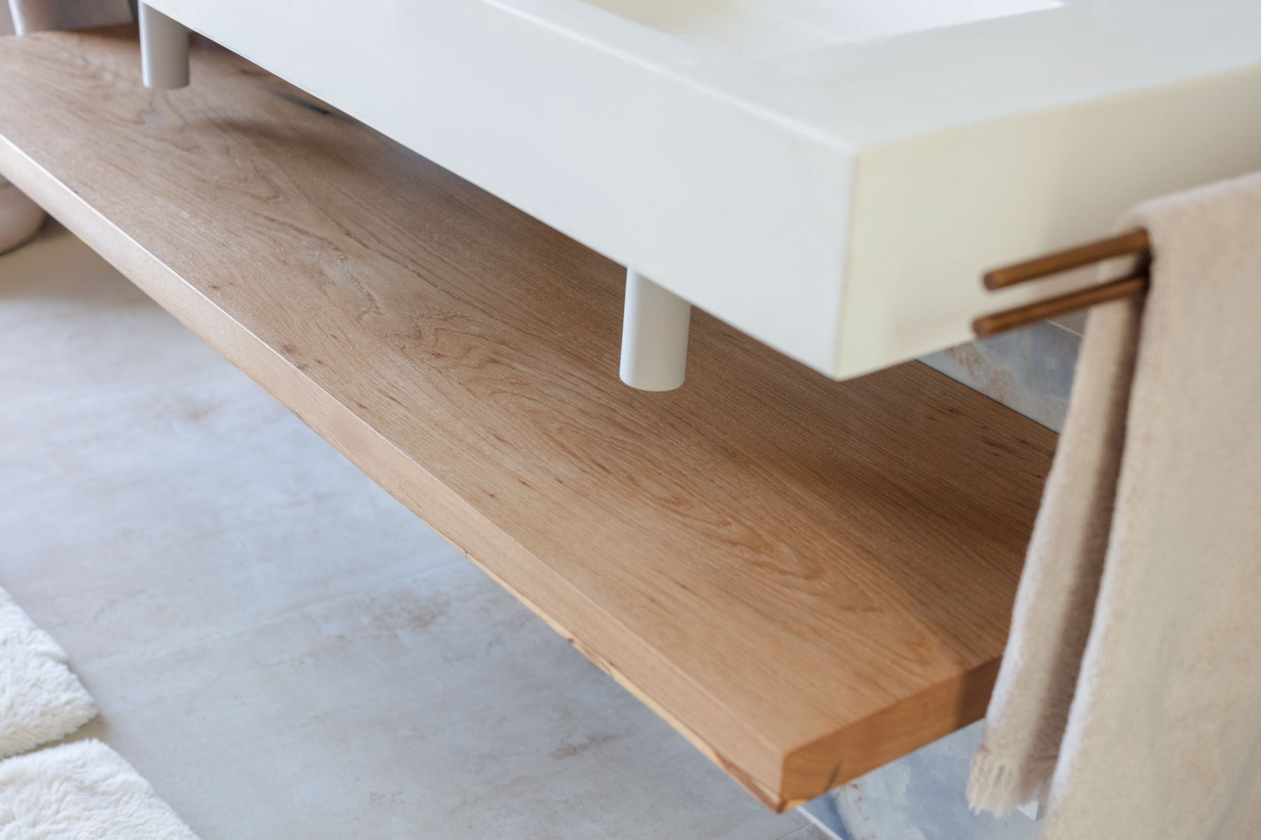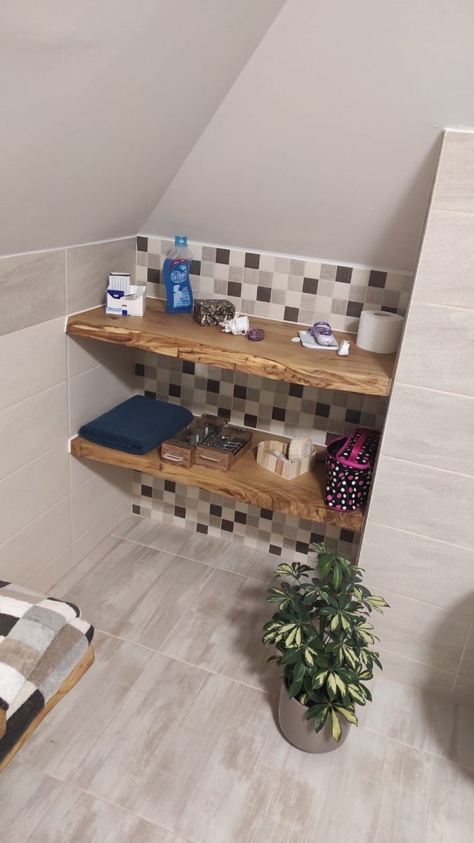 Dubové police do koupelny s neviditelnou konzolí s přírodní hranou z jednoho kusu dřeva