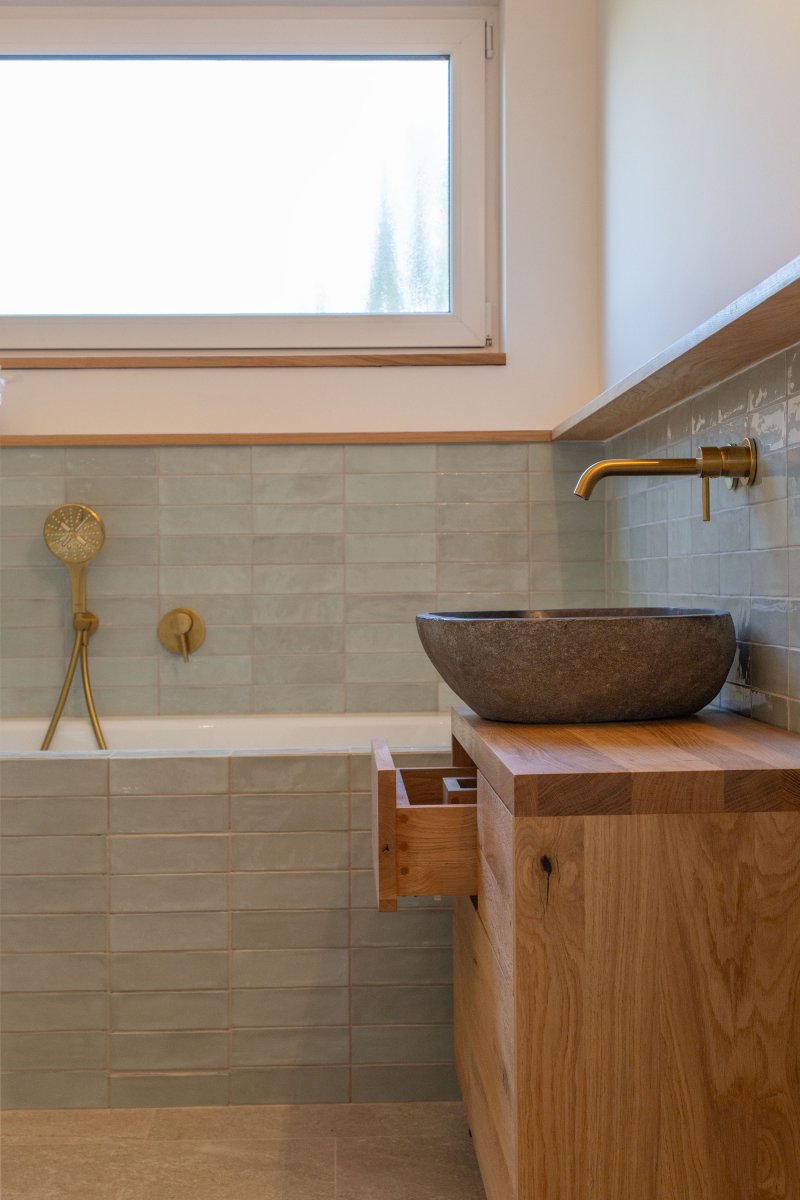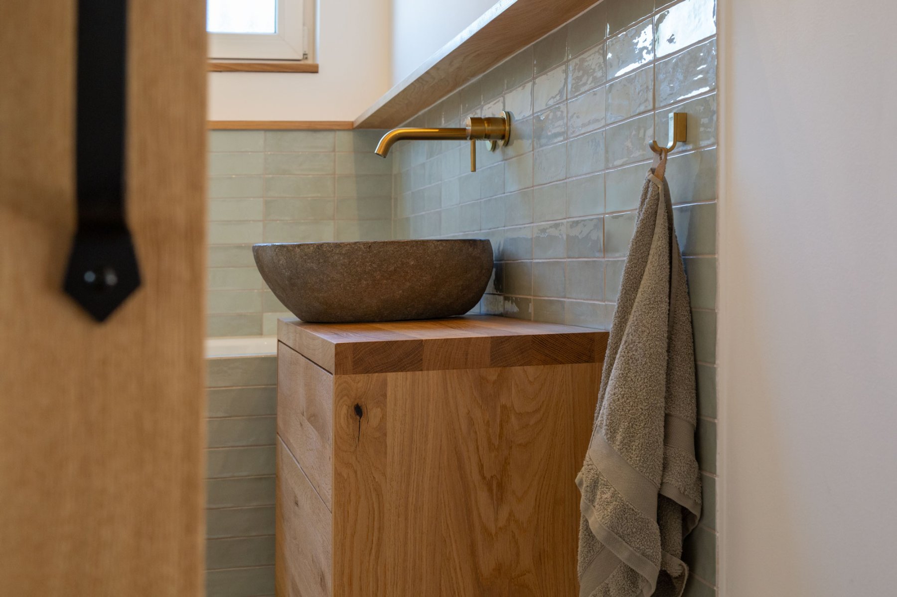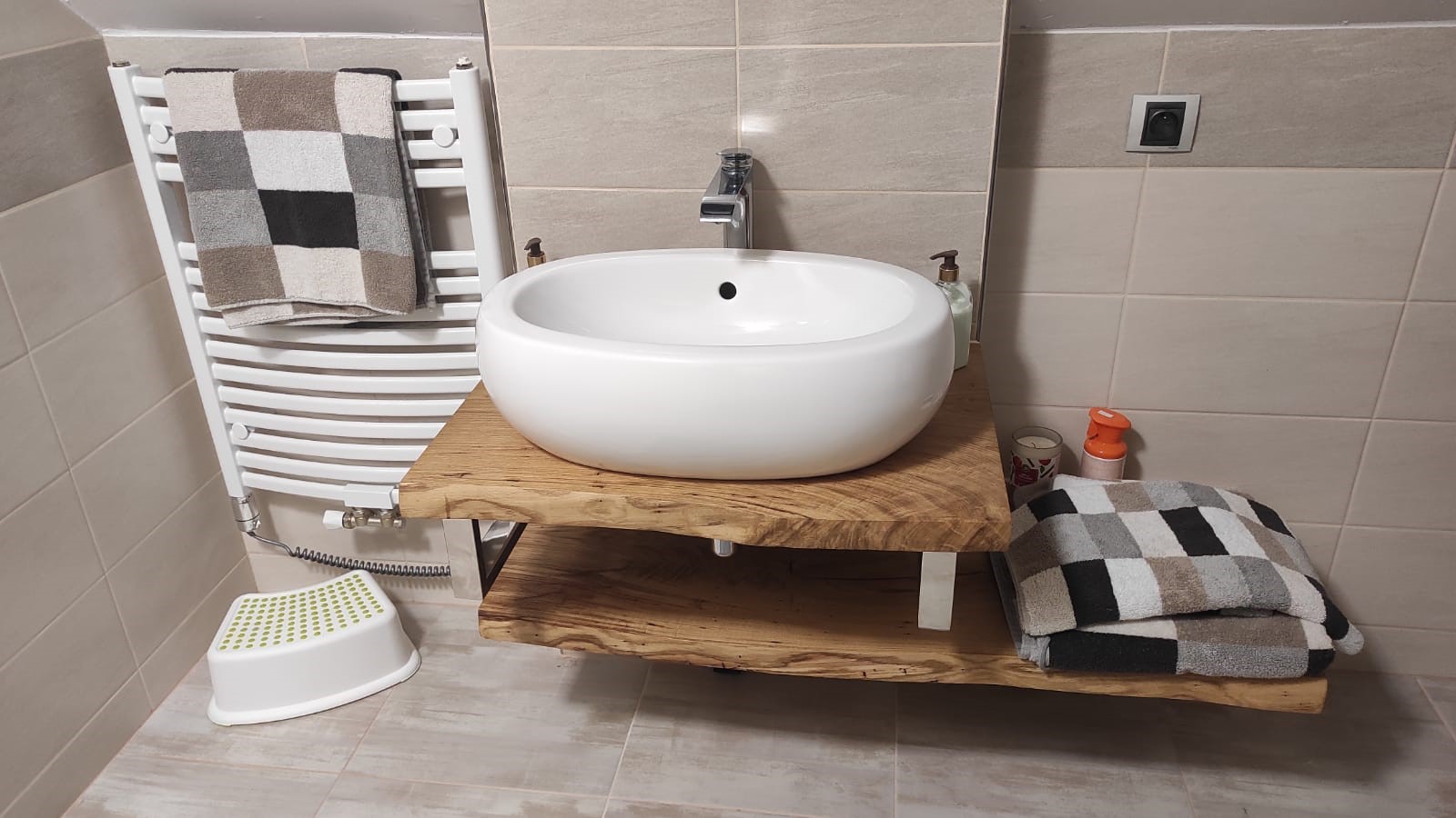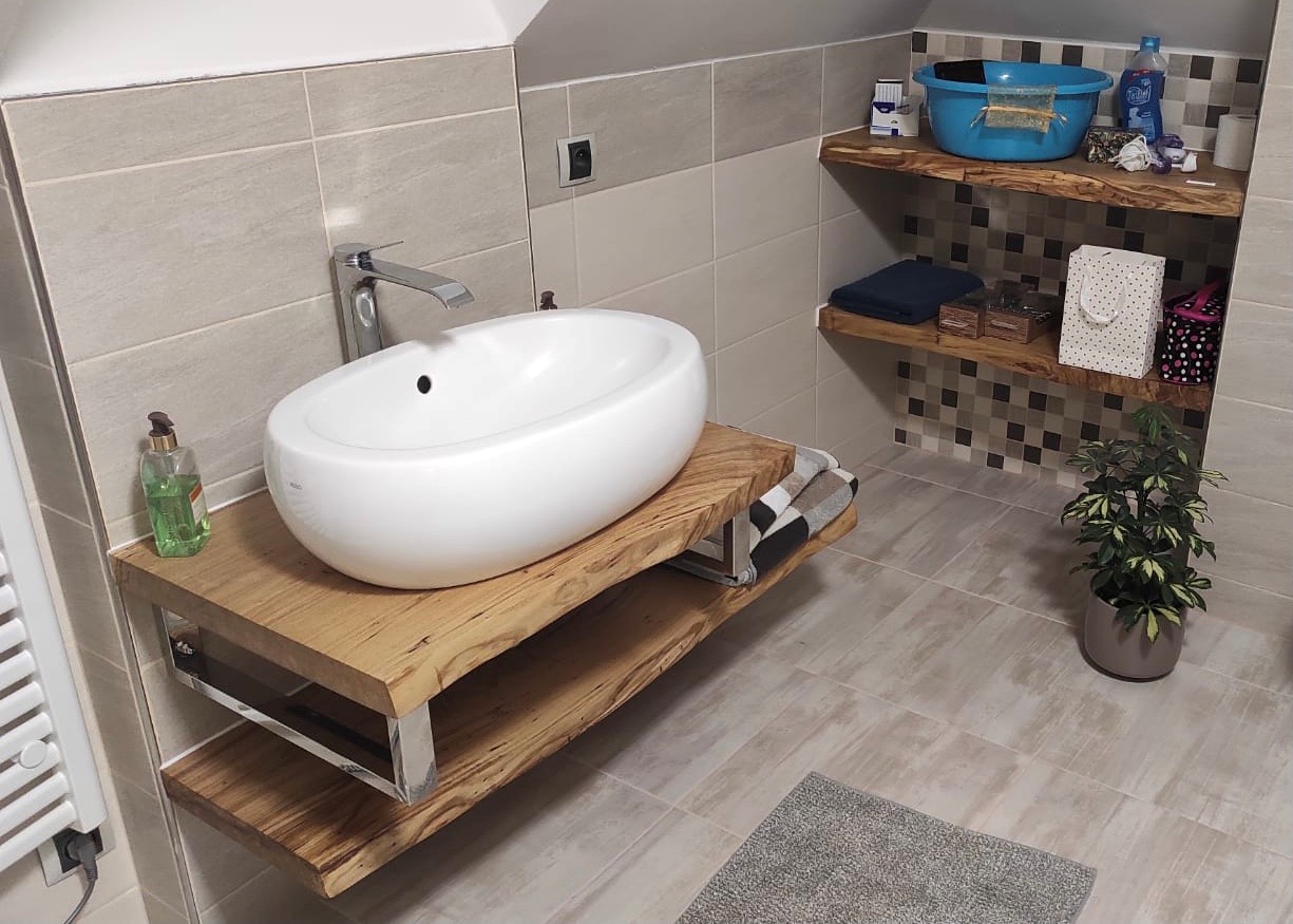 Dubová deska pod umyvadlo z jednoho kusu dřeva.