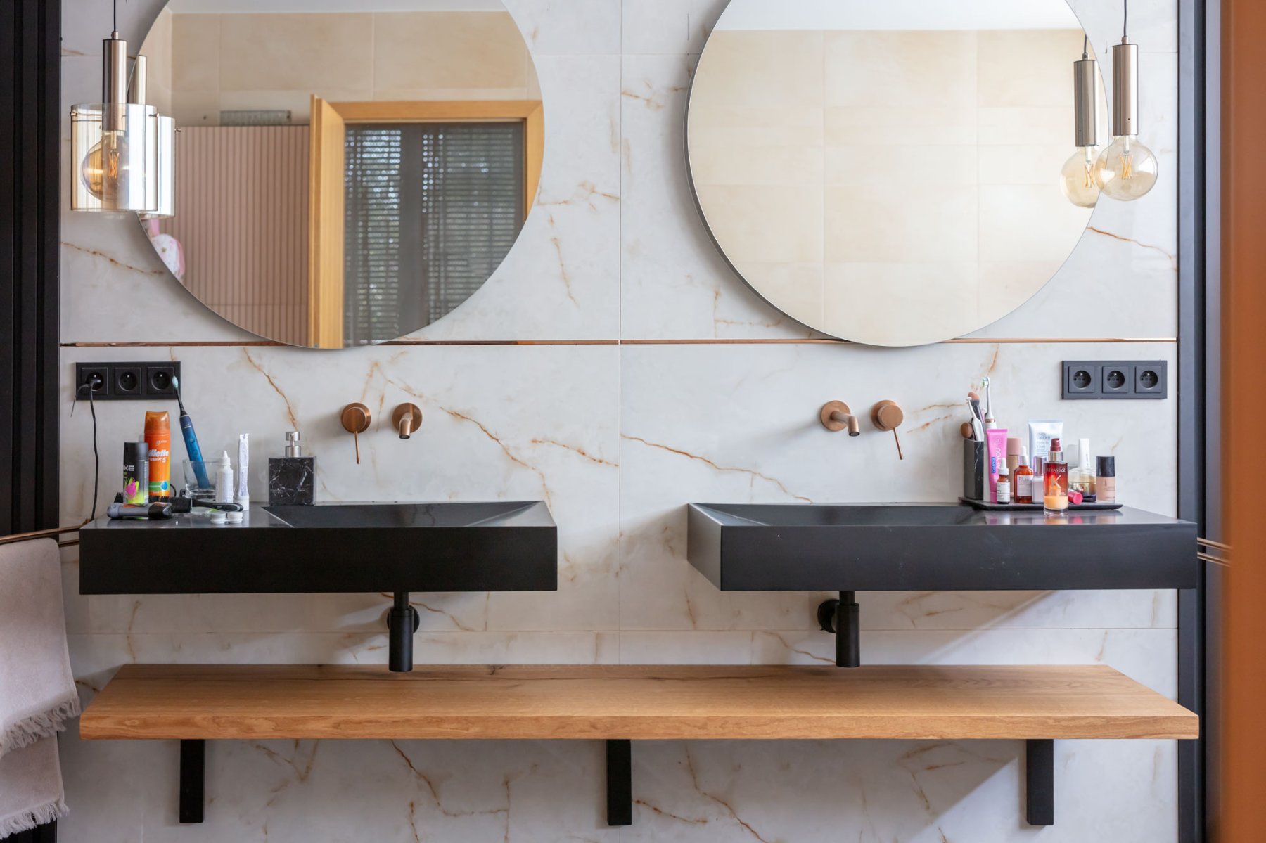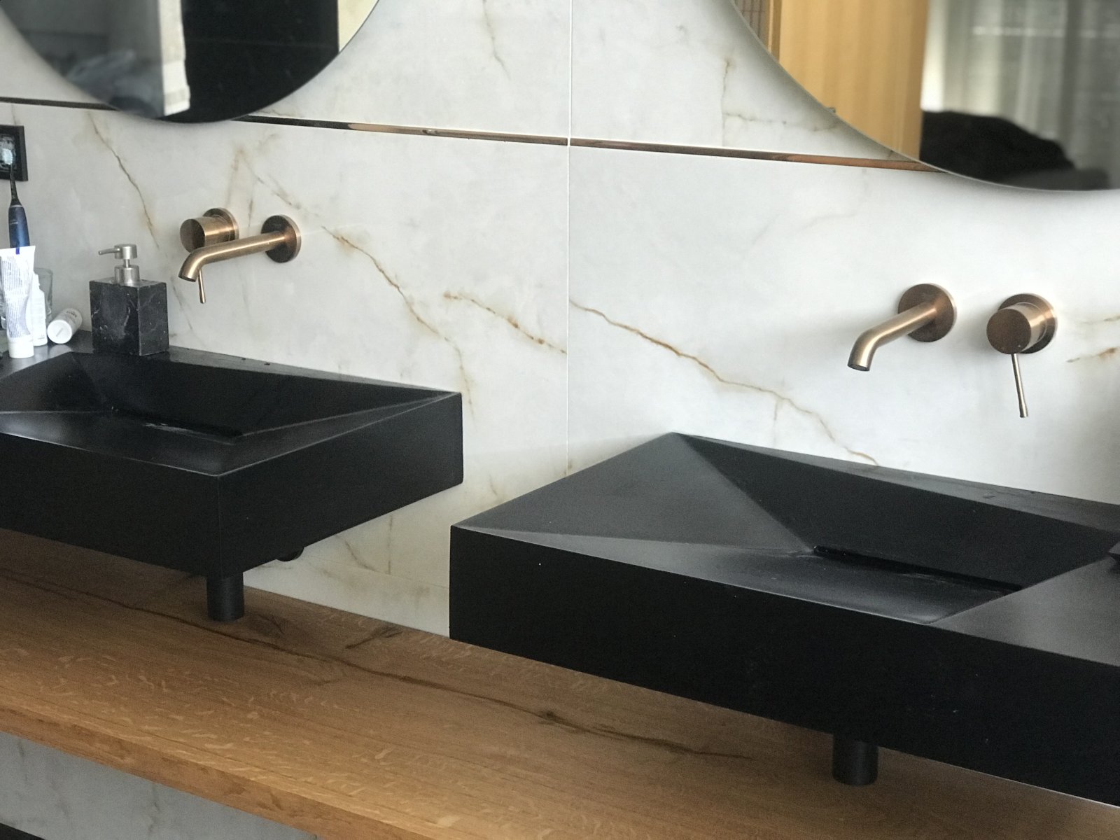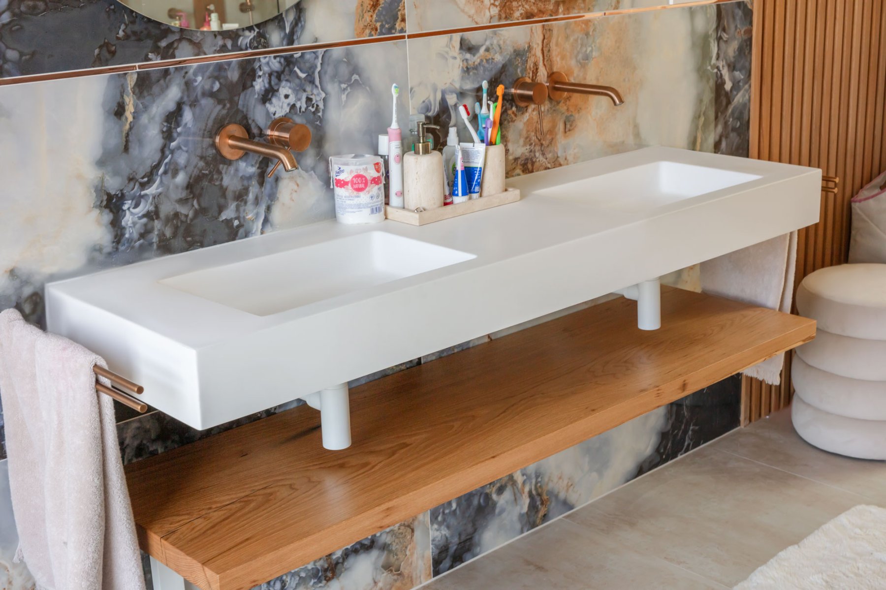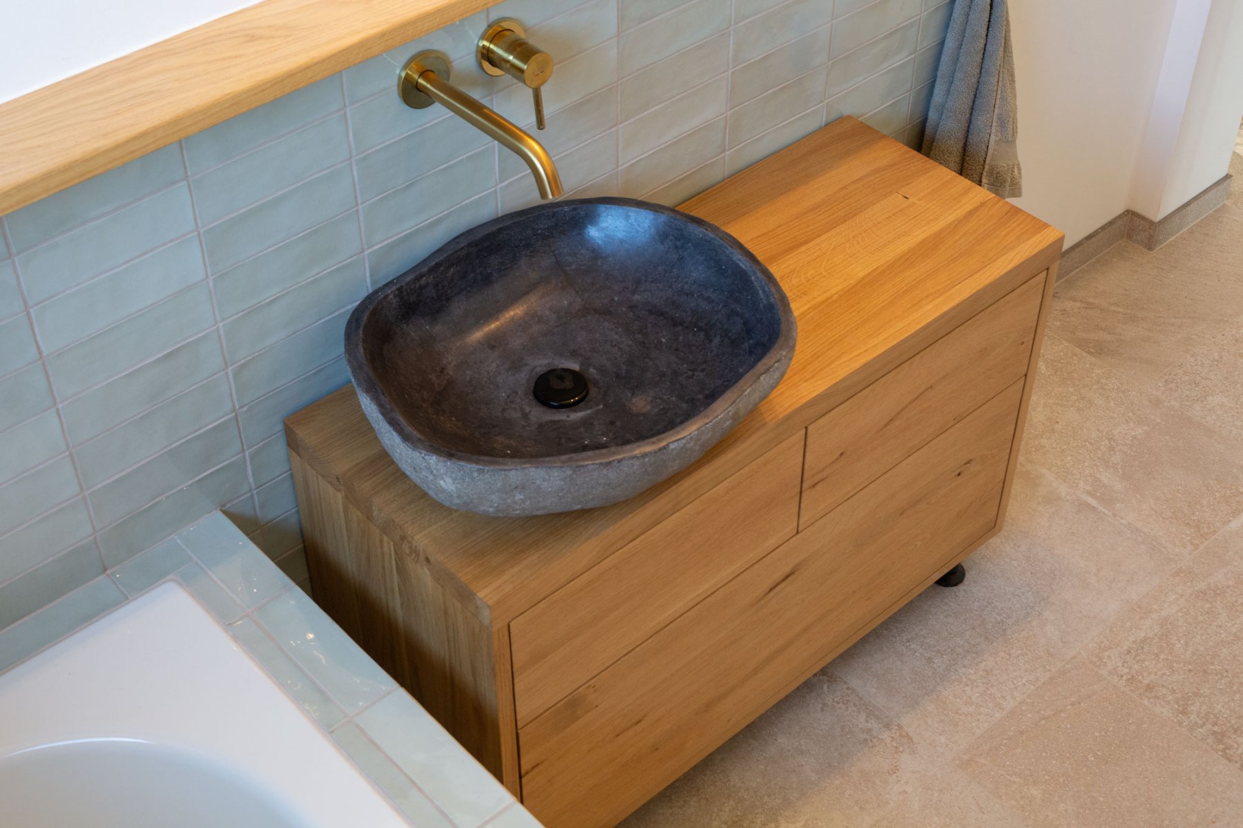Komoda z dubového dřeva na dvě umyvadla. Šuplíky s tip on otevíráním. Výroba na zakázku.