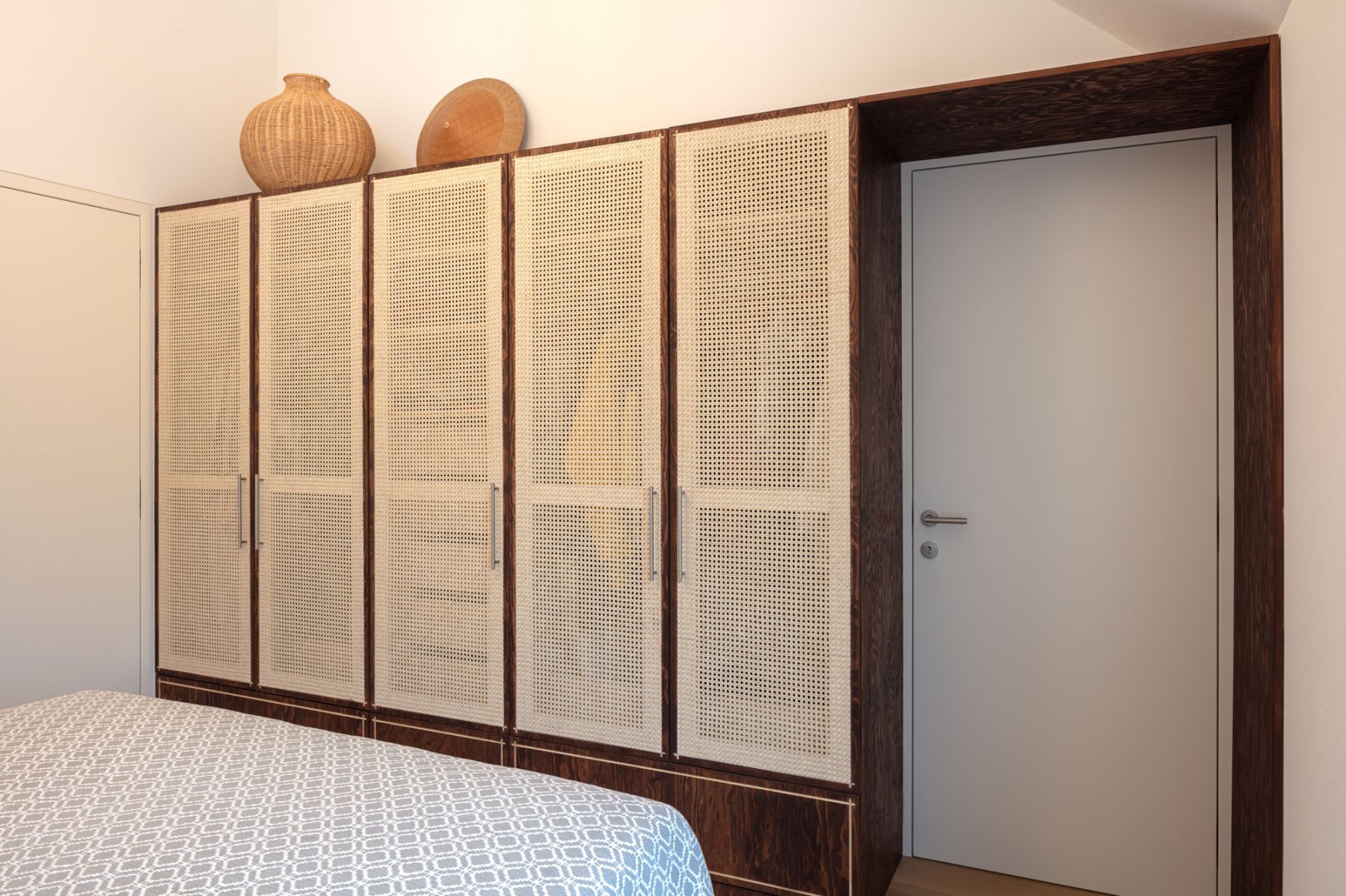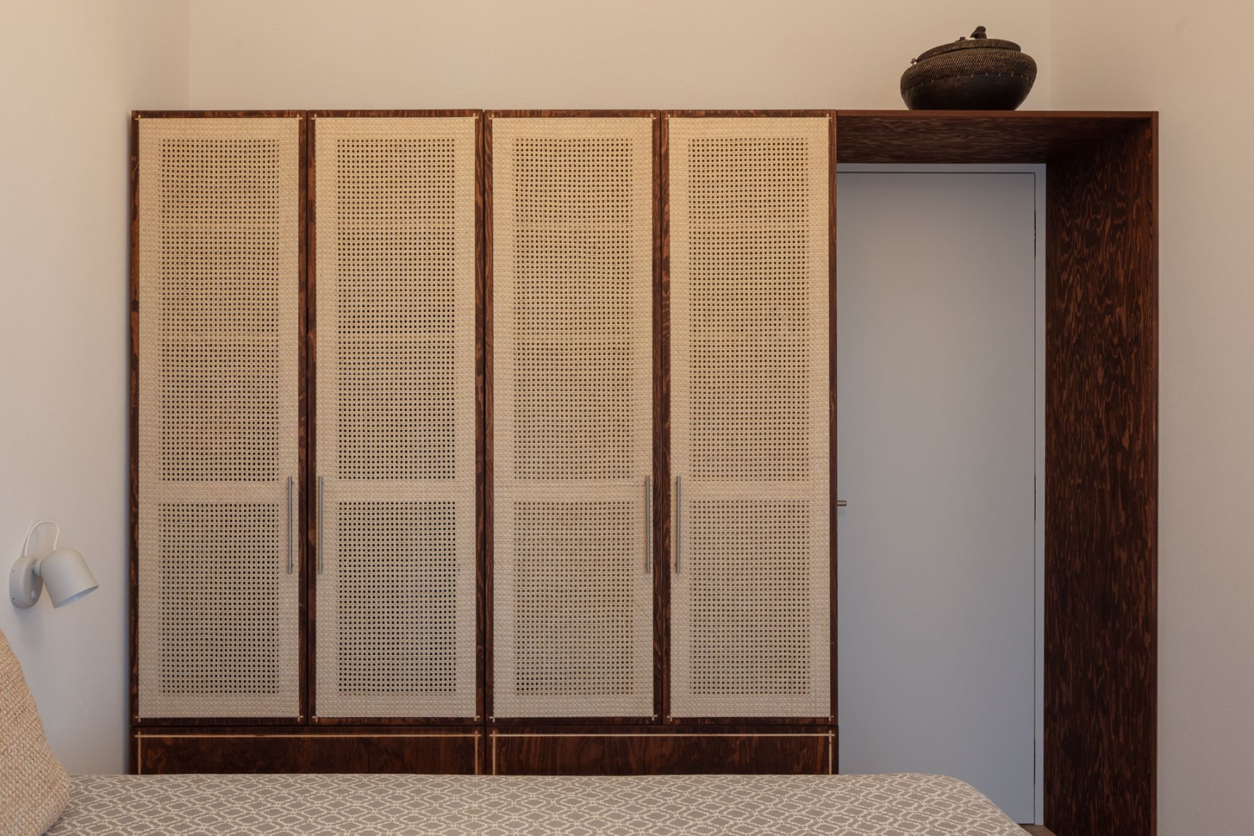 Kombinace borovicové překližky a přírodního ratanu.