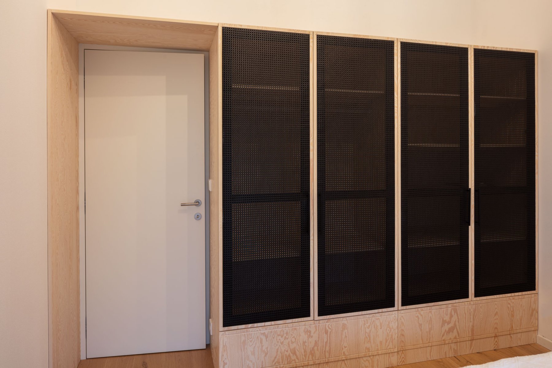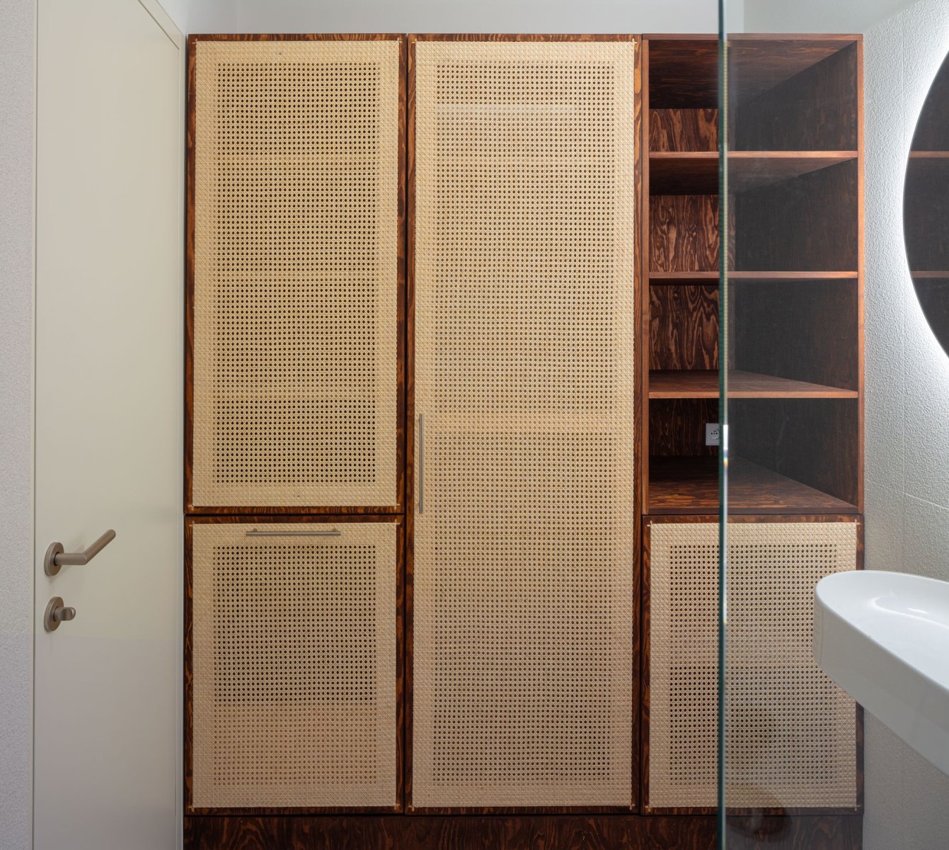 V rámci projektu „Dům se skleněnou stodolou“ dle architektonického návrhu studia DDAANN jsme realizovali kompletní zakázkový nábytek pro jednotlivé prostory domu, vždy s ohledem na architektonický koncept a propojení materiálů. Hlavním materiálem je borovicová překližka - bělená nebo mořená do tmavého odstínu a ratan.